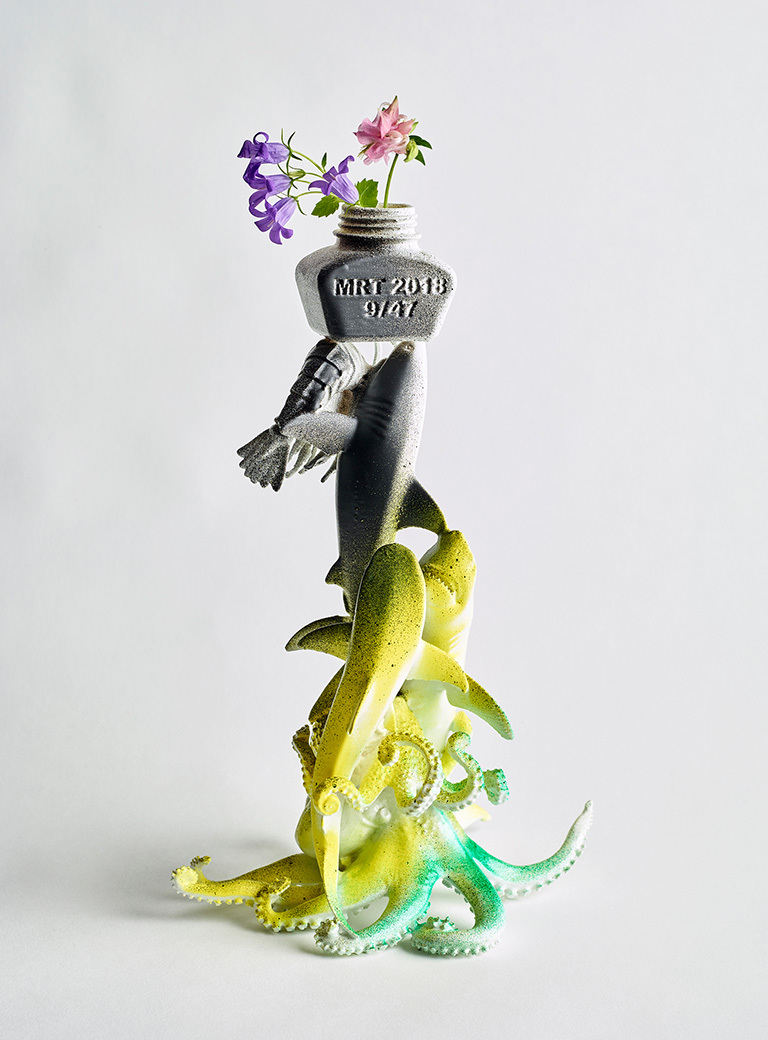 Die eigentliche Produktion erfolgte im 3D-Druckverfahren mit zwei unterschiedlichen Finishes und abschließender Lackierung in porzellanweiß. 3.000 Stunden Produktionszeit benötigt die Gesamtauflage. Ein von den Künstlern individuell vorgenommener Auftrag von Acryl-Sprühfarbe macht die Auflagenstücke zu Unikaten und einem Kunstwerk, das die Künstlerkollaboration widerspiegelt.
