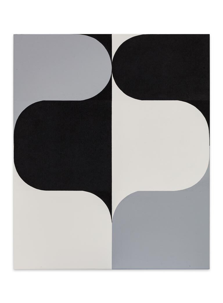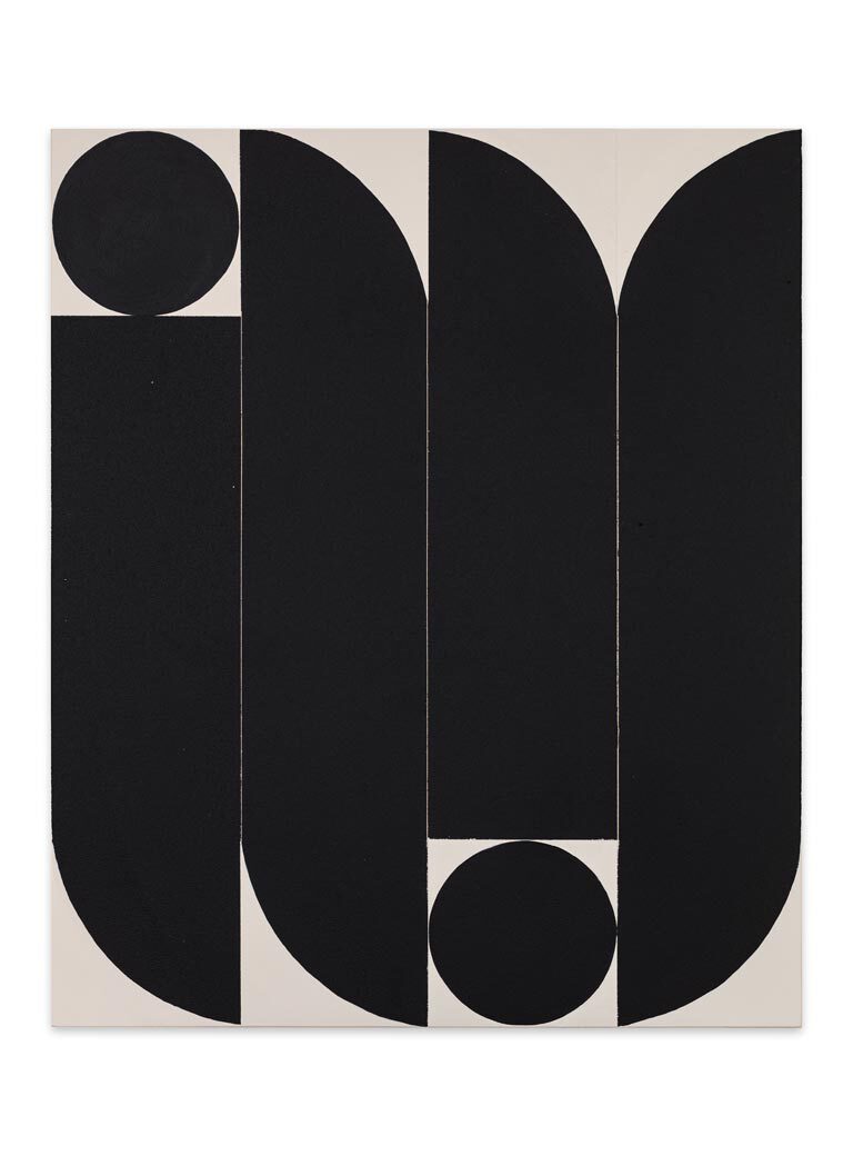 Mittlerweile arbeite ich sehr flächig in einer reduzierten, abstrakten Formensprache – teilweise Ton in Ton oder monochrom. Mitunter setze ich starke Kontraste mit Schwarz. Die Formen beeinflussen sich gegenseitig. Die Oberfläche ist mir sehr wichtig. Dabei stelle ich mir Fragen wie: Was gestalte ich matt, was glänzend? Wie verhalten sie sich die Flächen zueinander? Erkennt man den Untergrund, sieht man die Leinwandstruktur, oder ist er glatt?