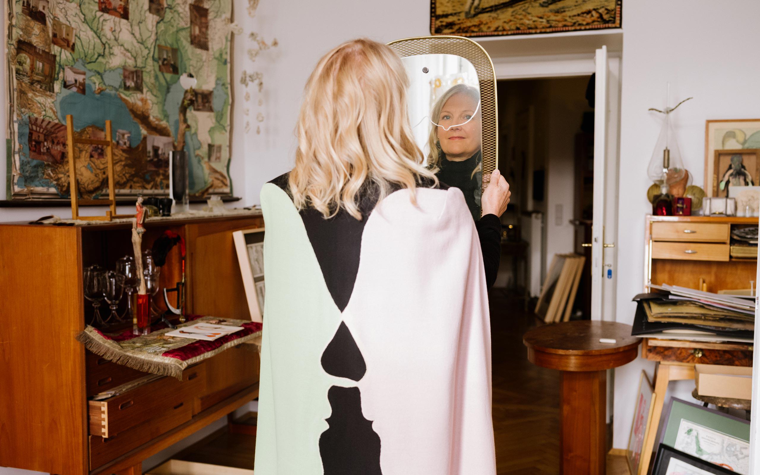 Ich habe mich für die Geschichte des Capes interessiert – bei der Geschichte setze ich überhaupt oft an, wenn ich arbeite. Mich interessiert immer die Recherche, die ist oft das Tollste an einem Projekt! Also habe ich über das Cape in der Geschichte ausgehend von der Antike bis zur Madonna und zum Heute recherchiert … Da geht es um Schutzmäntel, um Helden, um Capes als Zeichen der Macht, der Ermächtigung, des Schutzes. Auf der Basis meiner Zeichnung entwarf Helga dann das schöne Cape.