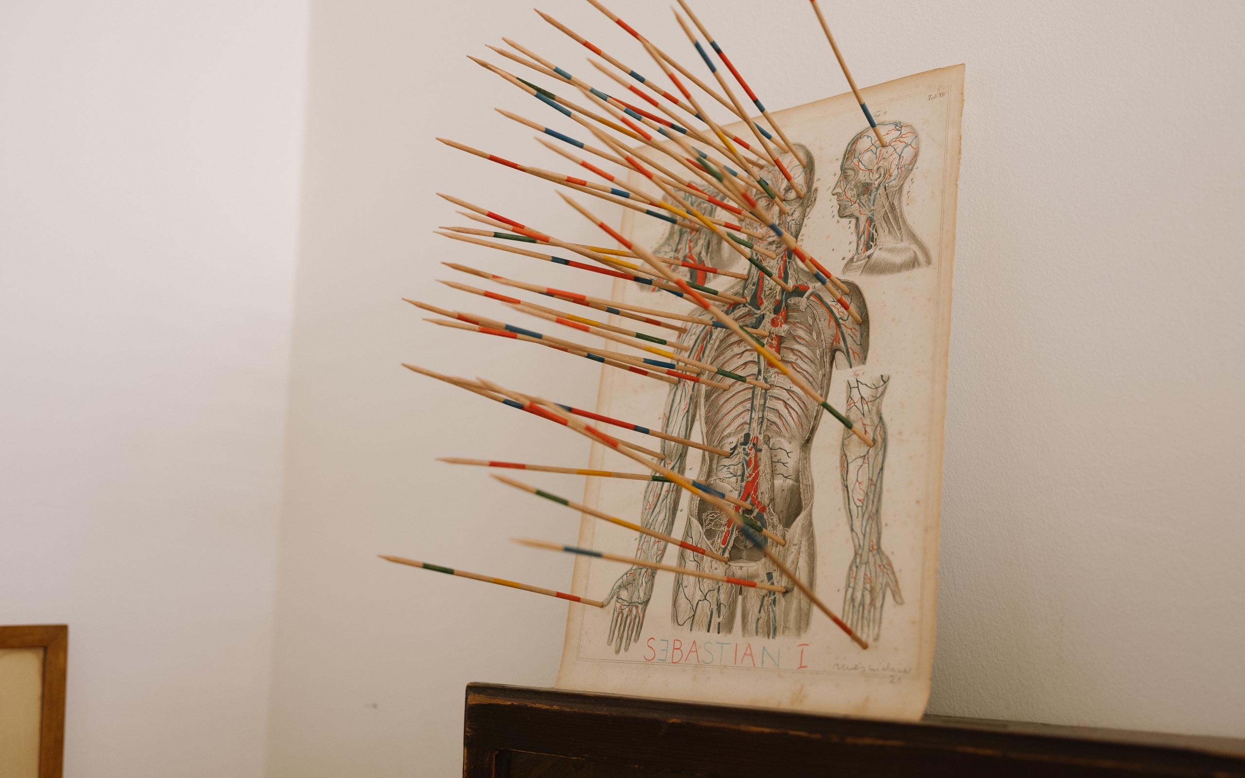 Ja, oft. Denn ich hatte diese anatomischen Karten ja schon lange, die hingen einfach da, und es war nie ganz klar, was damit wird. Und dann gehst du zum hundertsten Mal vorbei, nimmst sie in die Hand und weißt plötzlich, wie du es haben möchtest. So ein Prozess braucht jedoch Geduld, denn die Idee muss wachsen, eine innere Verbindung mit mir zeigen. Es ist eine Fügung: Wie eine Fuge, die ich schließen kann. Generell ist für mich ist das Haptische – das Machen – genauso wichtig wie das Intellektuelle – das Schreiben und Denken. Das Verbinden von Kopf, Hand und Herz ist das Essenzielle. Wenn all das in einem Werk zusammenkommt, habe ich die richtige Balance gefunden.