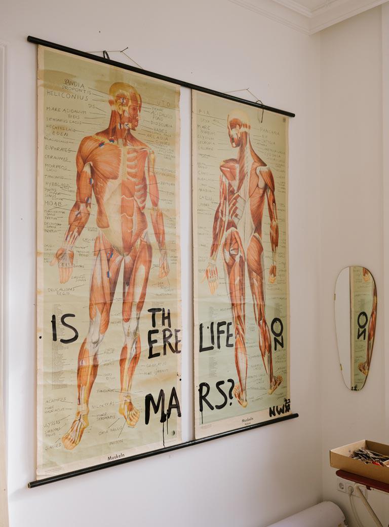 Es ist ein Prozess … Ich habe auch die Lockdowns genützt. Ich habe Arbeiten, für die ich lange recherchiert hatte und die ich immer schon umsetzen wollte, endlich realisiert. Zum Beispiel hatte ich irgendwann diese zwei fast lebensgroßen, anatomischen Karten mit der Abbildung des männlichen Muskelaufbaus in einem Antiquariat gefunden. Ebenfalls besitze ich seit Jahrzehnten einen Marsglobus. So ergab sich der Gedanke: In der Mythologie steht der Mars für den Mann. Daher schrieb ich alle geographischen Bezeichnungen von Mars über die originalen Muskelnamen auf der Karte. Der Titel der Arbeit lautet Is there life on Mars. Das ist nicht nur eine Anspielung auf den Song von David Bowie, der mir sehr wichtig war – damals hätte keiner daran gedacht, dass wir je auf den Mars fliegen würden – sondern auch eine Kritik daran, dass die Menschen plötzlich dorthin reisen wollen, anstatt die Probleme hier auf der Erde zu lösen.