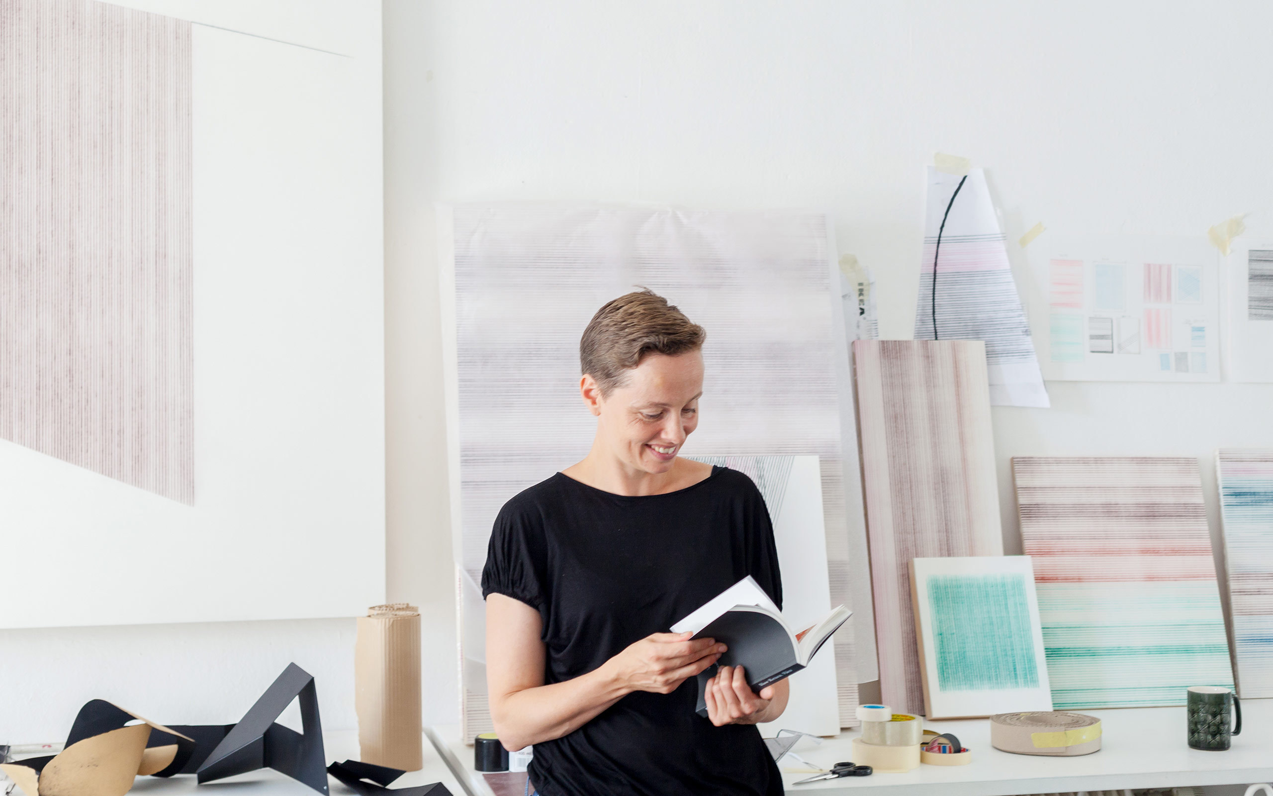 Nein. Eigentlich nicht. Ich habe zwar zu Hause einen Arbeitsplatz, von dem aus ich aber lediglich E-Mails beantworte oder Texte und Bilder bearbeite. Ich arbeite nicht ungern zu Hause, habe das früher auch öfter gemacht. Zur Zeit kommt es aber nur vor, wenn ich sehr konzentriert an einer Sache bleiben muss, so wie jetzt an dem Buchprojekt. Dann werde ich nicht von den anderen laufenden Projekten im Atelier abgelenkt. Hier im Atelier habe ich aber das ganze Lager, das Archiv und alle Unterlagen. Hier kann ich an großen Projekten arbeiten, ohne darauf achten zu müssen, dass ich auch Dreck und Staub produziere. Die Schlagschnur-Bilder, die ich gerade mache, das ginge zu Hause gar nicht, weil sich die losen Pigmente beim Arbeiten überall verteilen. Ich habe hier auch einen kleinen Archiv- und Büroraum, in dem ich am Computer sitze und Zeichnungen im kleineren Maßstab mache. Der flexiblere Raum ist dann der, in dem wir hier sitzen.