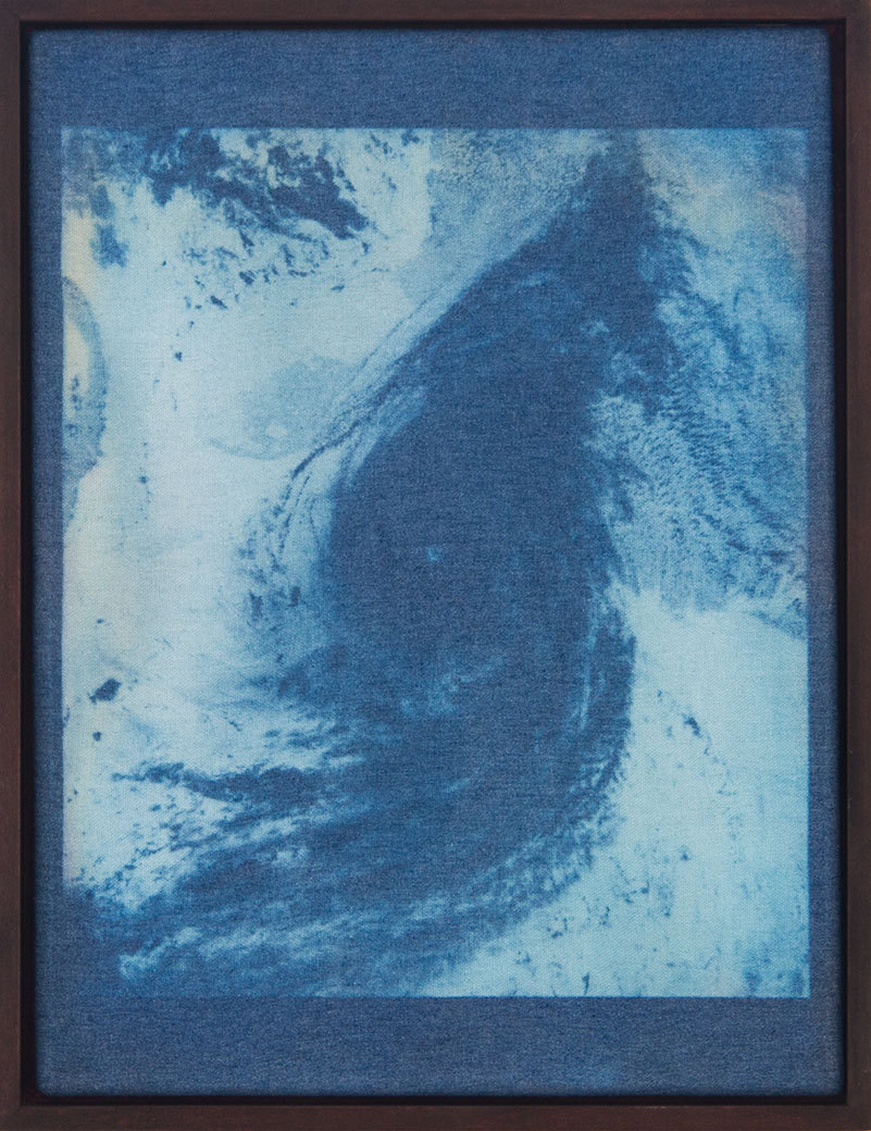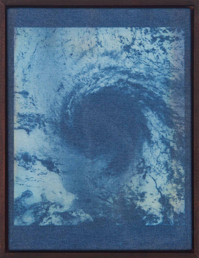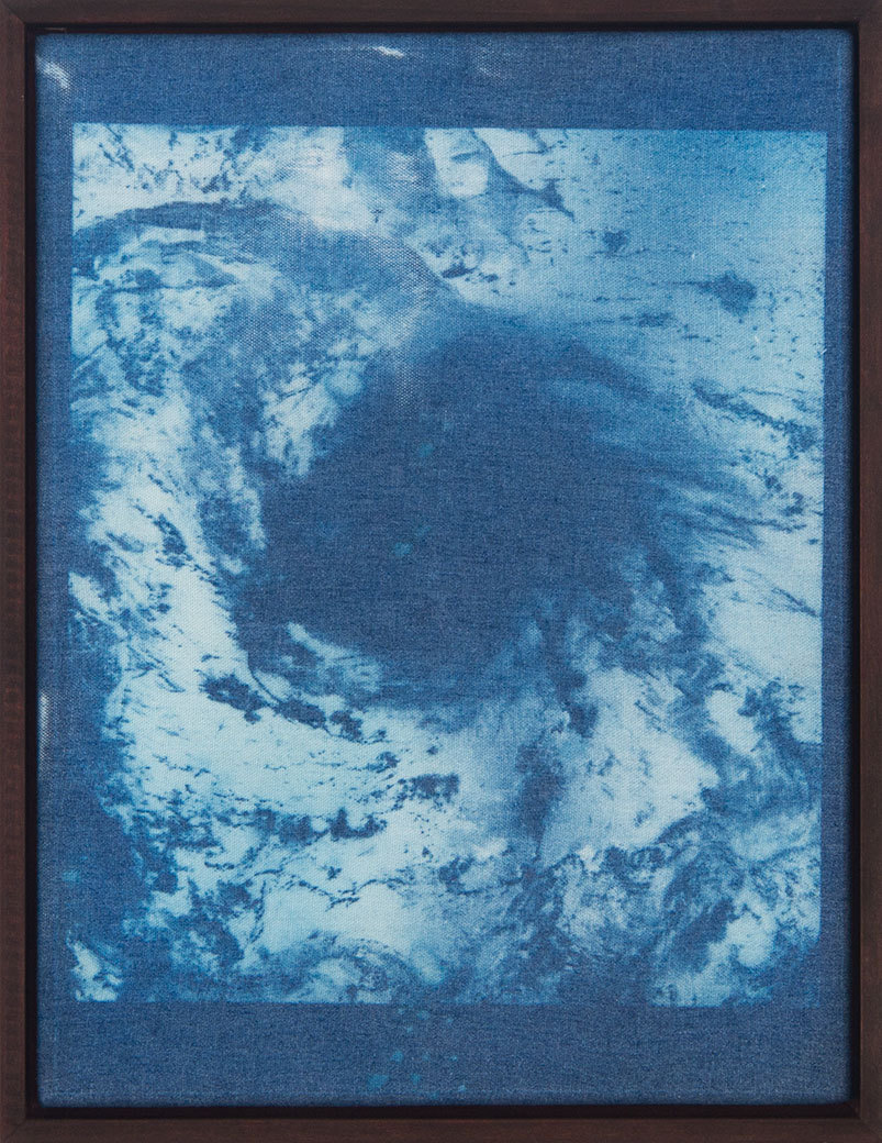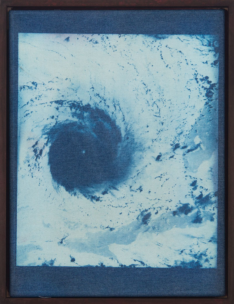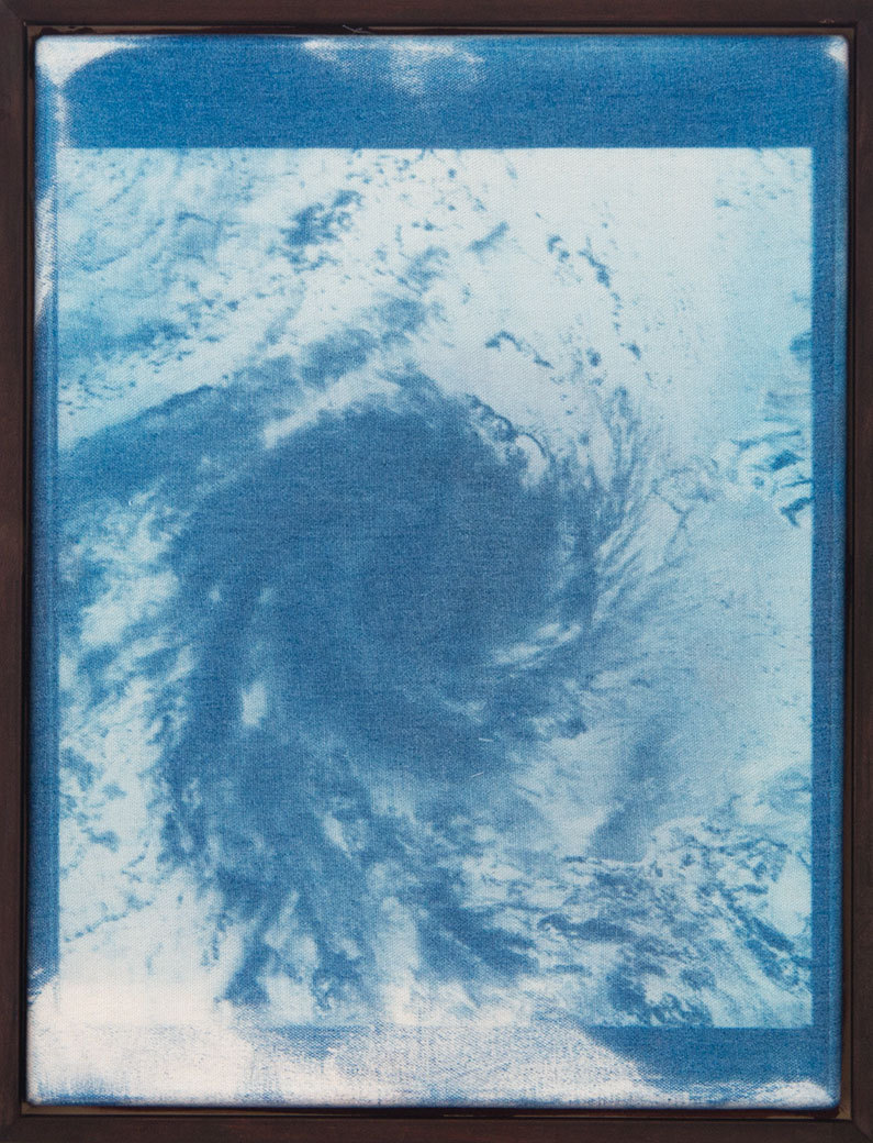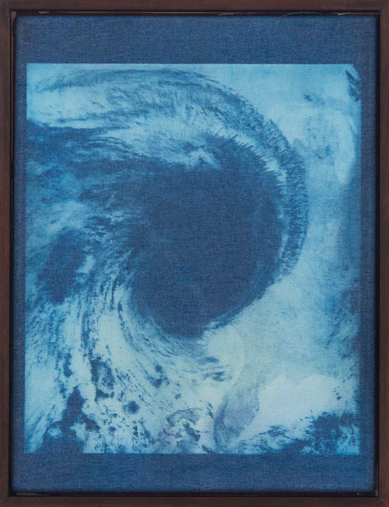 For his edition consisting of 15 unique pieces, Andreas Duscha uses photographs of hurricanes of the last thirty years. The photographs were exposed using the photographic technique of cyanotype, also known as iron blue printing, on a canvas previously photosensitized with a chemical solution.