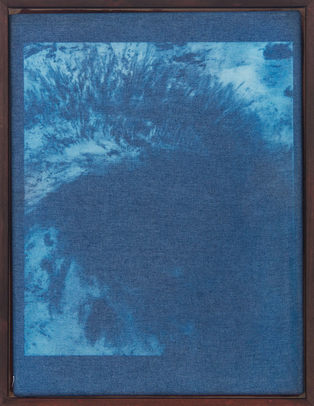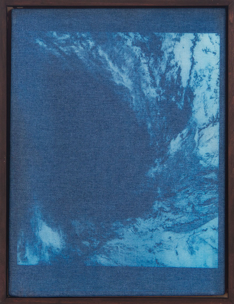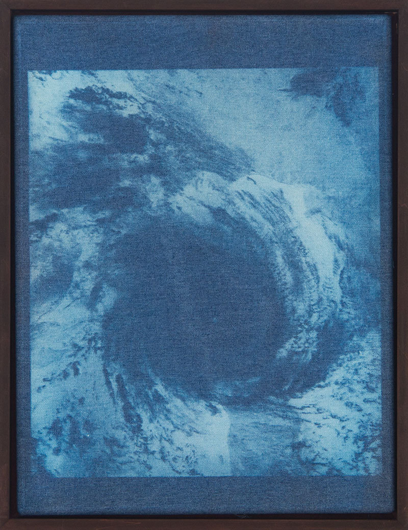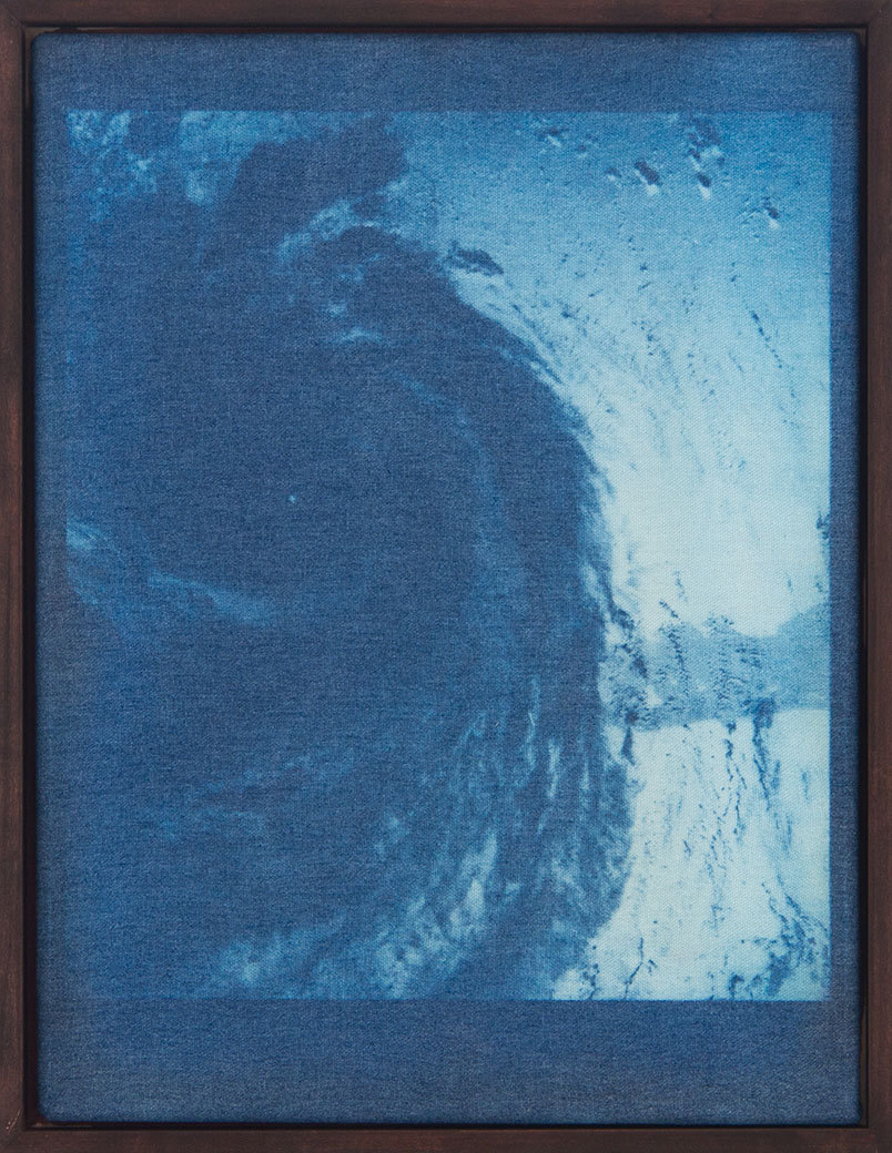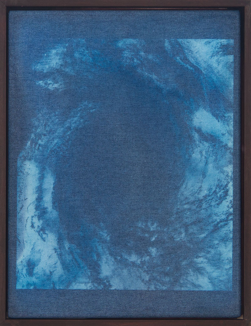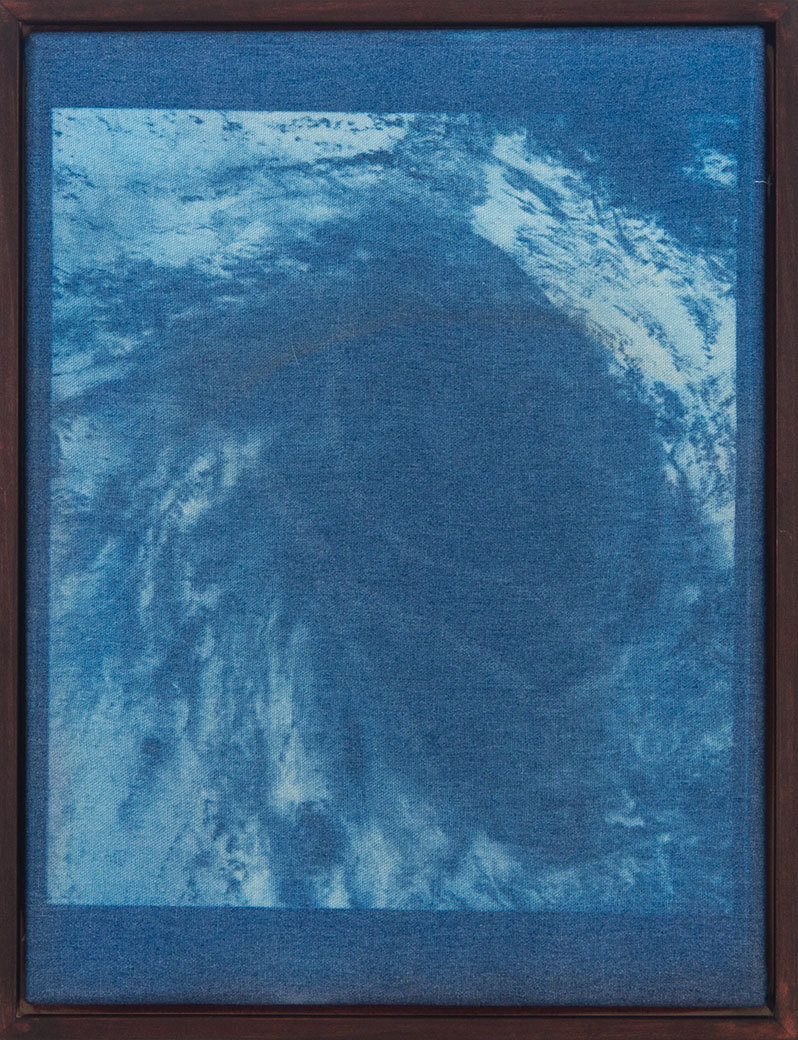 For his edition consisting of 15 unique pieces, Andreas Duscha uses photographs of hurricanes of the last thirty years. The photographs were exposed using the photographic technique of cyanotype, also known as iron blue printing, on a canvas previously photosensitized with a chemical solution.