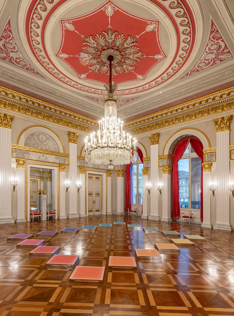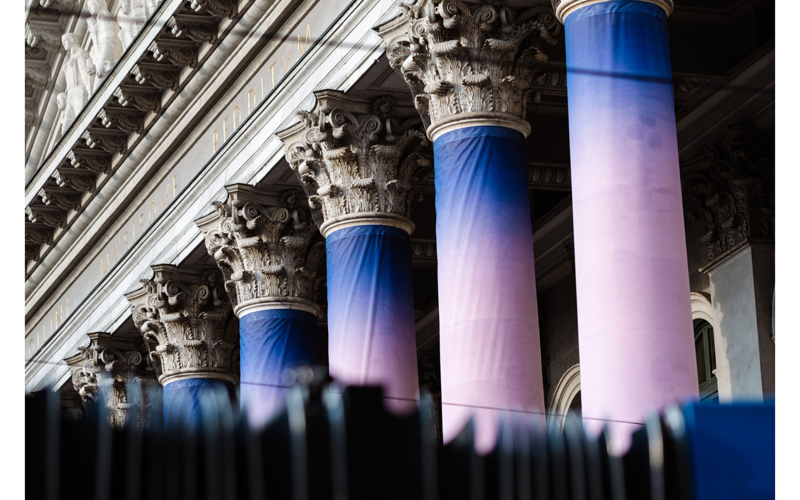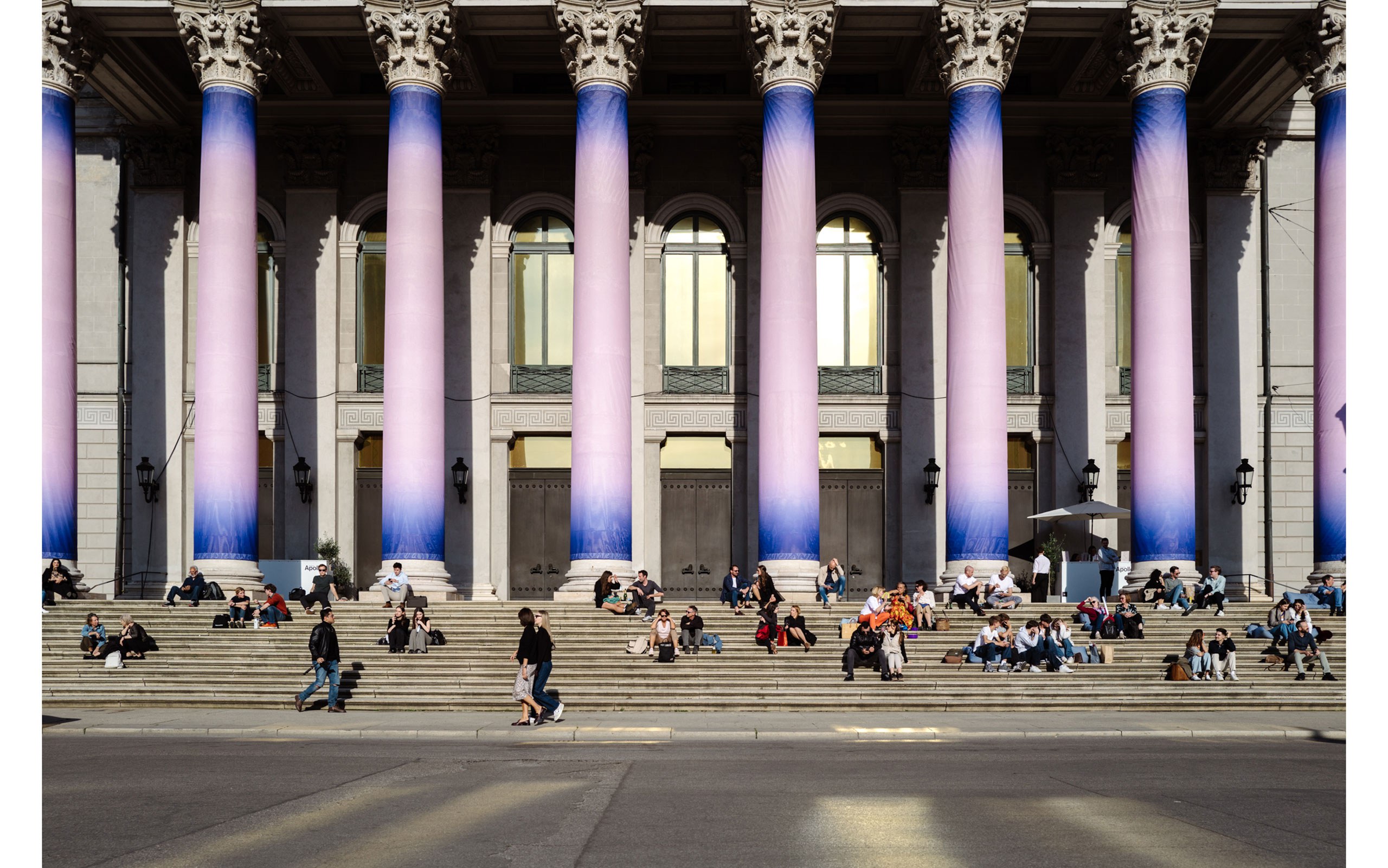 Jonny Niesche’s work has long drawn inspiration from fashion, cosmetics and music. On the occasion of the 2024 edition of the Munich Opera Festival, Jonny Niesche entered into a collaboration with the Bayerische Staatsoper, the festival’s operator, with a fulminant display of a series of his works at the Nationaltheater, the opera’s venue. The show extends to the public space, as the pillars of the classicist building are dressed with one of Niesche’s “portals”.