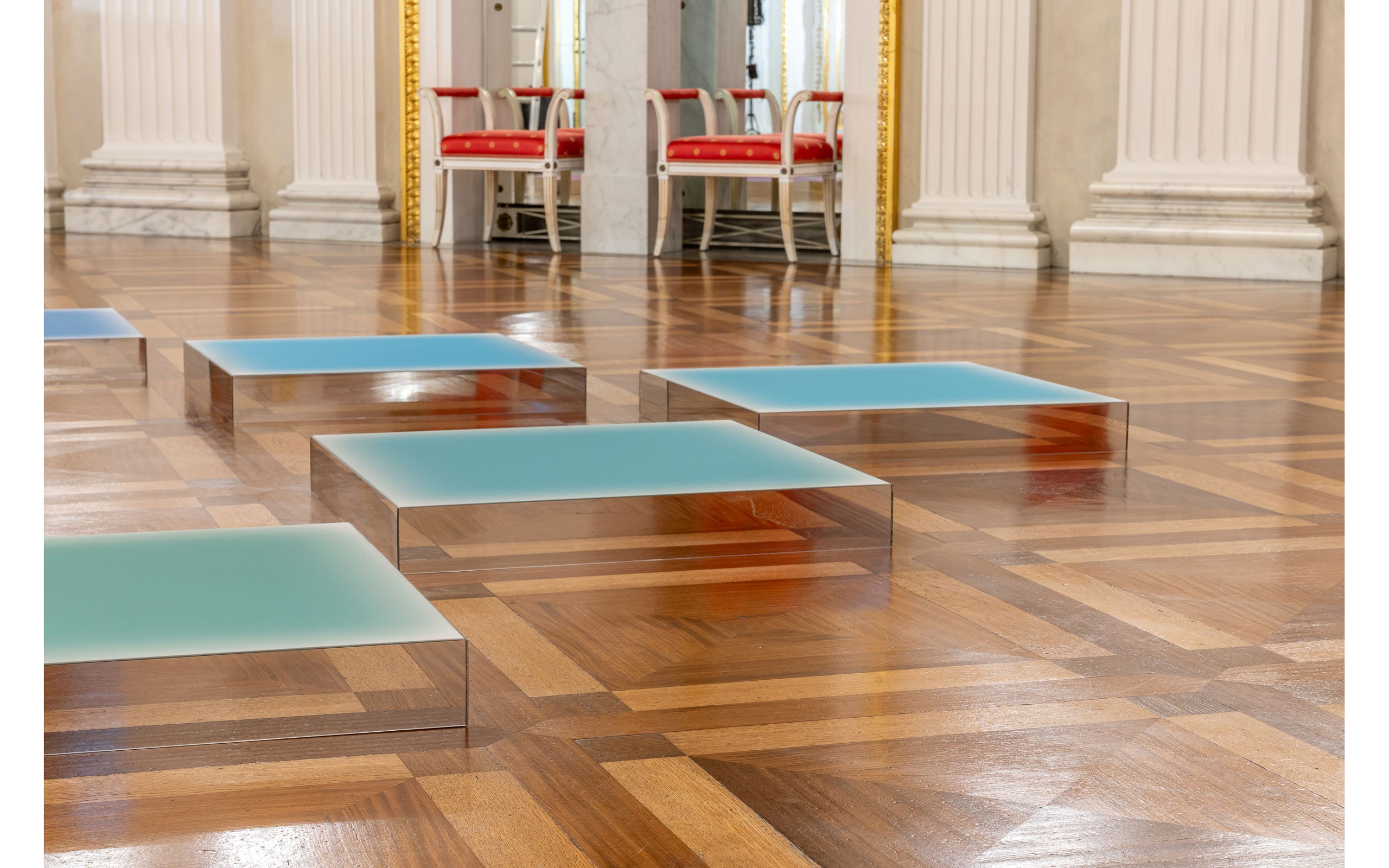 It was this alchemic quality of the process that intrigued Jonny Niesche to abandon his otherwise highly precise and controlled production process to see his work transformed into a new aesthetic experience. The aspects that usually create the seductive appeal of Jonny Niesche’s works, such as the moiré effect produced by the printed-on voile fabric or the self-reflection of the viewer in the shining surfaces, are giving way to new aesthetic qualities.