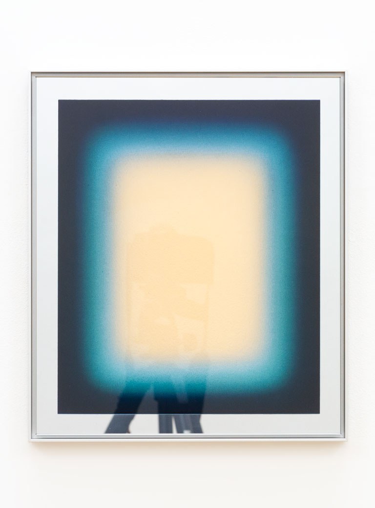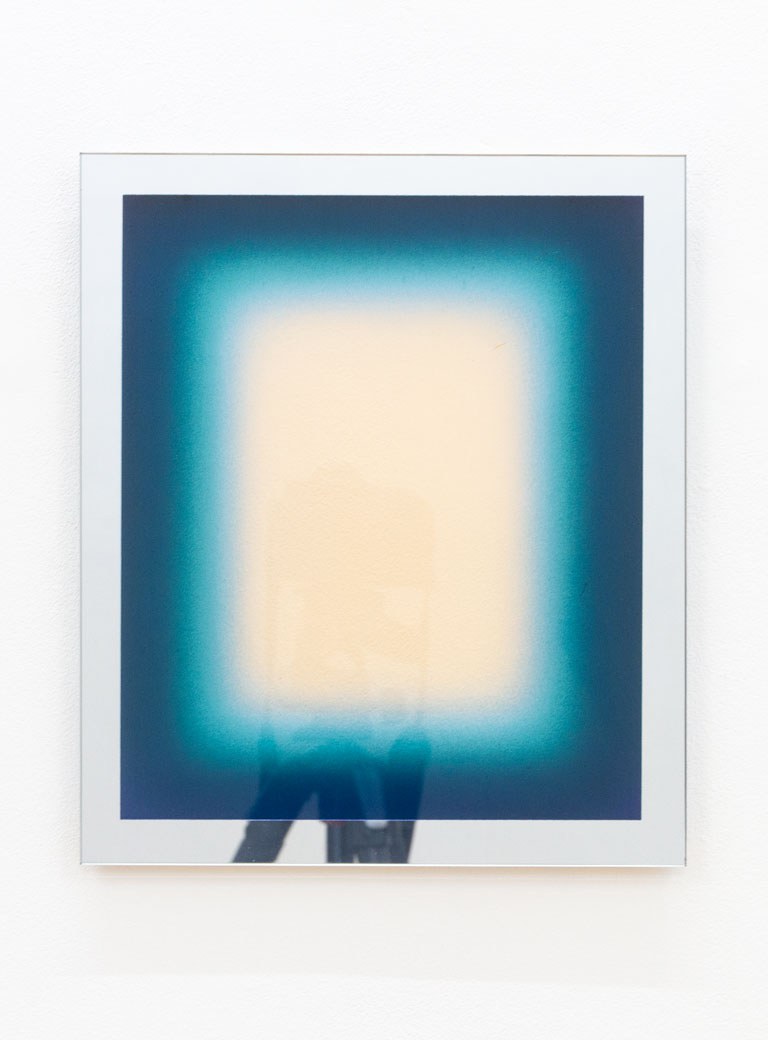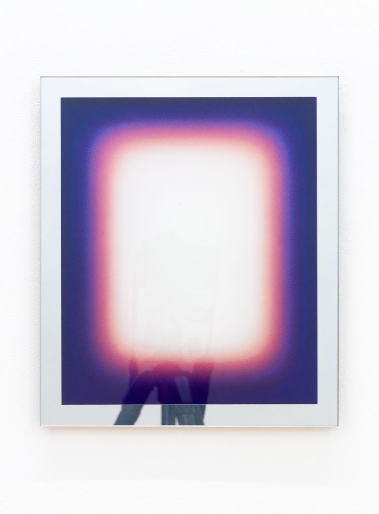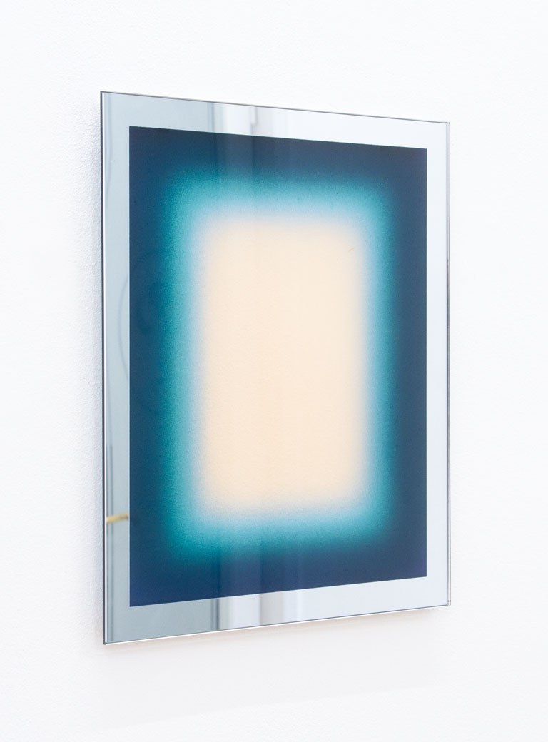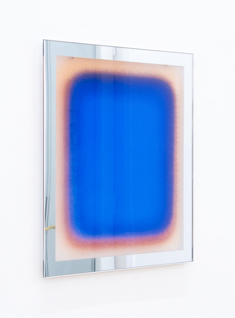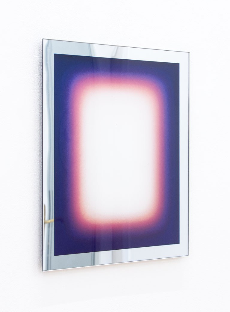 Where the silk-screen allowed pigments to pass, dots of colour stick to the glass surface, as if to offer a counter form to the printed-on grid-like mesh that Niesche usually employs. Silver paint applied to the back of the glass recreates the viewer’s image as in many of Niesche’s work. But for the first time, the viewer’s reflection occurs in real glass mirror, instead of polished steel or acryl.