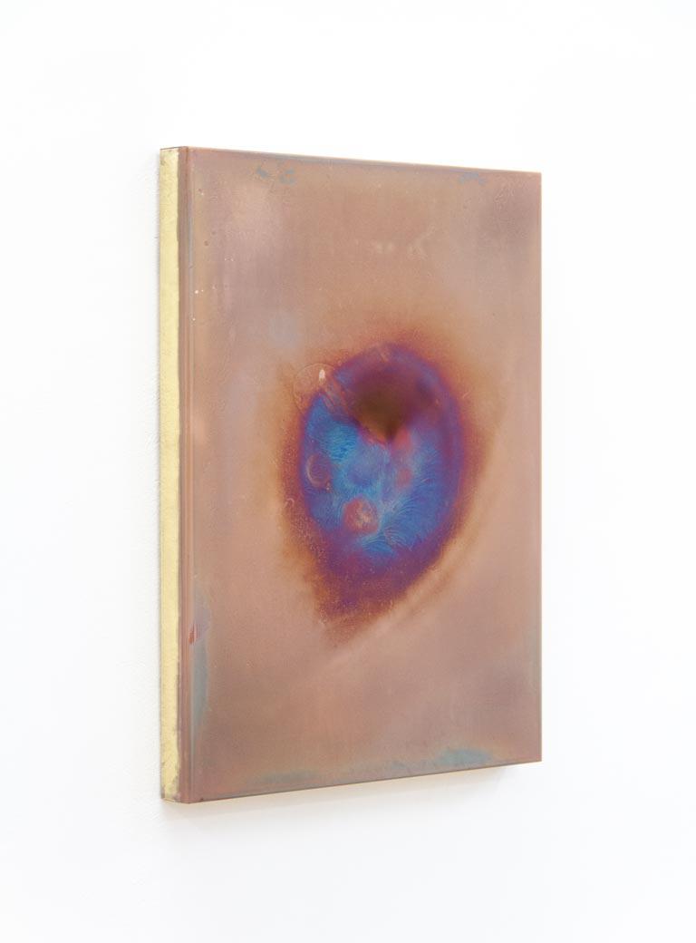 To create her iridescent series of works, titled full spectrum, Judith Fegerl coats brass plates with copper in an electroplating bath, unleashing a process that is difficult to control as it is driven mainly by the sun. The electrical energy required for the copper plating process is furnished directly by a number of solar panels installed at the artist's studio windows.