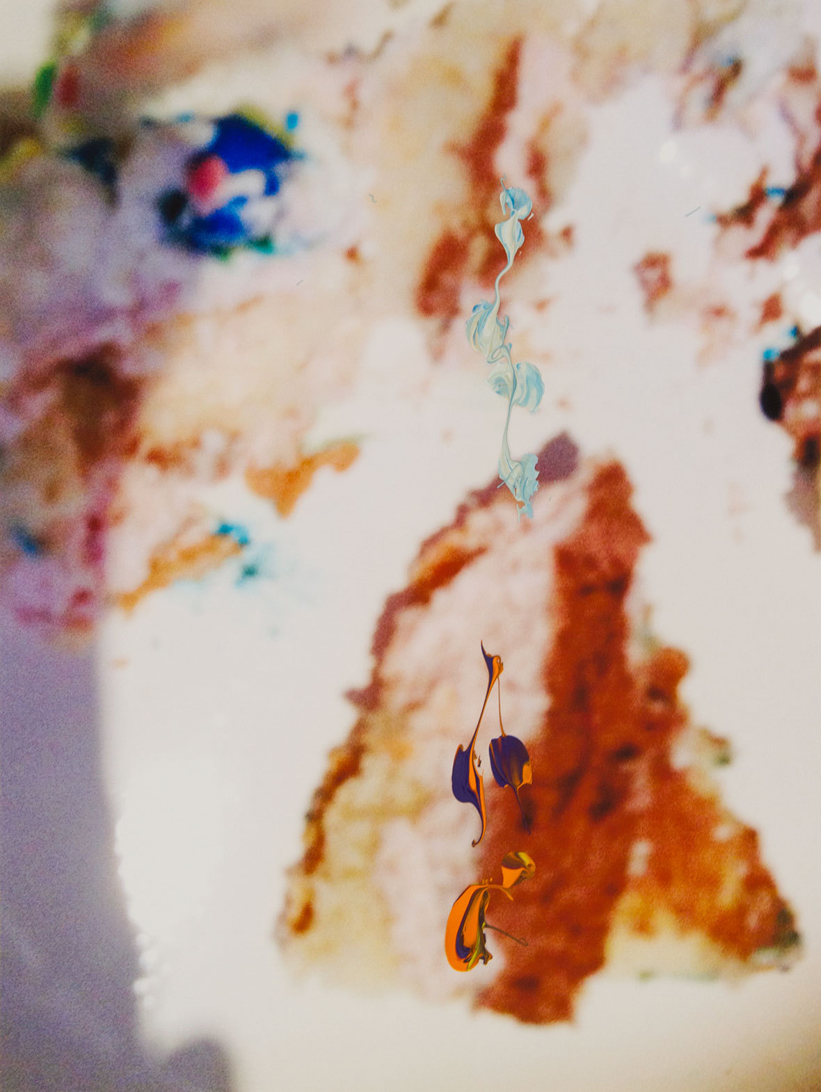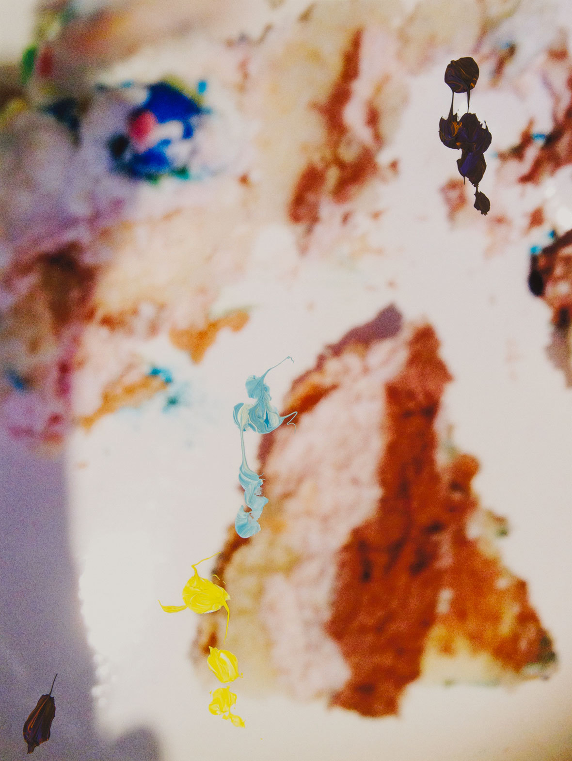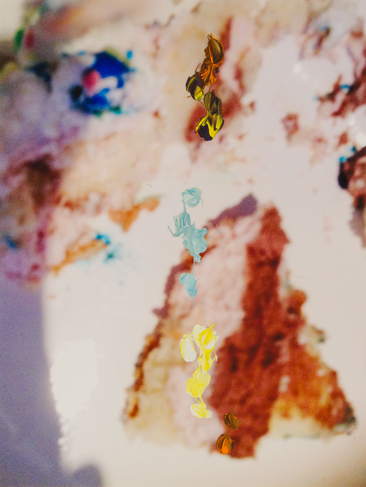 Lisa Holzer (born in Vienna, Austria in 1971) uses framed photographic prints to create playful compositions of image, text and material. Often using food as point of departure, her motifs are rendered formless and abstracted to develop a painterly quality. Juxtaposing image with fragments of personal text she conjures meanings and relationships which are not always defined. Adding to that, the artist applies materials such as dabs of acrylic paint or drops of polyurethane on the glass of the framed work, which she interprets as sweat, tears, or other substances secreted by her works. Lisa Holzer is busy with desire. By enforcing relationships among food, digestion, emotions and body, she explores what lies underneath today's increasingly glossy and easily consumable surfaces.