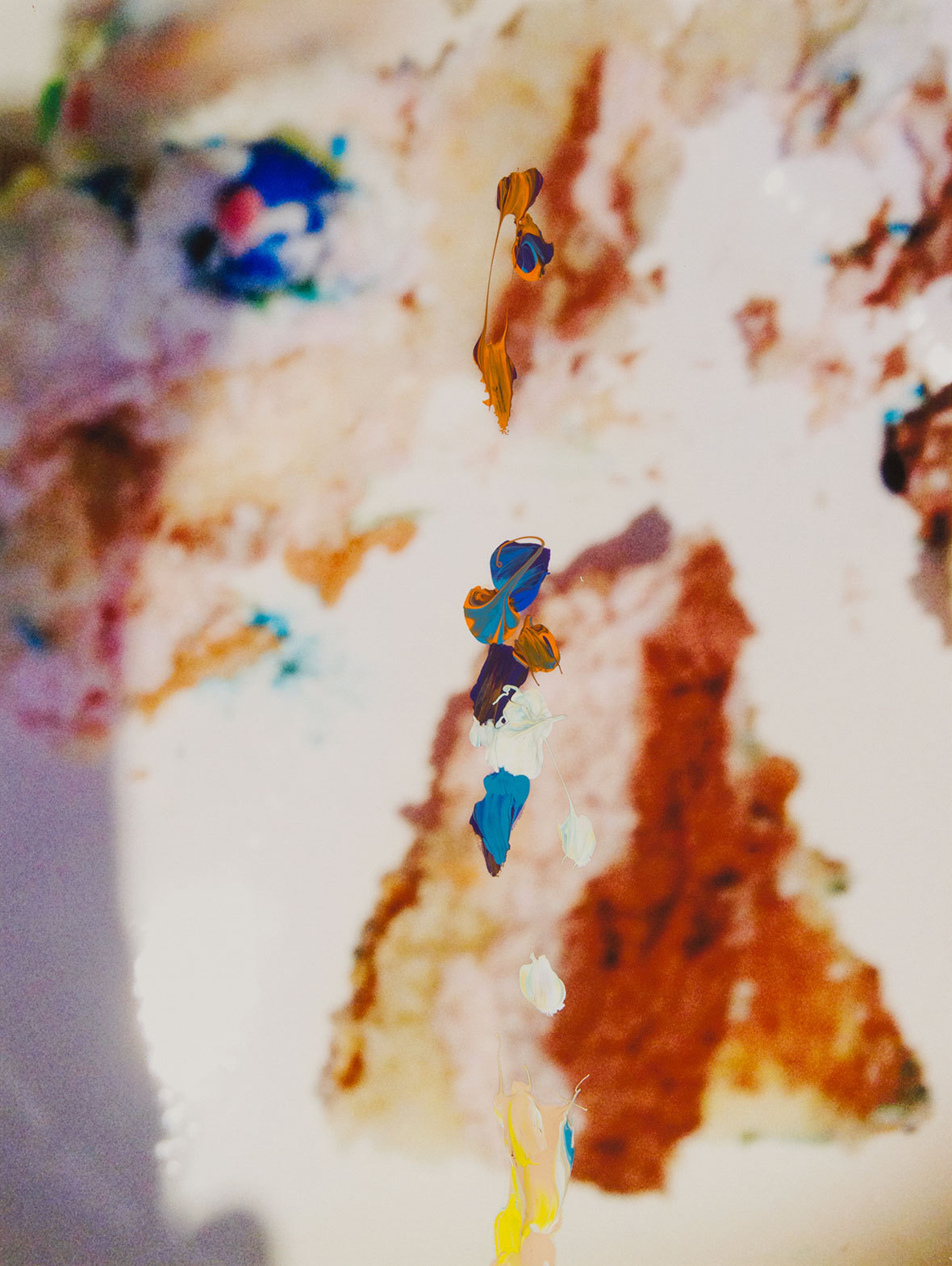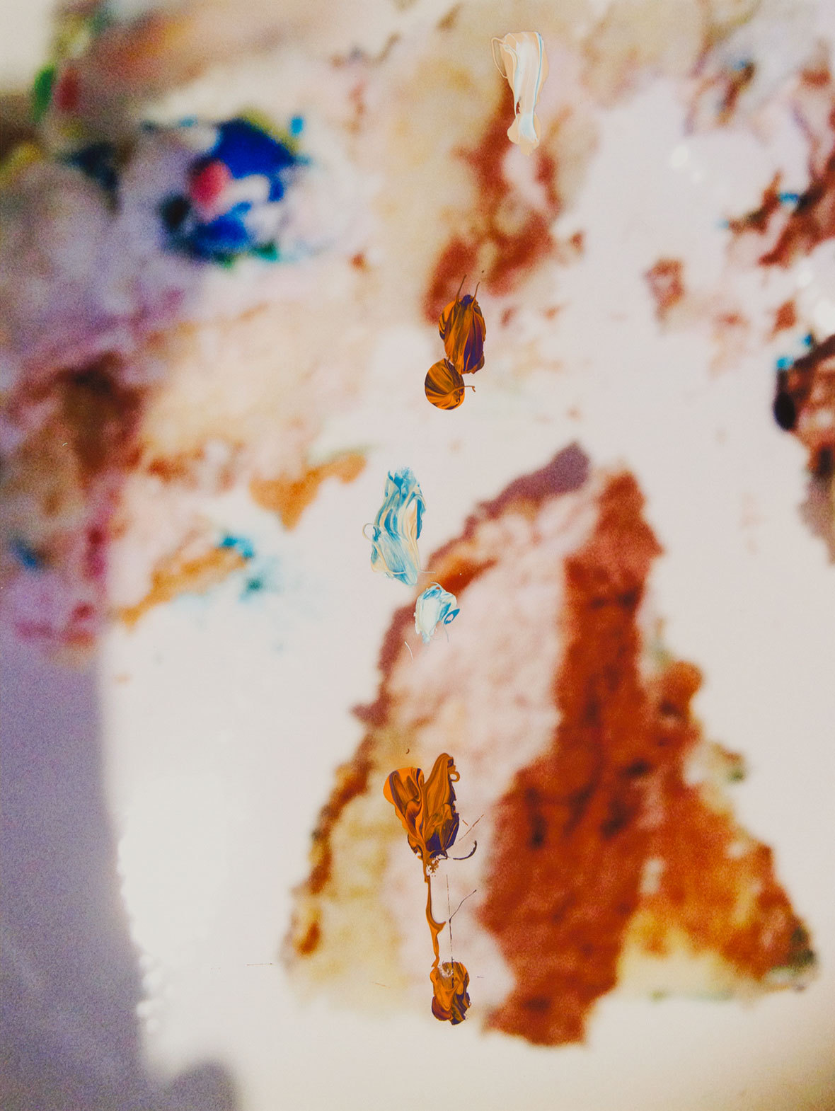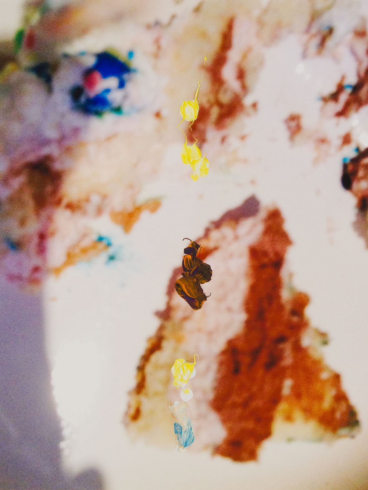 Lisa Holzer (born in Vienna, Austria in 1971) uses framed photographic prints to create playful compositions of image, text and material. Often using food as point of departure, her motifs are rendered formless and abstracted to develop a painterly quality. Juxtaposing image with fragments of personal text she conjures meanings and relationships which are not always defined. Adding to that, the artist applies materials such as dabs of acrylic paint or drops of polyurethane on the glass of the framed work, which she interprets as sweat, tears, or other substances secreted by her works. Lisa Holzer is busy with desire. By enforcing relationships among food, digestion, emotions and body, she explores what lies underneath today's increasingly glossy and easily consumable surfaces.