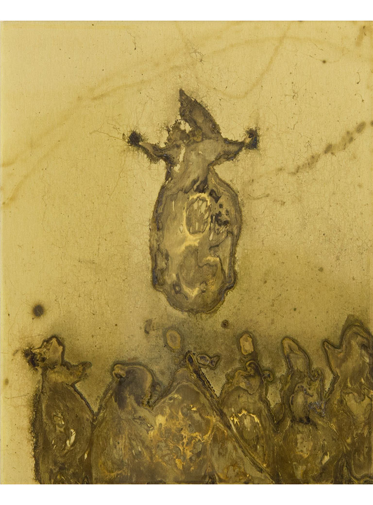 The work series depicts several mice and other small animals in their state of decay. As their dead body breaks down and ceases to exist they leave their “last presence”, and a painting reveals itself. Toni R. Toivonen's process is physical and may be regarded as grotesque or even macabre, but the trace seared into the brass plate creates an aesthetic image that is peaceful and dignified.