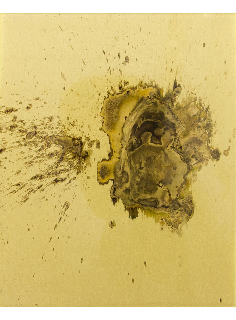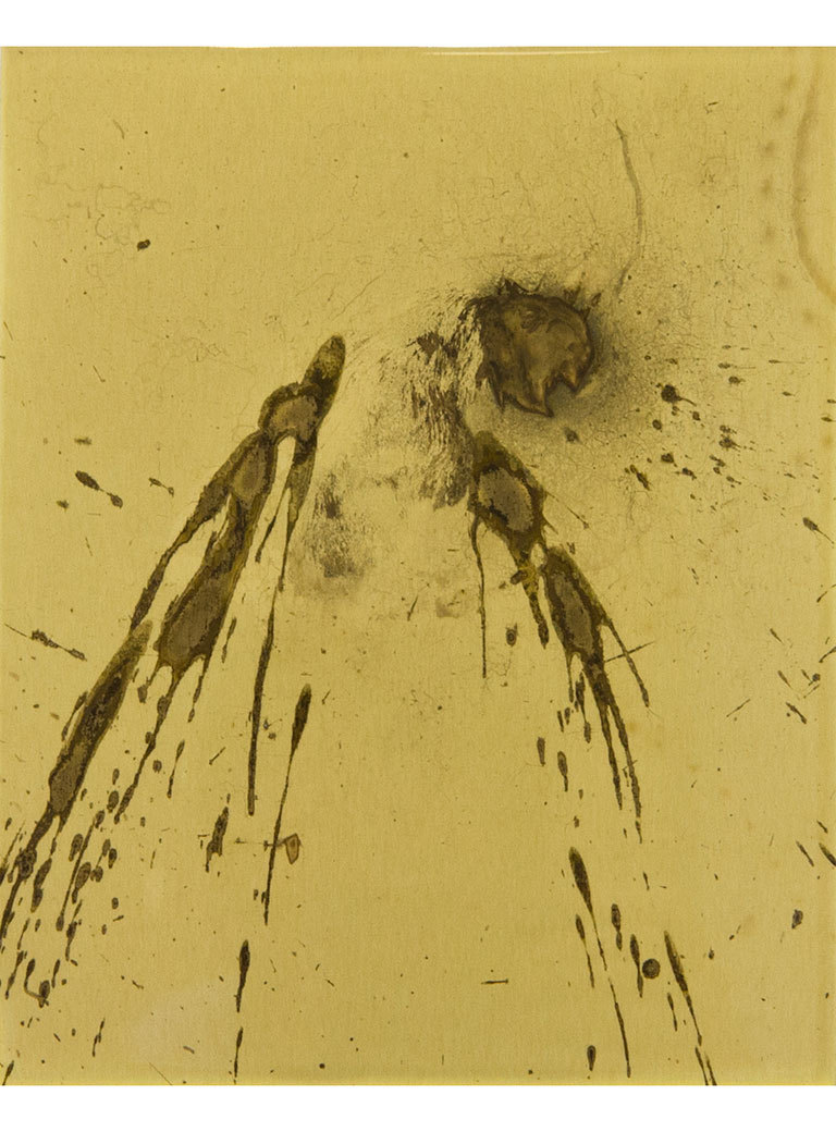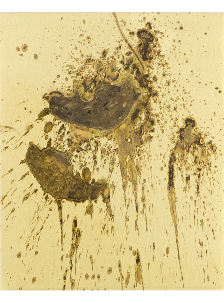 The artist's unusual approach may be discussed in different contexts. The chemical reaction on brass is reminiscent of early photography which works with gelatin silver prints. His work may also evoke a graphical approach involving the making of prints. And the highly bodily aspect that is linked to the production of the work and carried forward in the work itself suggests a sculptural approach.