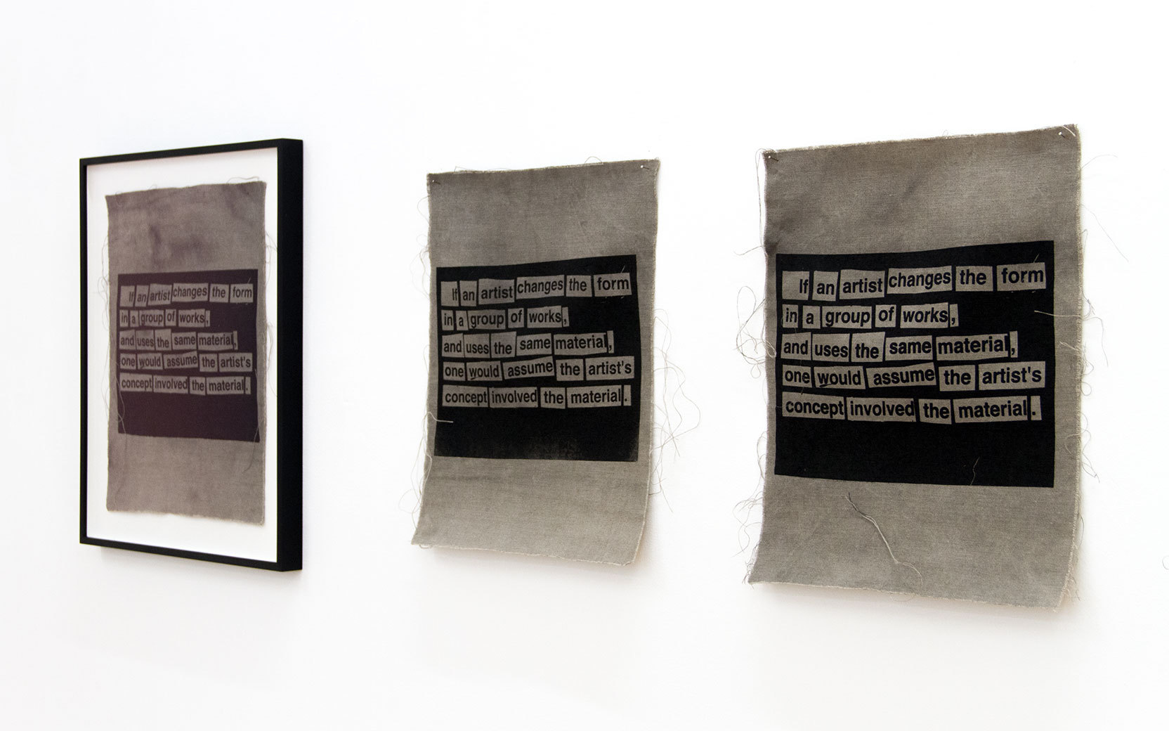 In cutting up Sol LeWitt’s sentence the artist rearranged the wording, with “form” and “material” switching position in the sentence structure. Now remodeled, the sentence concludes that, if the form is the variable in a series of works (no longer the material) the underlying concept must have nonetheless been rooted in the material.