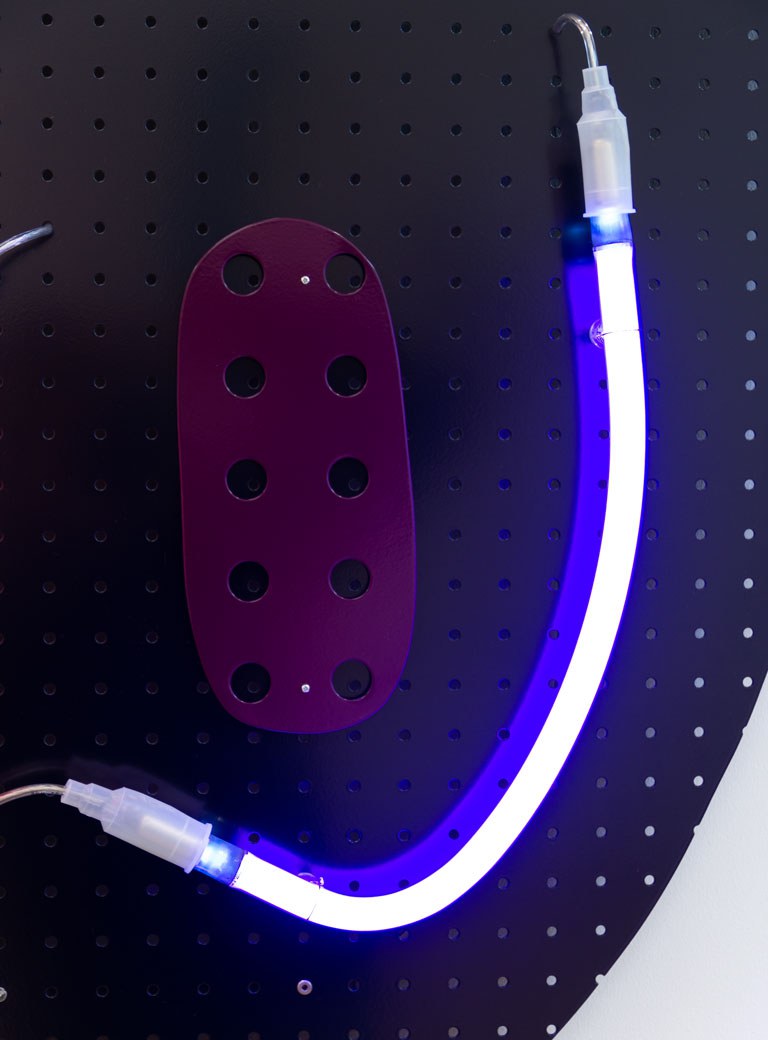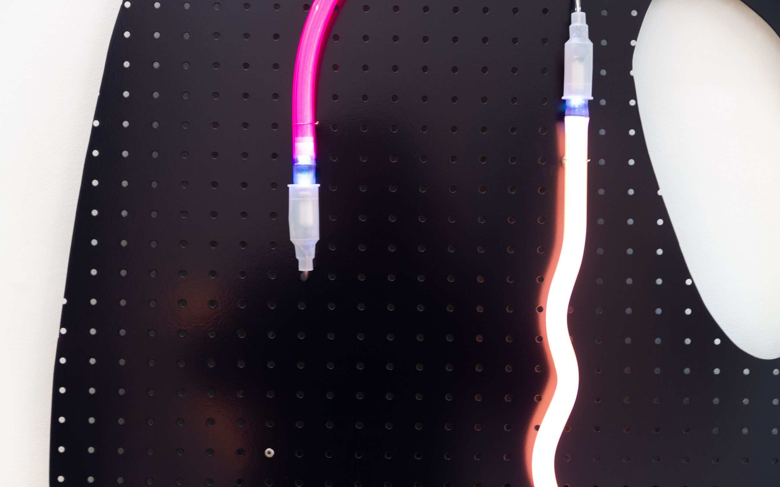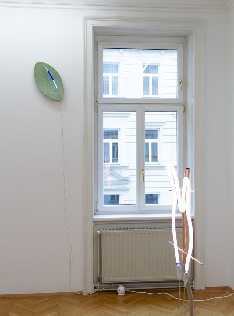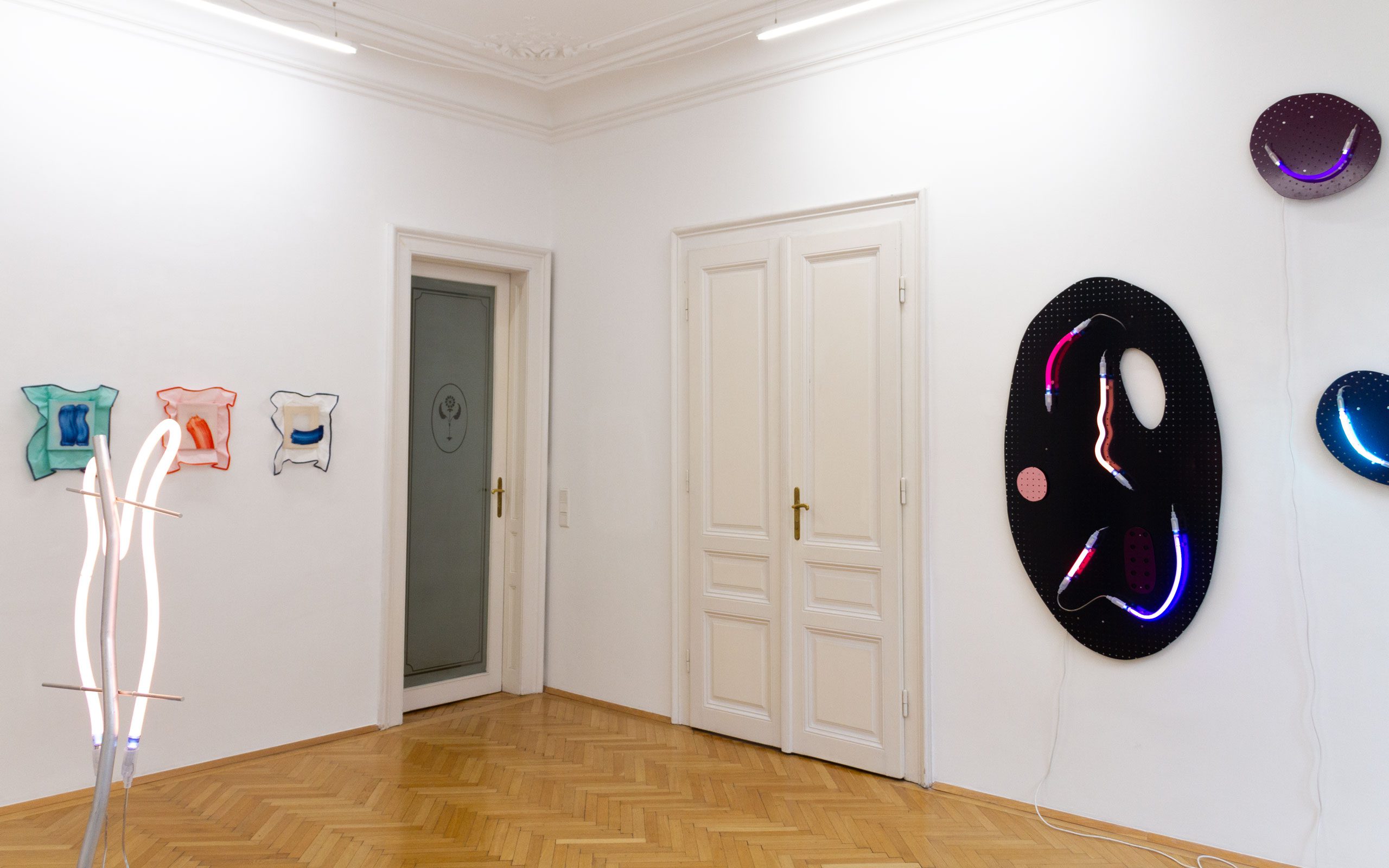 In response to the aesthetics arising from the subtle and the in-between, Raphaela Riepl also initially turns to the medium of drawing as the essential starting point. A newly created series of wall works, Assorted Flavors, consisting of four neon objects that glow on organically shaped panels, can be seen in the room as a representative example of this. The small-format works are further contextualised by the larger work al Lampone. Through the carefully chosen colour composition, the artist creates an ethereal effect in the works, which becomes even more impressive in the dark. While the gestural drawing remains recognizable in its sharp outlines during daylight, the works undergo a transformation in darkness. The drawn form extends beyond the platform, establishing a fluid, immaterial connection with the space and surrounding works. The sculpture, Tactile Memories (Friend 1)placed in the middle of the space seems to entertain a special relationship with Good Flirt by Charlotte Klobassa.