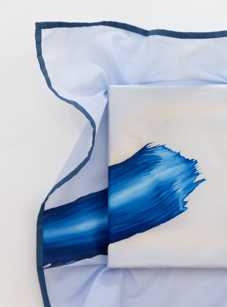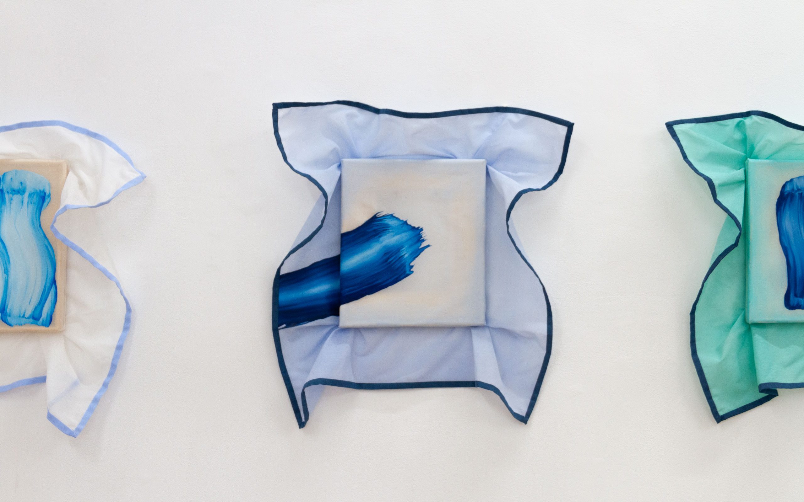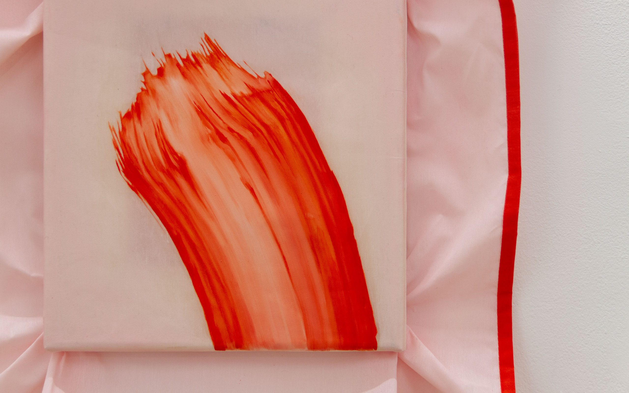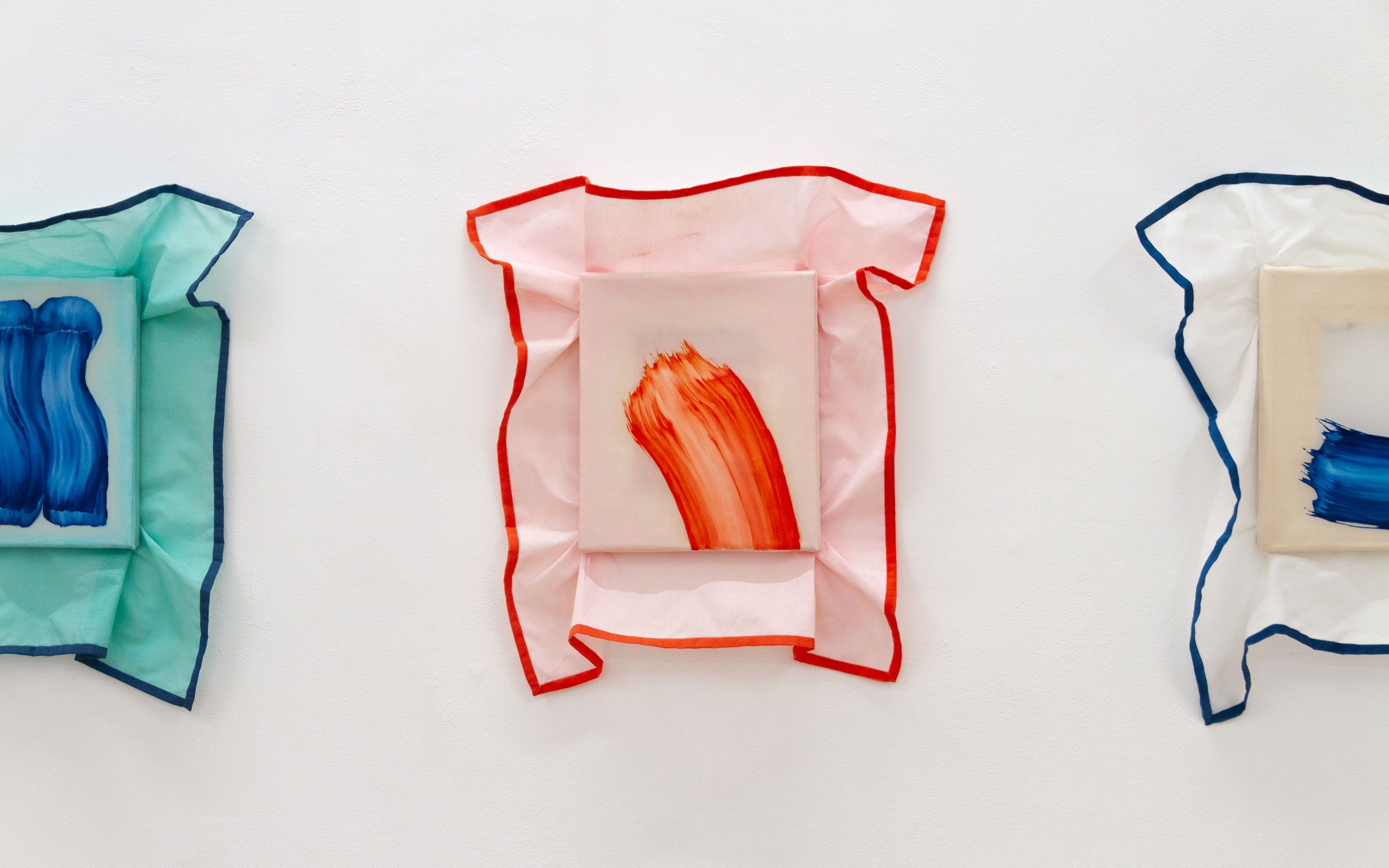 In the space a new small-scale painting series by Charlotte Klobassa, titled Signature Moves, can be found. The paintings feature reproductions of “Scribbles” as they have become characteristic of the artist. However, this time, instead of canvas, she chooses a silky fabric that provides for a milky, semi-transparent background, extending beyond the limits of the frame, thereby expanding the gestural brushstroke. In accordance with her established approach, Klobassa also varies and adapts her characteristic forms regarding colour and composition, establishing subtle connections between individual works. Another work, Good Flirt, that combines further typical gestures and elements from the artist's formal language, is present in the exhibition space.