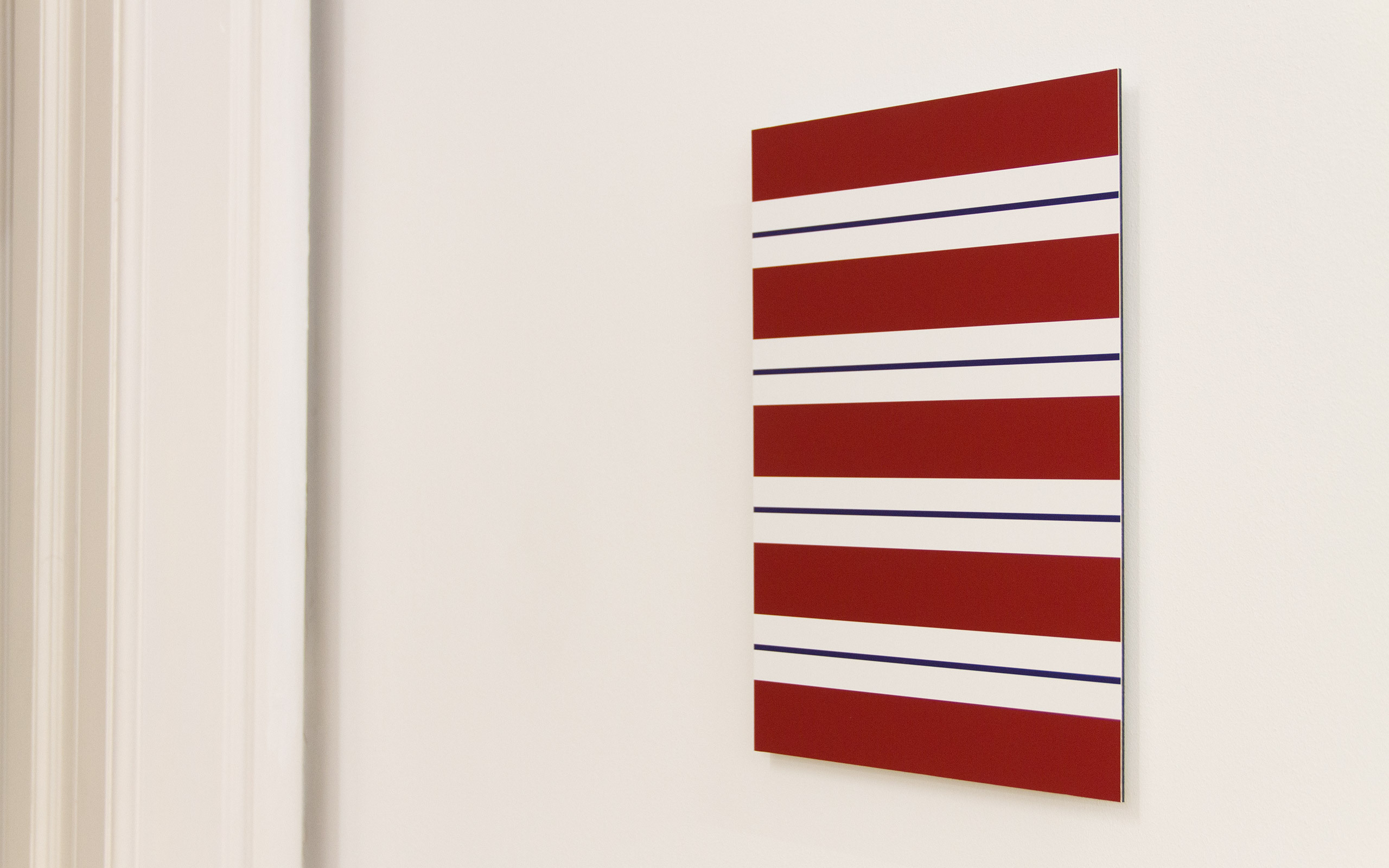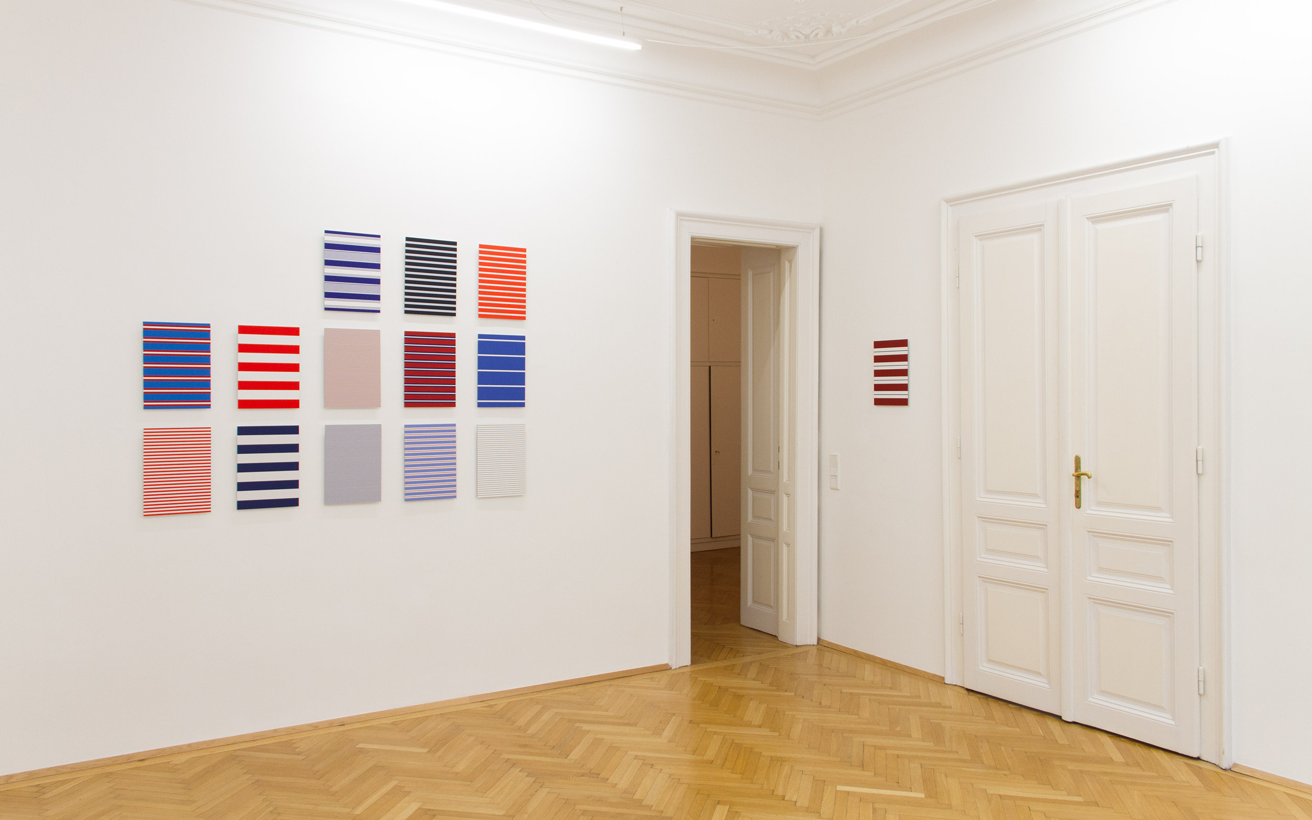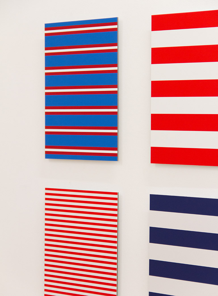 In his show No Stars, But Stripes Jacob Dahlgren proposes alternative formal expressions of the American Flag, as if the national symbol had to be re-invented and stitched up again by Betsy Ross. The physical show at Franz-Josefs-Kai was preceded by a digital performance on Jacob Dahlgren’s Instagram feed – from 9 until 22 April, 2018 –, for which the artist wore a different T-shirt every day.