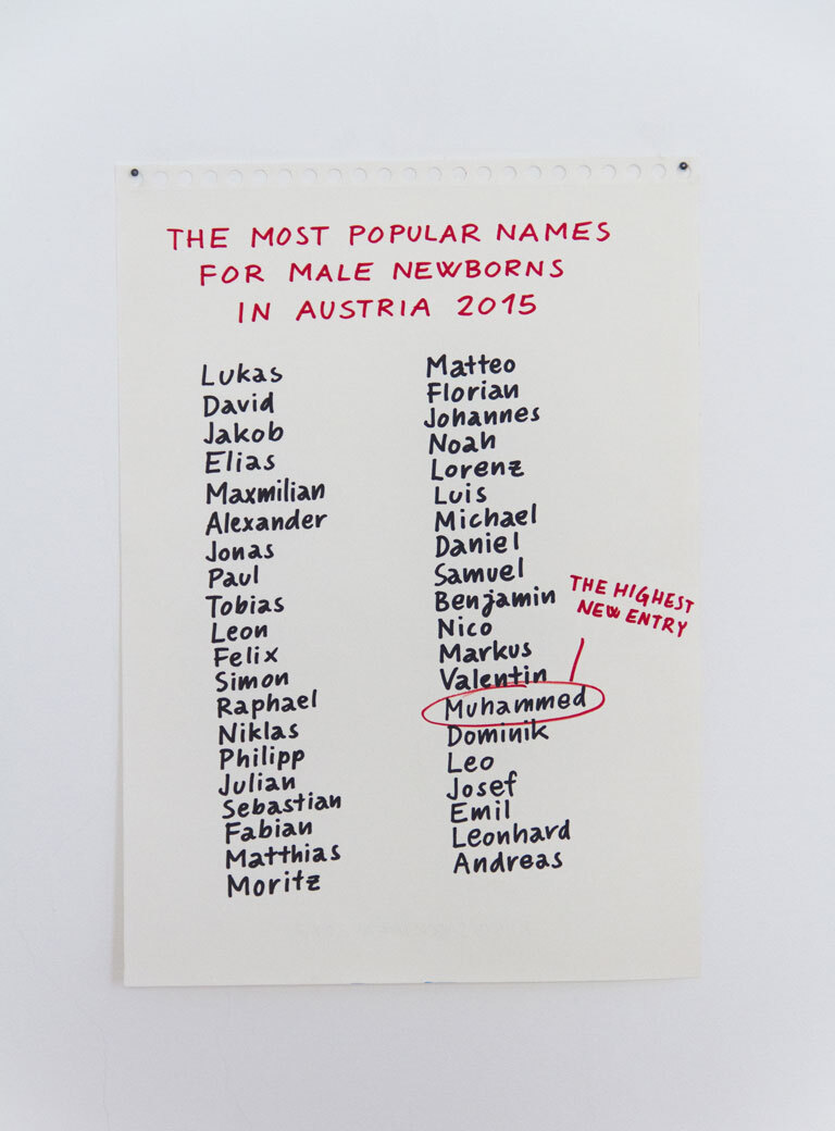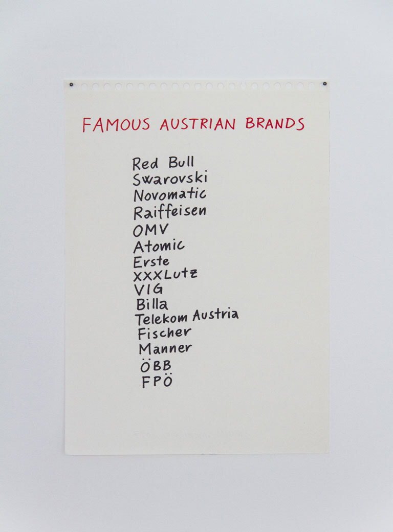 Idiosyncratic lists, often referred to by the artist as My Favorites, form another important part of Sakkinen’s oeuvre. Several lists, created specifically for the show, introduce concepts such as change, denial, and identity utilizing statistical facts and trivia extracted from an Austrian context. The series of lists is complemented by a single drawing, Immigrant im Hemd, a play on “Mohr im Hemd”, an utterly politically incorrect term that persists as the name of