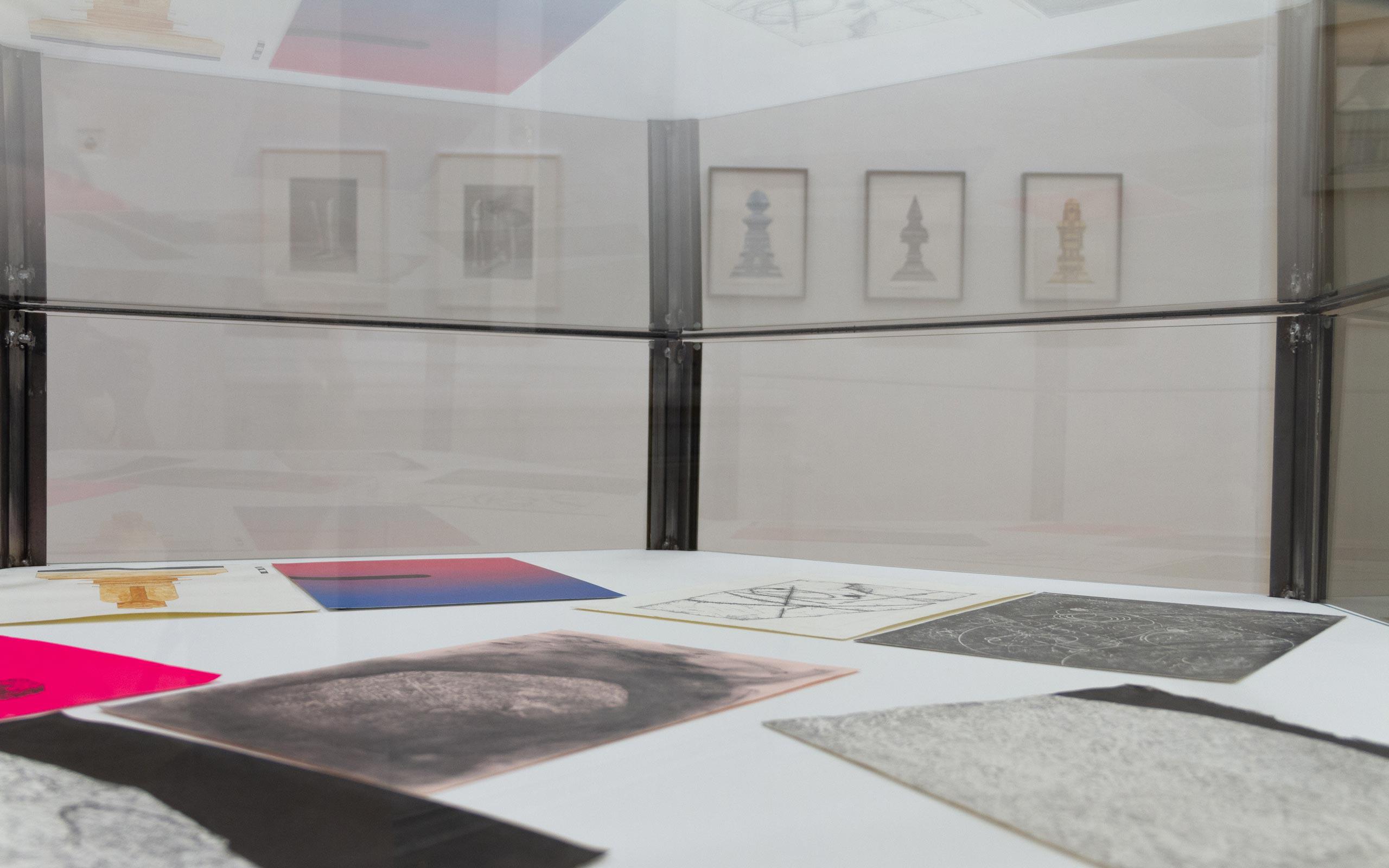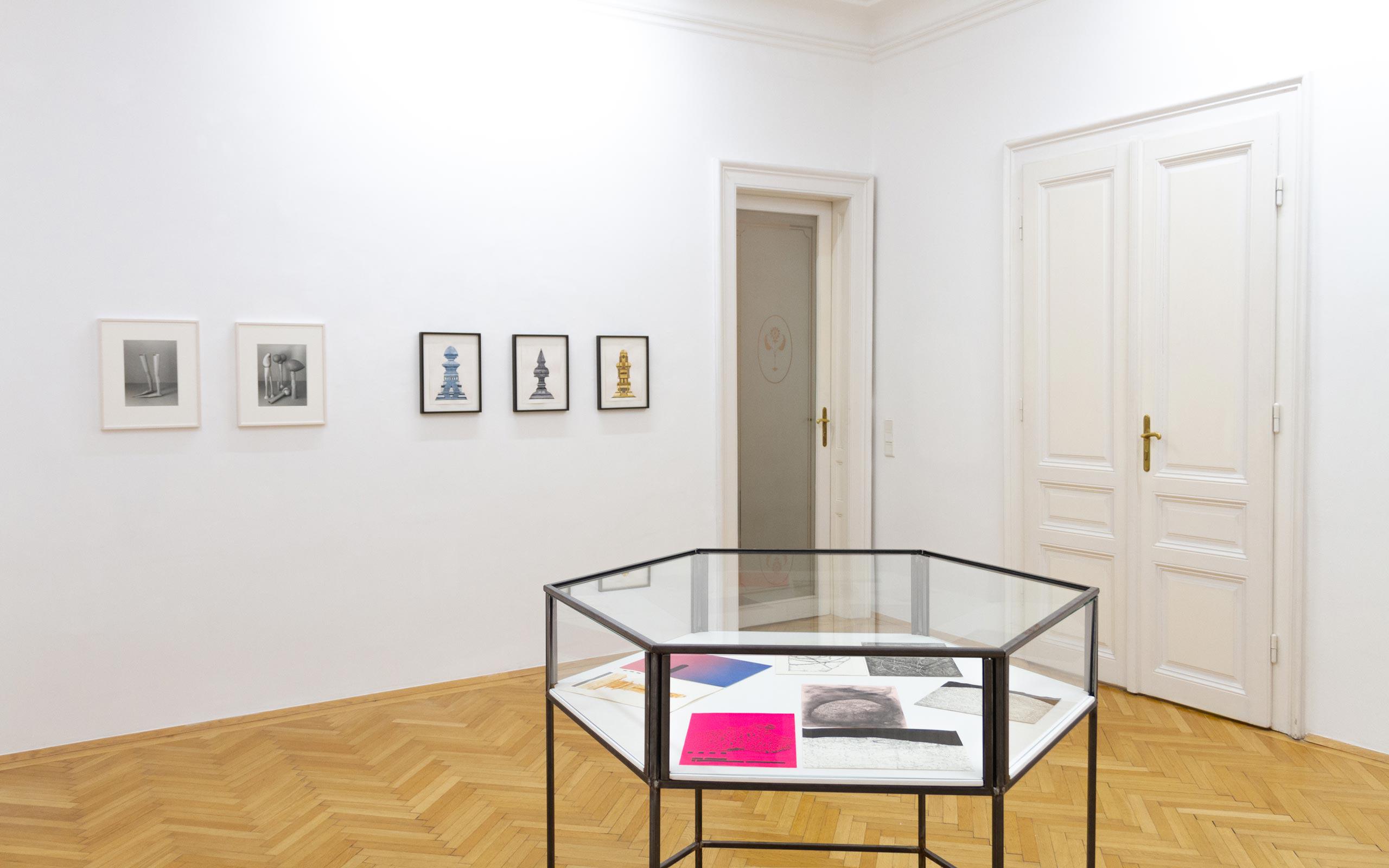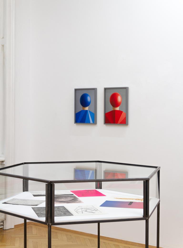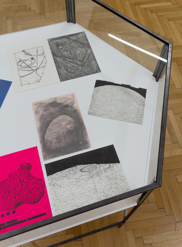 A pentagonal showcase made of metal and glass in the center of the exhibition space expands Andreas Werner's drawing possibilities. Accessible from all sides, the showcase appears like something crystalline, mineral. In an almost pseudo-scientific manner, he combines different drawings and relic-like objects, creating new contexts and narratives.