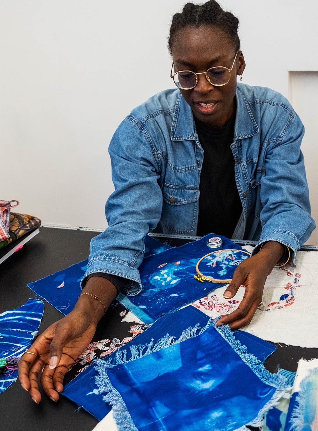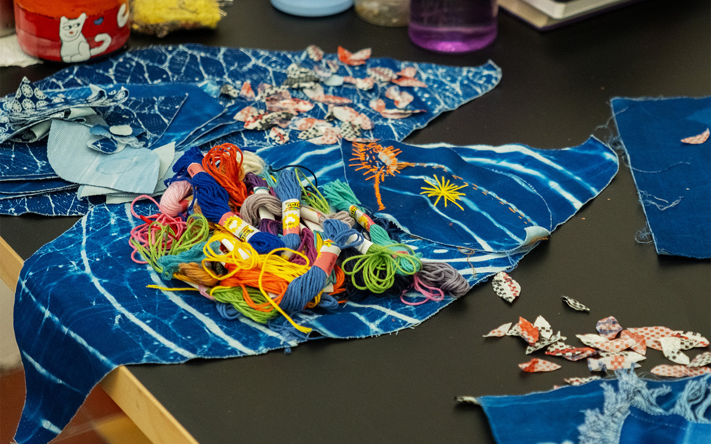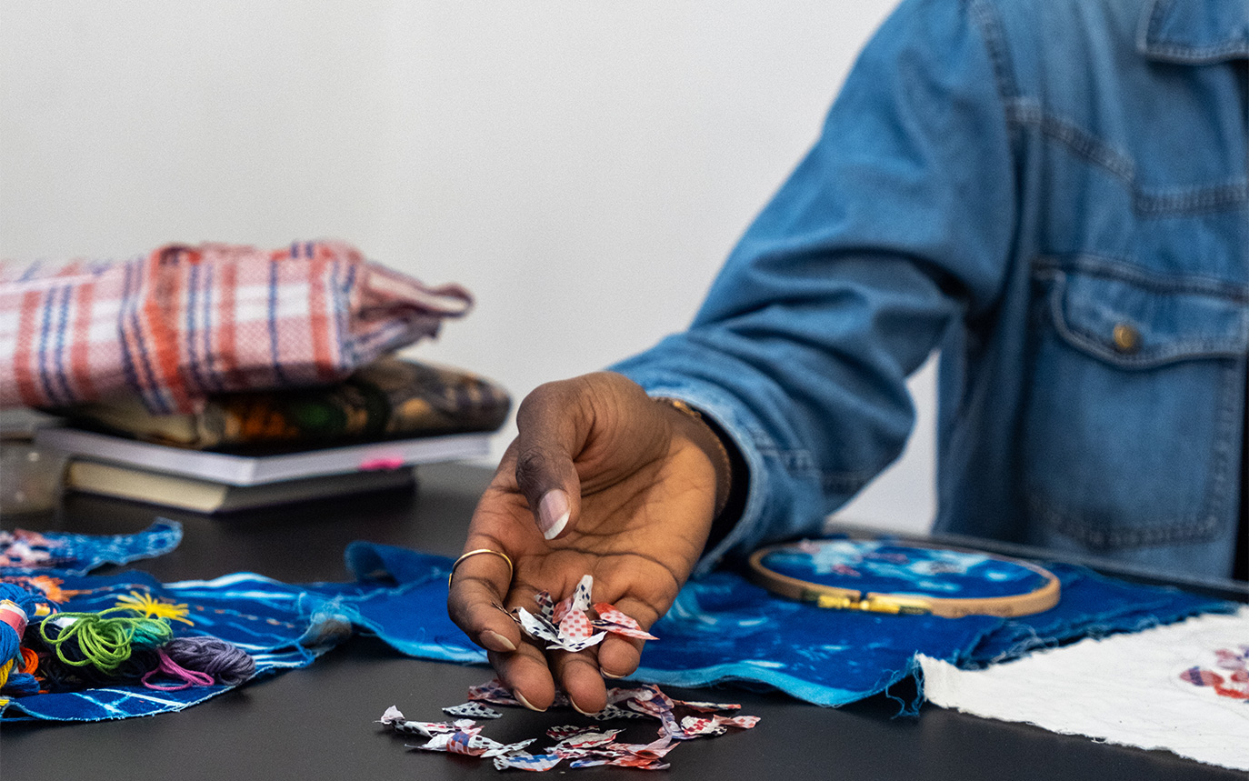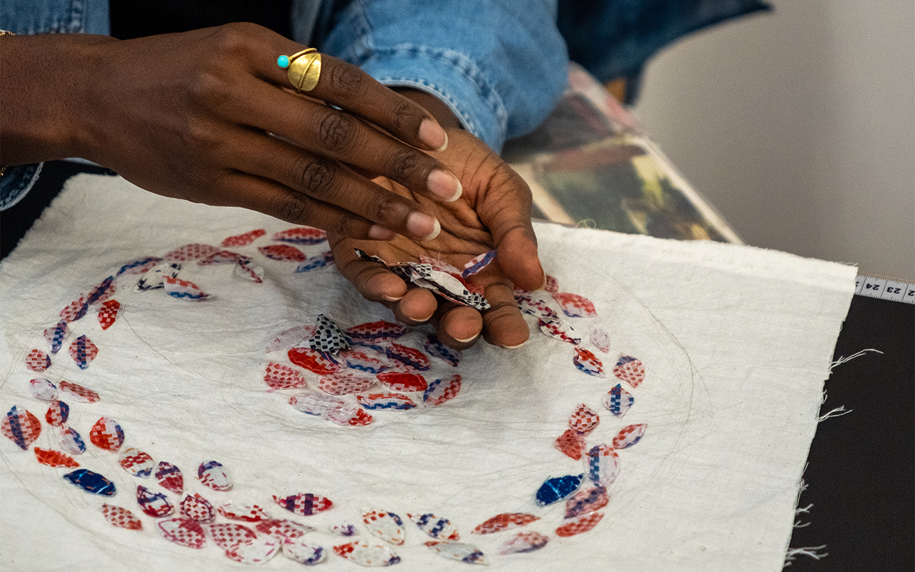 The plan sometimes only comes once I’m already in the process of making. I have a few tools and techniques that I work with, and then the idea emerges. It’s a fluid transition. At the moment, I’m embroidering cyanotypes of the imprint of my soles with colorful threads and “ghana-must-go” cut-outs. I don’t always know what I’m doing, but immersing myself in this meditative state brings the ideas to the surface.