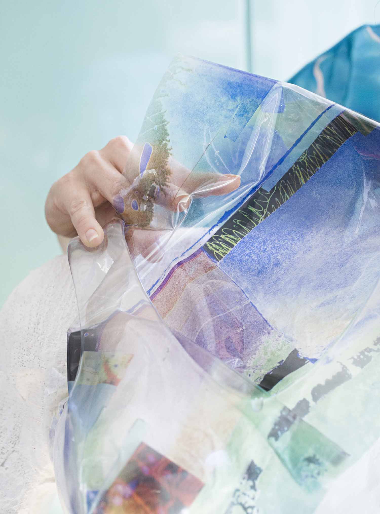 At the same time, the western approach of mankind fascinates me. Our relationship with technology, which seems to actively intervene between the human body and brain is equally incomprehensible to me. I have started to mix the two, together with people, nature, and water, by taking images of future narratives which you see over there, printed on transparent materials such as organic silk, various fabrics, and PVC plastics. But for now, this is a project still ‘on the hard drive’.
