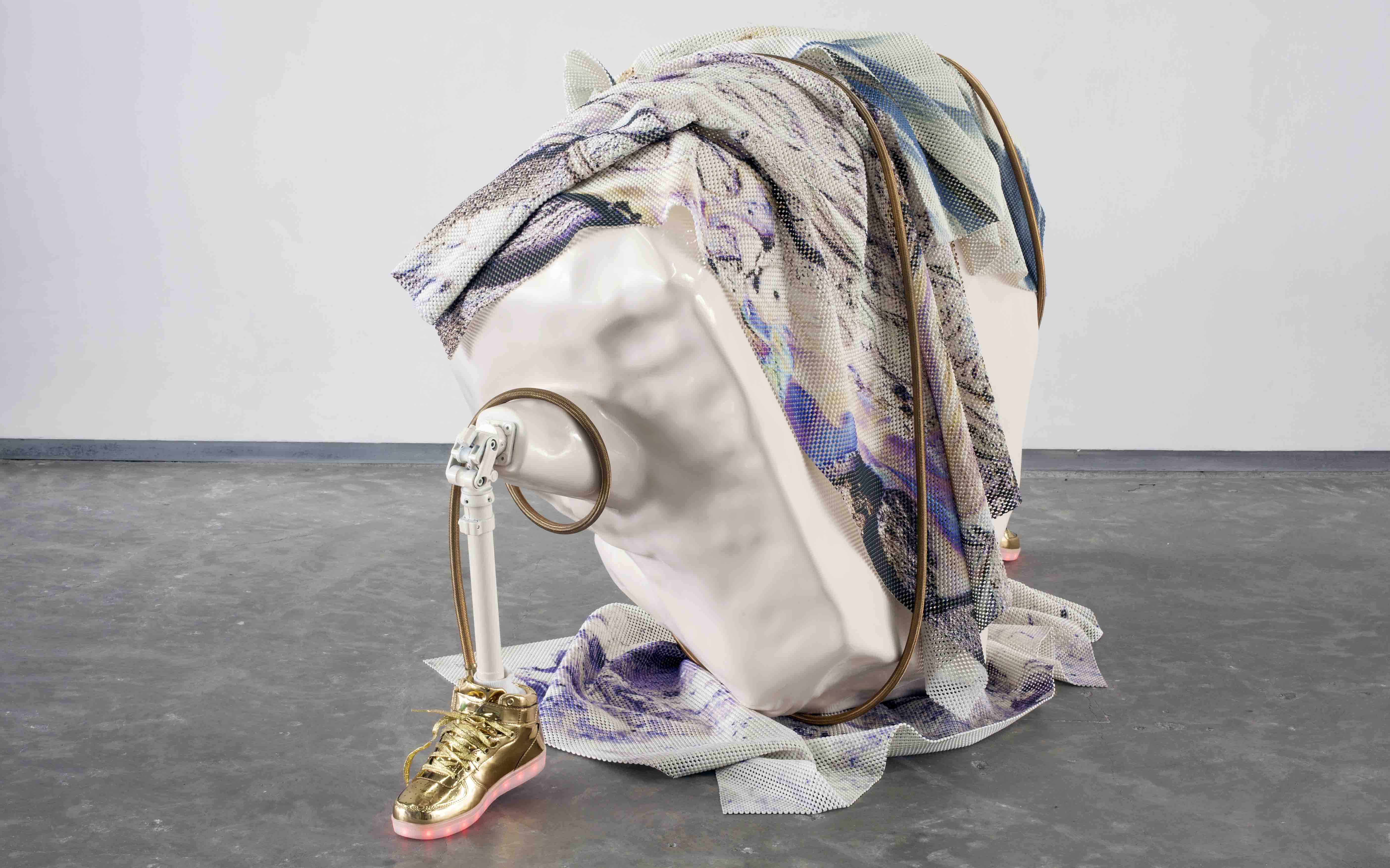 FOLLY, Sculpture, 2017, 93 x 160 x 55 cm, Inkjet prints on anti-slip mats (rubber), fiberglass, paint, metal, led-shoes, gas-cable