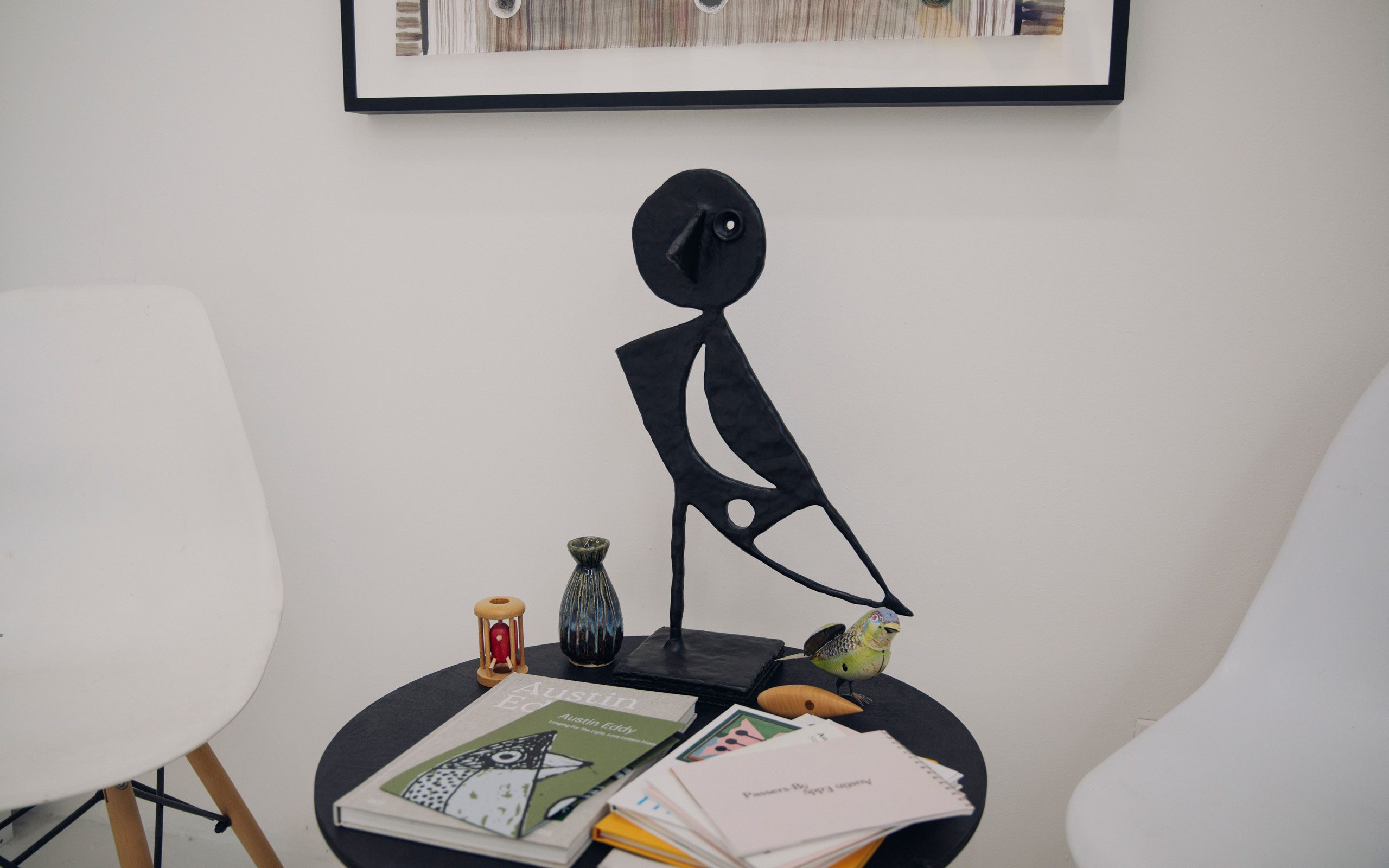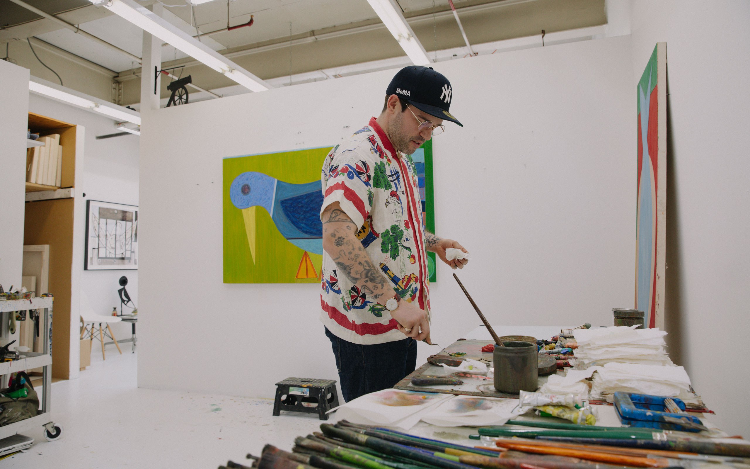 Brooklyn-based Austin Eddy’s paintings call on the viewer to create their own stories out of the ones he proposes. He might use autobiographical events and abstract them to birds, but never imposes his own interpretation. His birds are more form than animal: they are stand-ins for the very human desire for personal freedom, framed by its equally strong wish for stability and structure. As his work toes the line between figurative and abstract, it recalls the cubist forms of the 20th century, while being firmly anchored in Austin’s present.