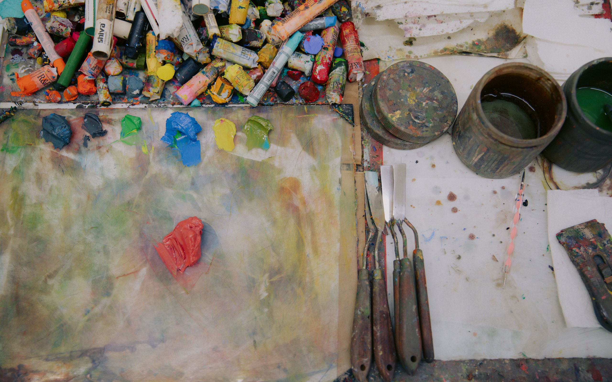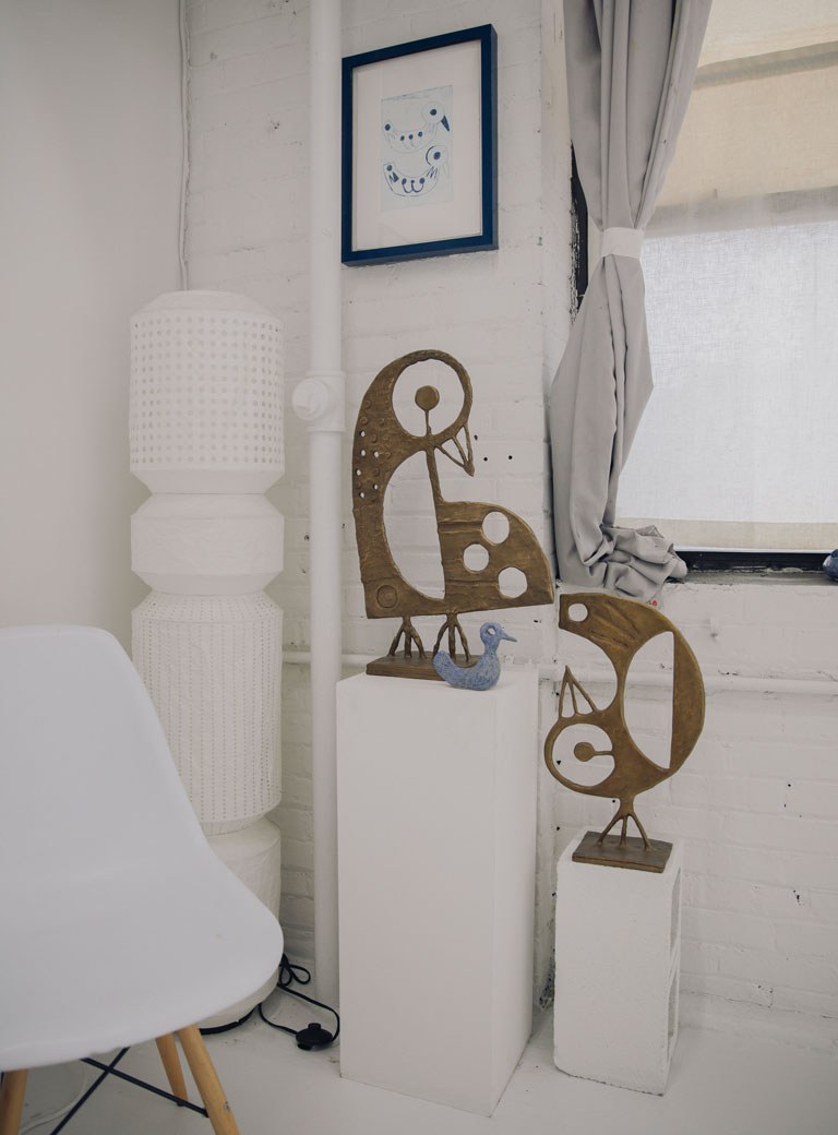 No, in my studio there is very little. I try to keep it as an empty room, paint and tables and chairs. I don’t have any of my finished works up in my painting studio. Nor do I have any source material, I’m relying on memories and thoughts to build the paintings. But on the other side of the wall, there are some sculptures, and in my storage area, you will find postcards, posters and books.
