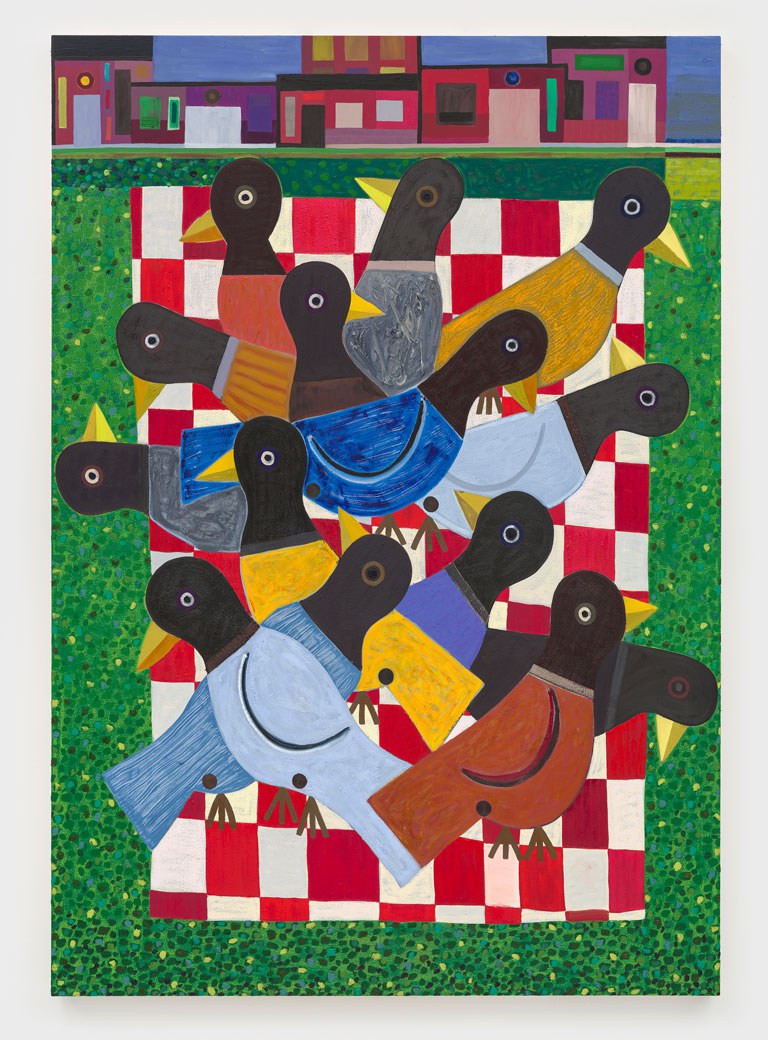 It is called The Wedding – and as I mentioned, it was inspired by my own wedding! The work itself can be seen referencing geometric abstraction from the 1960s, but it also captures that spirit and excitement of a wedding. Really trying to portray the anxiety and energy of that kind of evening. The birds here look like they are on the dance floor – or on a quilt in the park at a picnic. Things can be many things at once I guess.