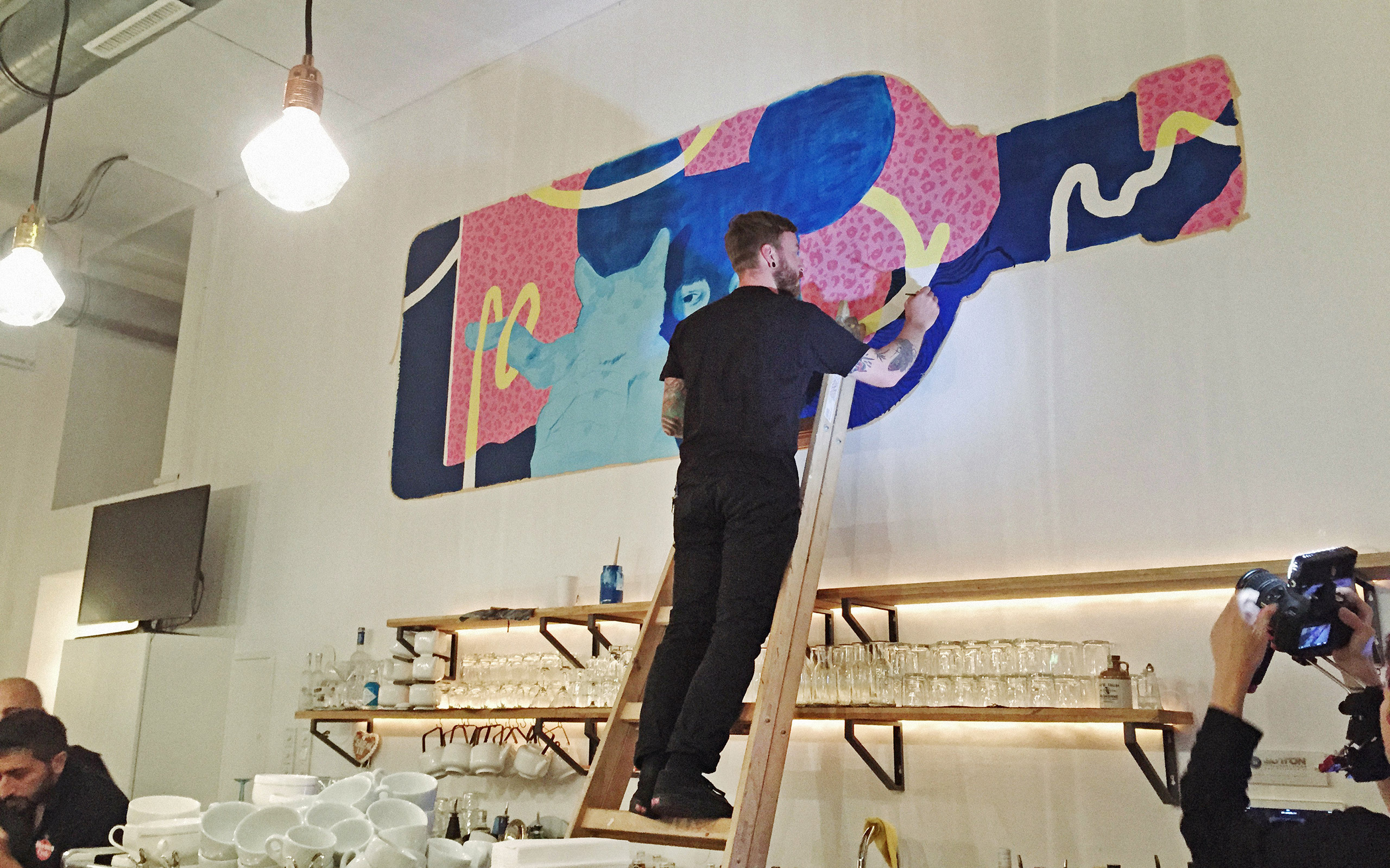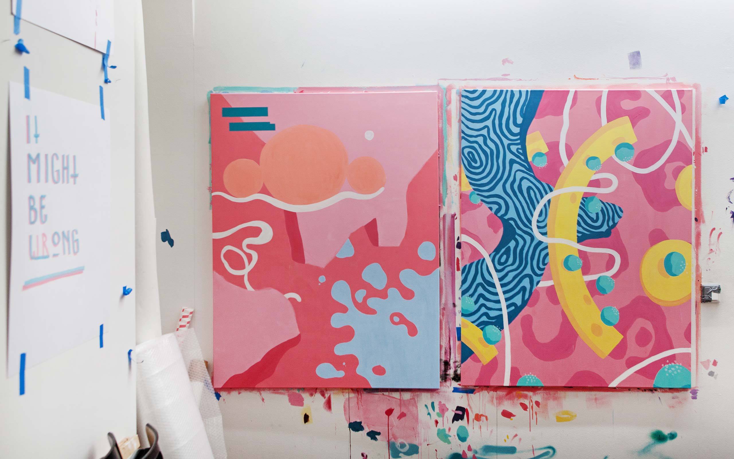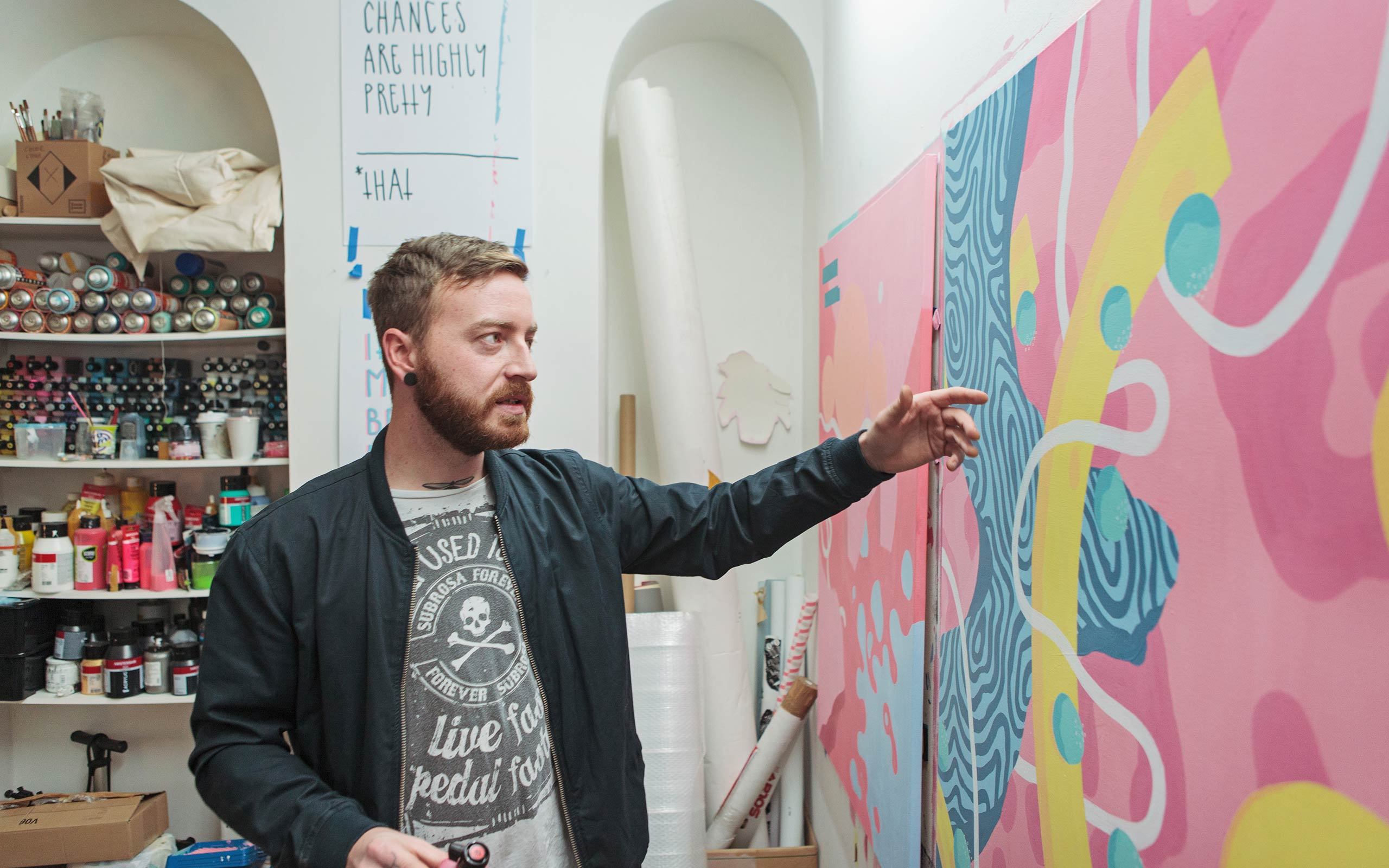 Austrian-born artist Boicut combines impulsive lines and abstract shapes, which he paints in his signature colour palette of pastel hues, as a reference to the good things in life. It matches his own positive and easy-going attitude to life, and to his career as an artist. One might say he comes from Street Art, but he has got his problems with this term. He is not a fan of putting things boxes. What he is a fan of, however, is coffee and cigarettes. Boicut appreciates the collaborative culture of Vienna’s artist scene and wouldn’t want to change it for another place – at least not for now. We met Boicut in his studio and talked with him, among others, about a busy last year, his calling to the States to work in Miami, and how he got into art in the first place.