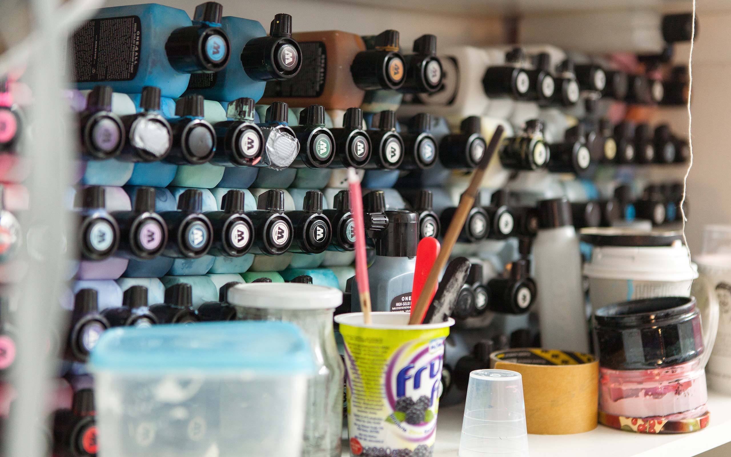 They are highly pigmented paints on an acrylic basis, which dries really fast. I am using it for every application, for canvas as well as sculptures and objects. As the paint is resistant to light, my work maintains the brilliance of the colours as they were applied. I really like these colours for their high opacity.