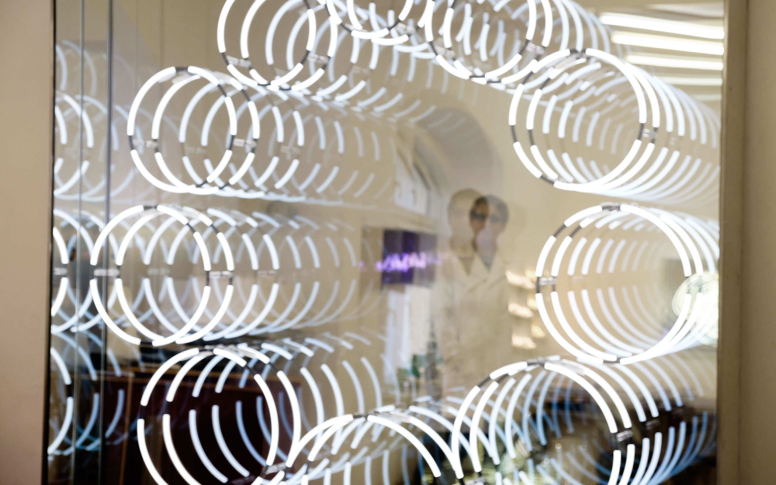 Dan Flavin created his installations with conceptual rigor as abstract forms. James Turrell creates spaces that operate with the illusion of surface. In my work I try to create spatiality, that is three-dimensionality, through the layering of transparent surfaces such as glass or reflecting surfaces generating new virtual spaces by means of light.