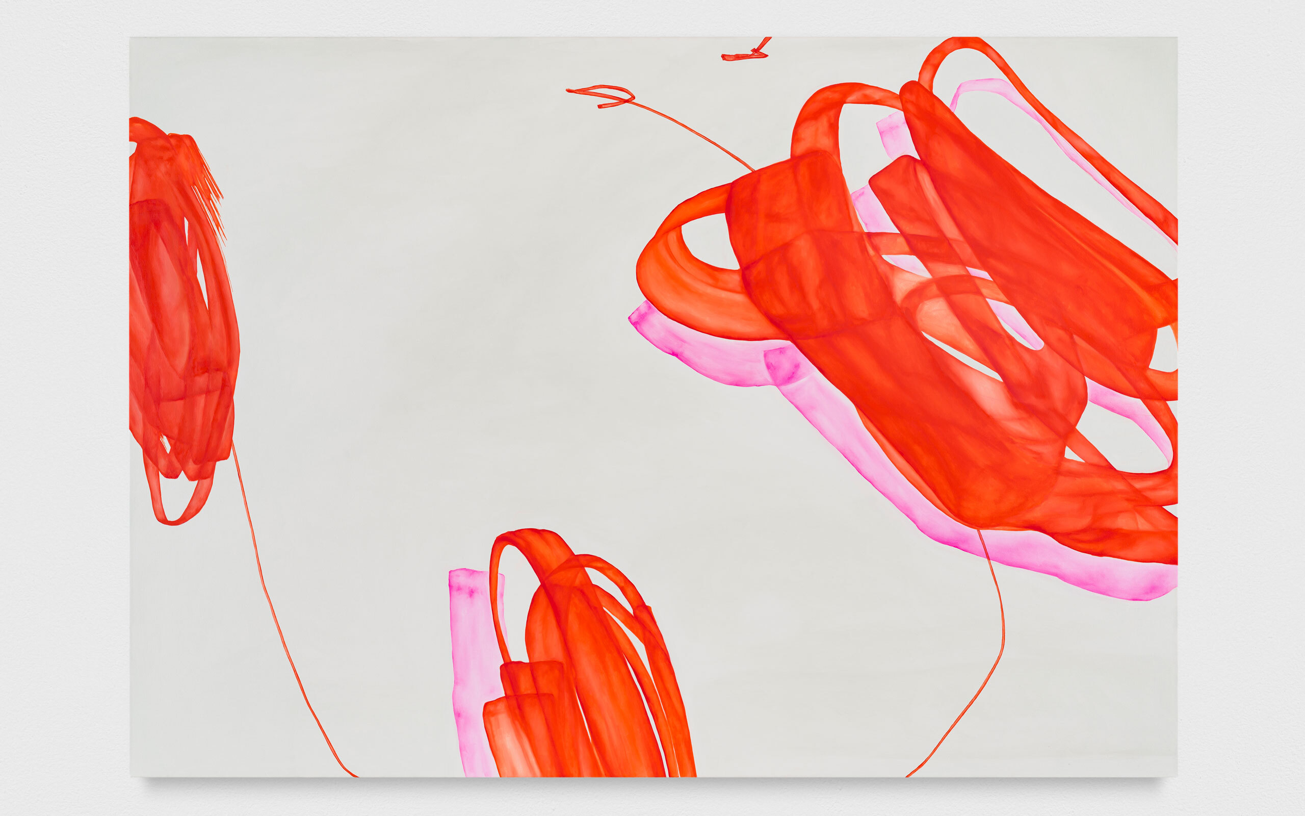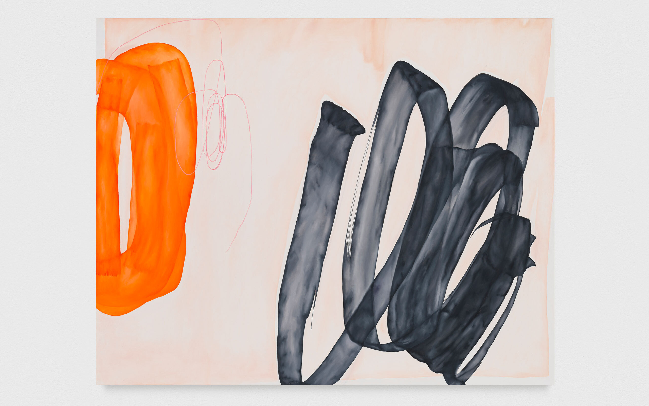 Yes. I used to paint quite realistically, mostly figuratively, which limited me a lot in the way I painted. I wanted the person I was portraying to look like a person in the end, because it gets brutal really quickly if there’s anything wrong with it. Since I’m usually pretty precise and tend to spend a long time immersed in a piece of work, this wasn’t a contradiction for me, and if anything it intensified in portraiture. So I was looking for a break, but I didn’t have a good reason to just move into the abstract; it seemed too “random.” I had to build my way there first. As a result, I started painting people in water, in which the bodies dissolve through reflections and distortions. This then gradually became more unrecognizable and at some point I came up with the idea of scribbles. I collect the scribbles from stationery stores. These drawings are so honest and accessible, the people there don’t want to self-actualize and don’t think about what they’re scribbling. I find that desirable, but quite difficult to achieve in painting, because as soon as you want something, the moment of being impartial has already passed. So I extract parts of these found compositions that have a certain sweep or a gesture that I find sympathetic. I then transform these lines and forms relatively meticulously into oil painting. The abstract gesture forms the basis, but for me the forms are projection surfaces of my desires: the otherness I strive for, which I acquire through the copy. When I do replicate these strokes, they become mine, first through the intense engagement in the painting process and later through the reflection of the viewer who identifies the work with me. So I can form myself through my work and actively realize desires.