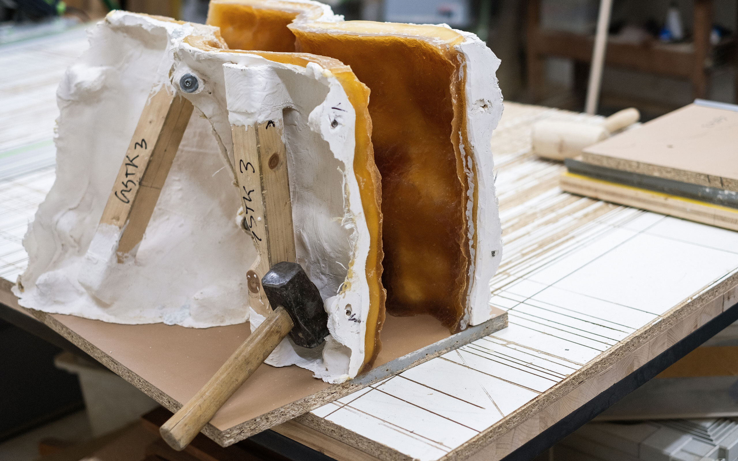First, I calculate what kind of mixture is needed. How quickly should the concrete harden? This depends on whether or not I want to manipulate the casting while it is still pliable. Then it’s off to the woodshop: There, I build a mold that I have to be able to disassemble while the casting is still soft. The nice thing about working with fresh concrete castings is that it is relatively quick and you don’t have to be very precise. So it can be that the idea for a work comes up in the morning and it is subsequently finished in the evening. For a few years, I had a lot of fun working very quickly: Build the form, cover it, mix it in, and then manipulate it again an hour later. In the meantime, I sometimes work quickly, sometimes slowly, I sometimes work without any concrete at all, or even on work that is only marginally related to concrete.
