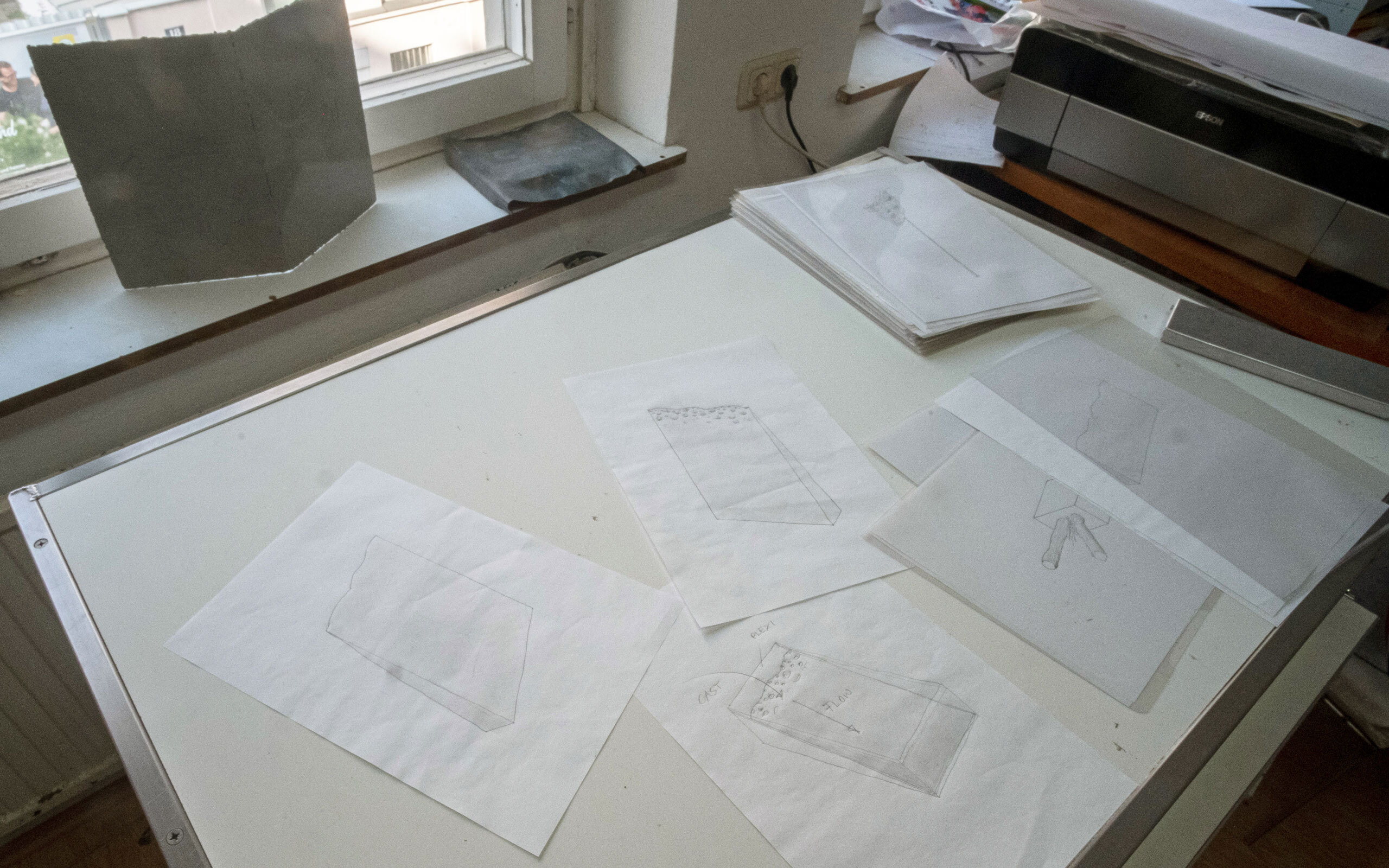 béton brut matrix, 2017, wood, steel, 72,6 x 161 x 80 cm; Drawing: Pencil, cement, glue on paper, 41 x 33 cm, Courtesy ProjecteSD, Barcelona, Exhibition view: On Fold, ProjecteSD, Barcelona, 2017, Photo: Christoph Weber