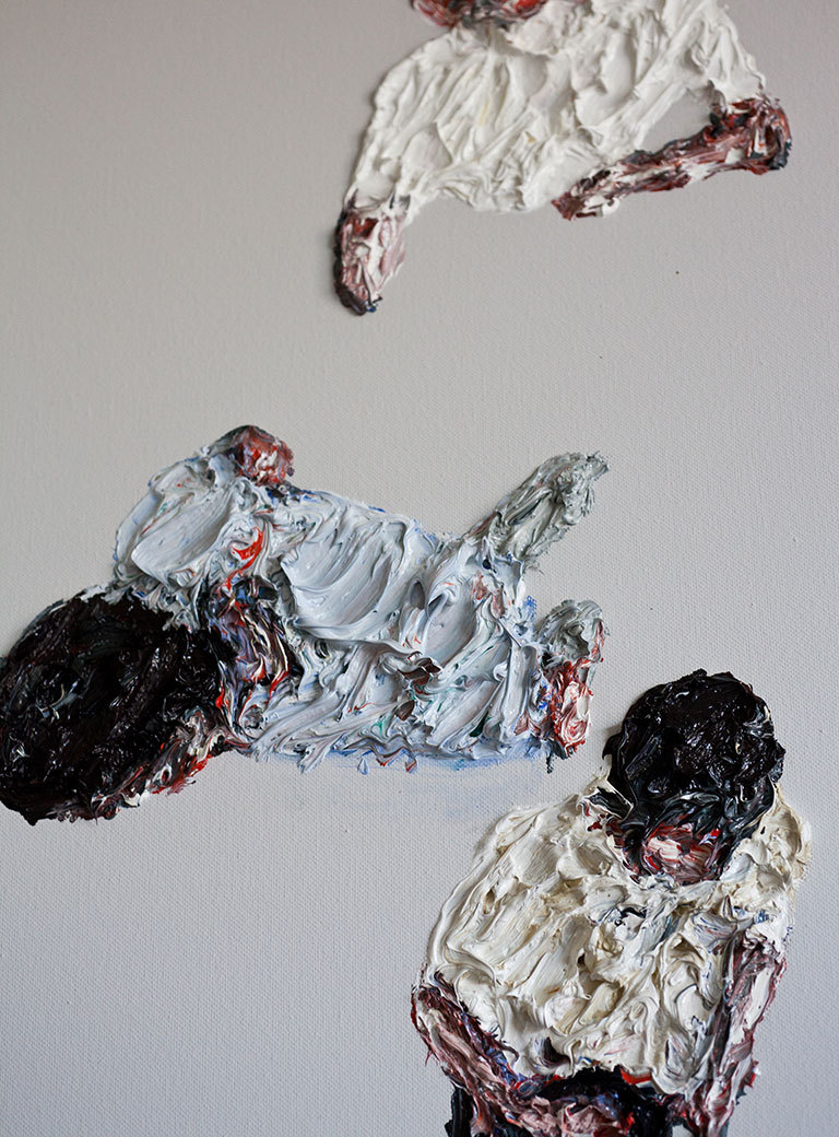 You are known for your structurally strong oil paintings that represent human bodies seen obliquely from above looking like their own shadows. Can you say something about their origination?
