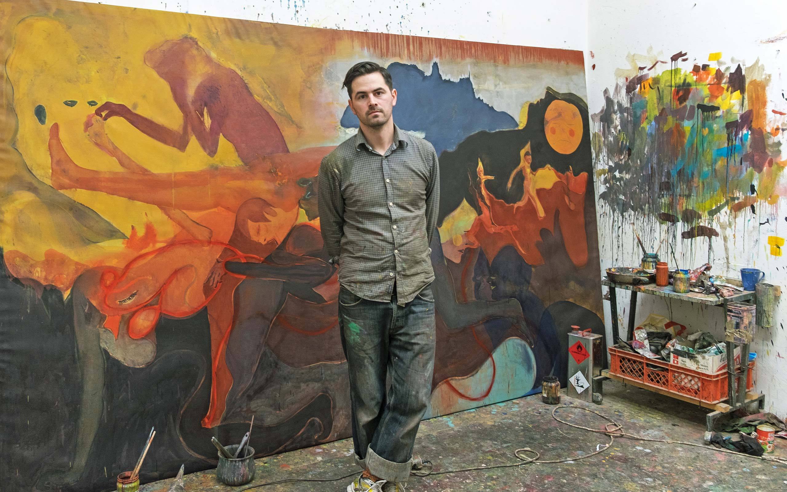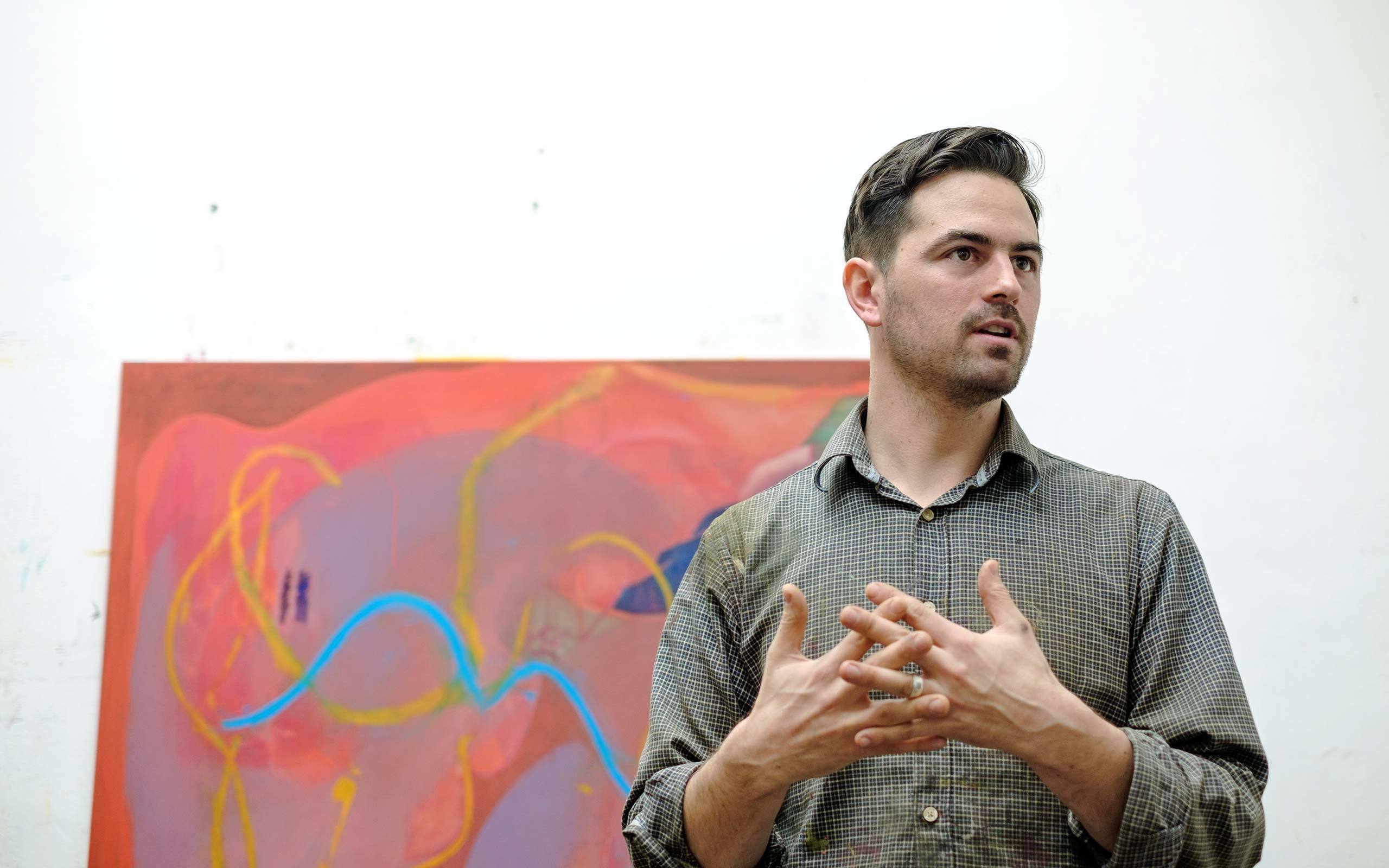 Daniel Domig contests with the fleeting glance and fast-paced consumption of images, taught by the digital media. With swift and easy brush strokes he pronounces visual statements. We met Daniel in his studio, located in Vienna’s seventh district. He has already made a fire in his Canadian furnace. The room is filled with a pleasant scent of oil paint.