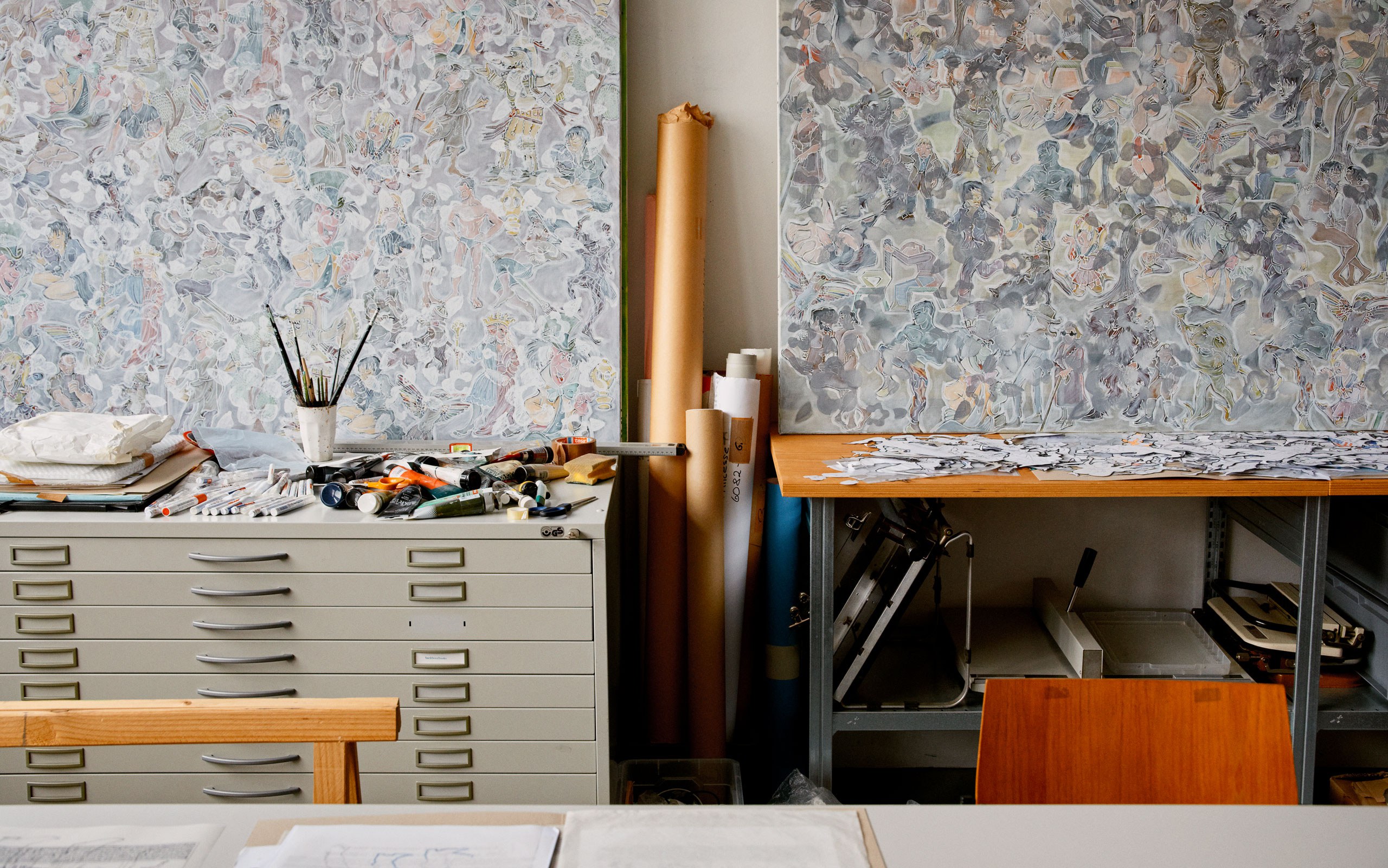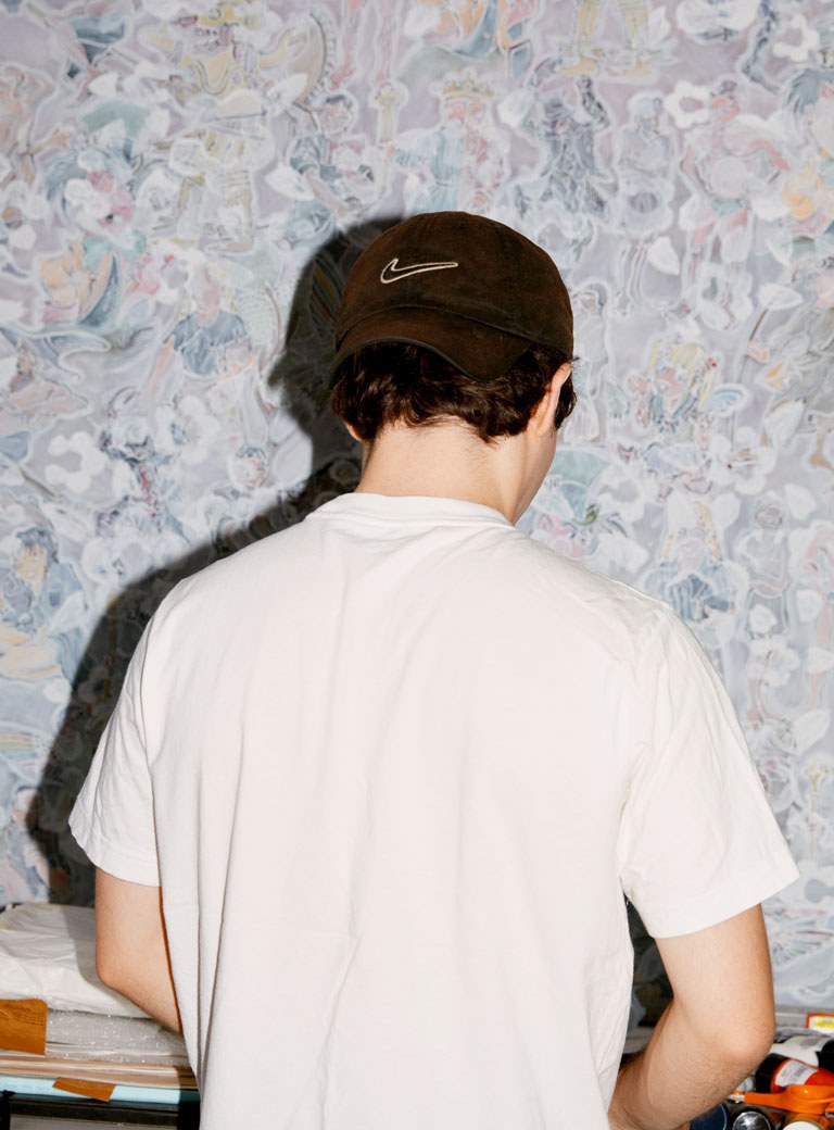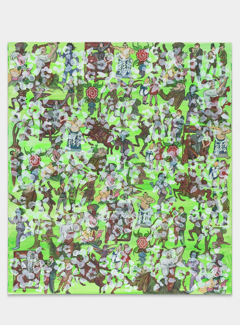 My whole practice is based on a kind of obsession with flat, figurative painting history. I extrapolate from it and then use my findings as raw material to discuss its echoes in the canon of postmodernist theory, of poststructuralism, specifically in the vein of media and aesthetic philosophy. There is a lot of analogue painting, an interest in replication, imitation, repetition, difference, the illusion of patterns, the lack of a system. I like naivety, or the appearance of it, and I elevate privilege concept over form. It’s kind of psychedelic and maximalist agglomeration, there’s a lot of layering with thin coats of white paint and correction pen. A lot of my paintings are also about the tension that arises when you lack a certain feeling of canvas ‘space.’ I constantly try to show that nothing is ever the same, that nothing fits like a glove, that certain truths are as beautiful as they are frustrating, that nothing about aesthetics or idiom is intrinsic to one meaning over another.