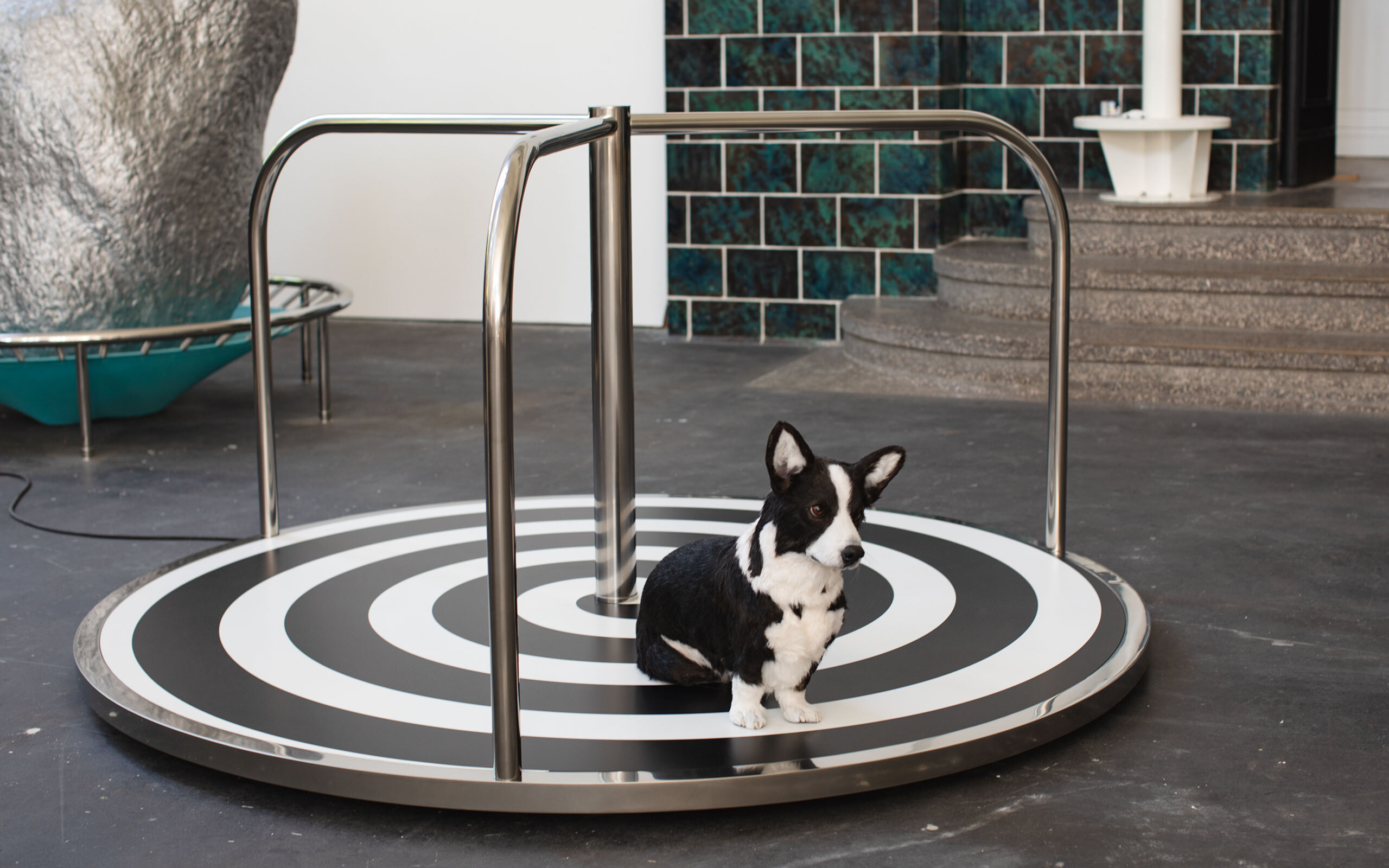 ME: We’ve turned the museum into a carpark using very simple means, but we also added some surreal elements too. Like this sculpture [points at a lifelike sculpture of a corgi, made of artificial materials – resin and fake fur, on a children’s round- about], which is called Social Media and doesn’t fit at all! (Both laugh.)