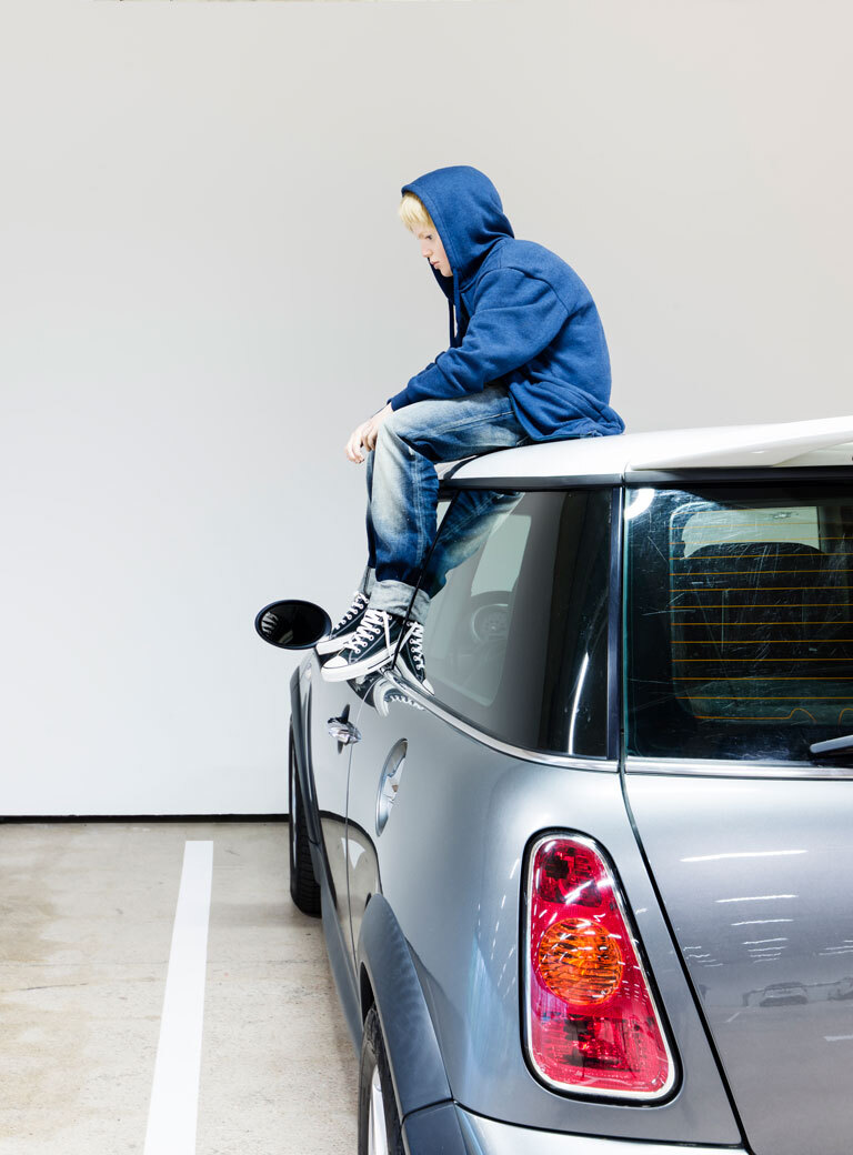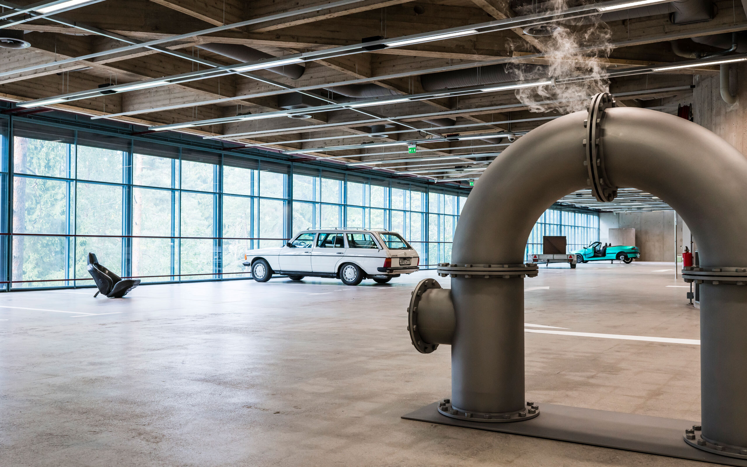 ME: We looked at the architectural features of the museum—at the big concrete pillars and floors—and that’s what it reminded us of. The status of the car is also very different from what it was. We all feel guilty about our petrol consumption if we don’t have an electric car. It’s one of these non-spaces too. You don’t live in a car park; you don’t go to shop there; you don’t go because you like it; you park your car and then you want to get out. You also have all of these fear mechanisms at play in a car park…
