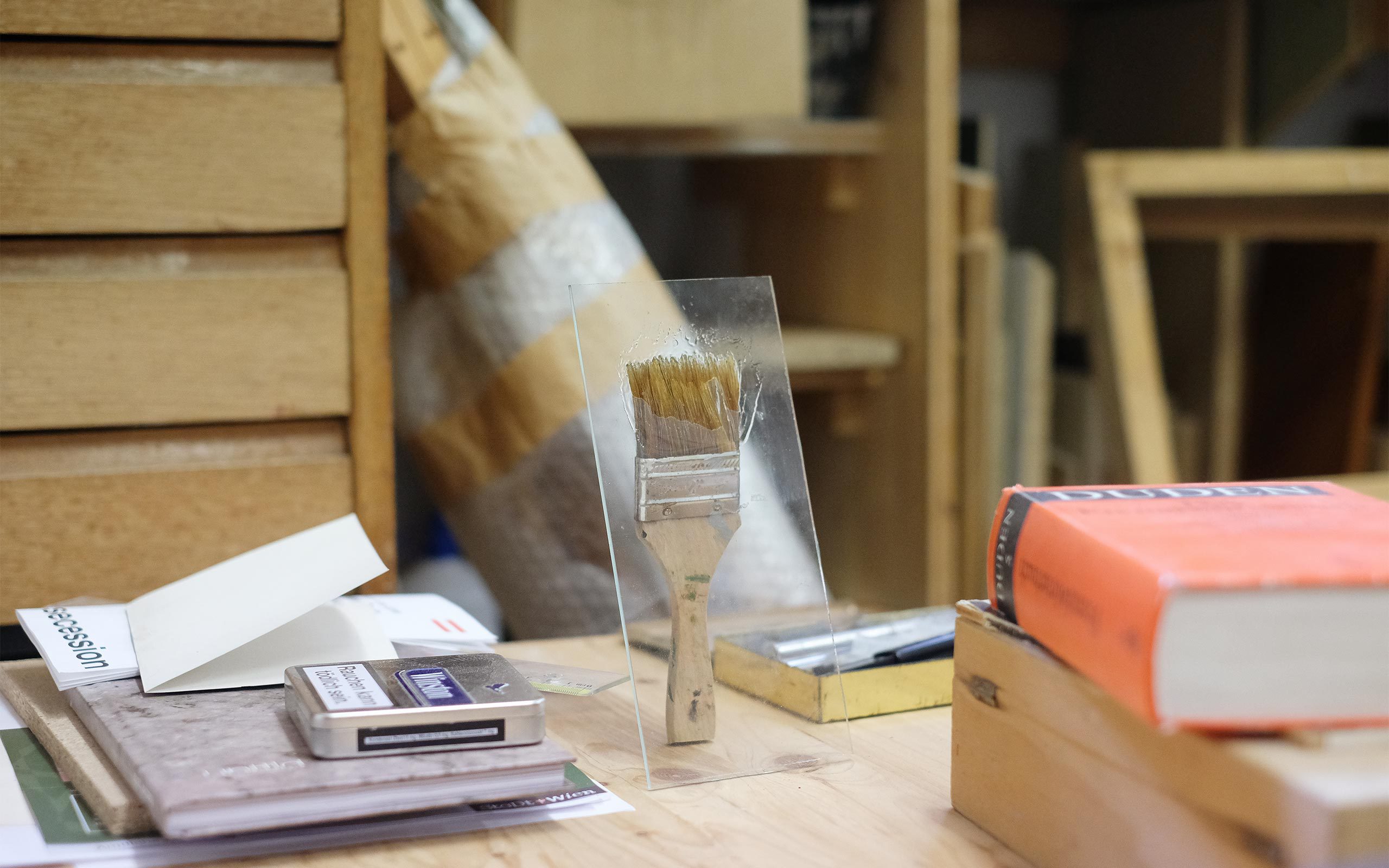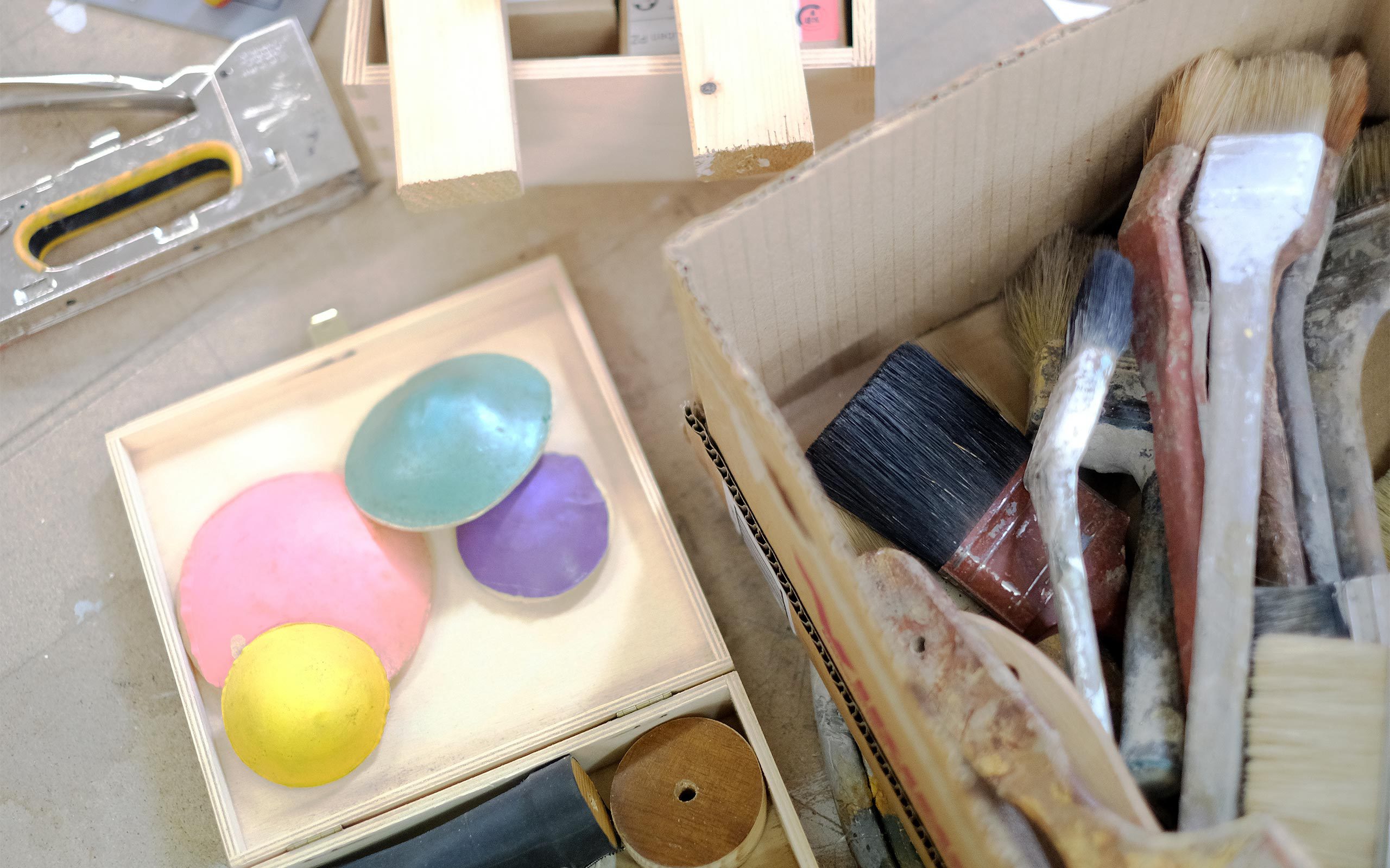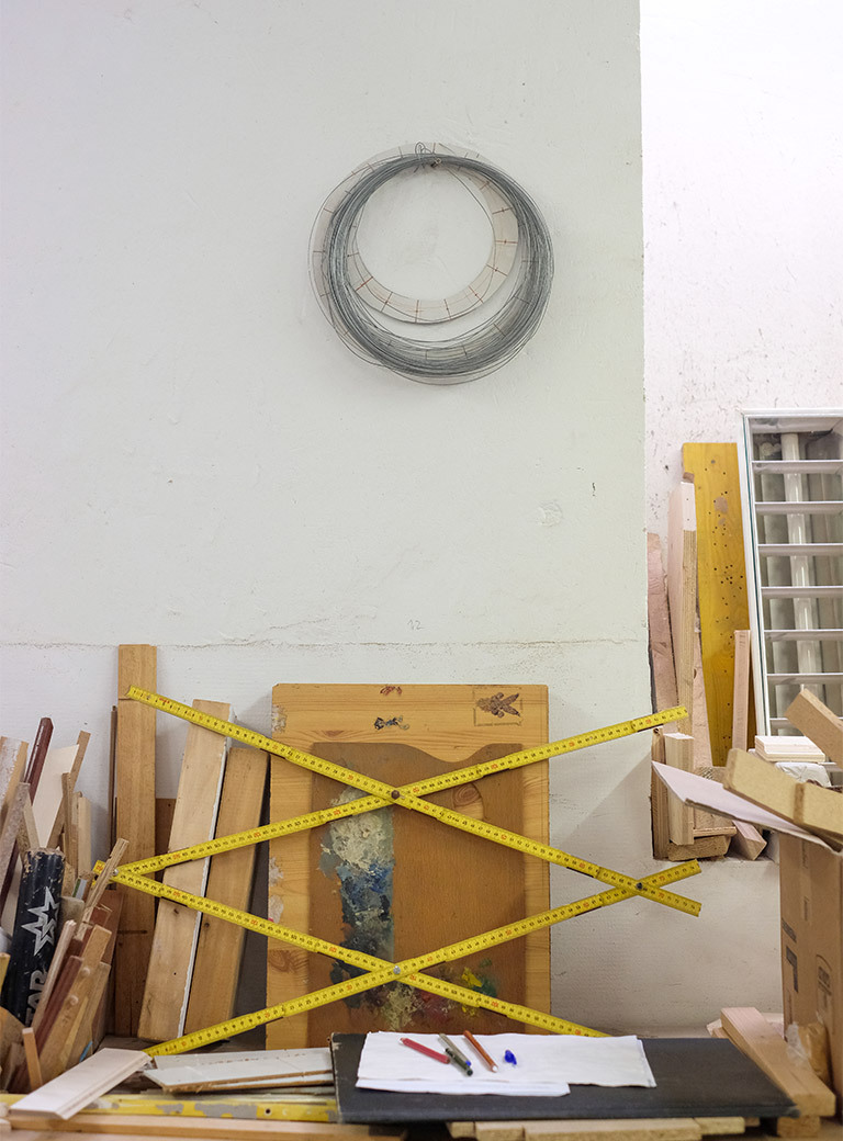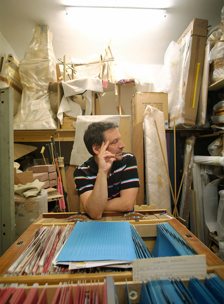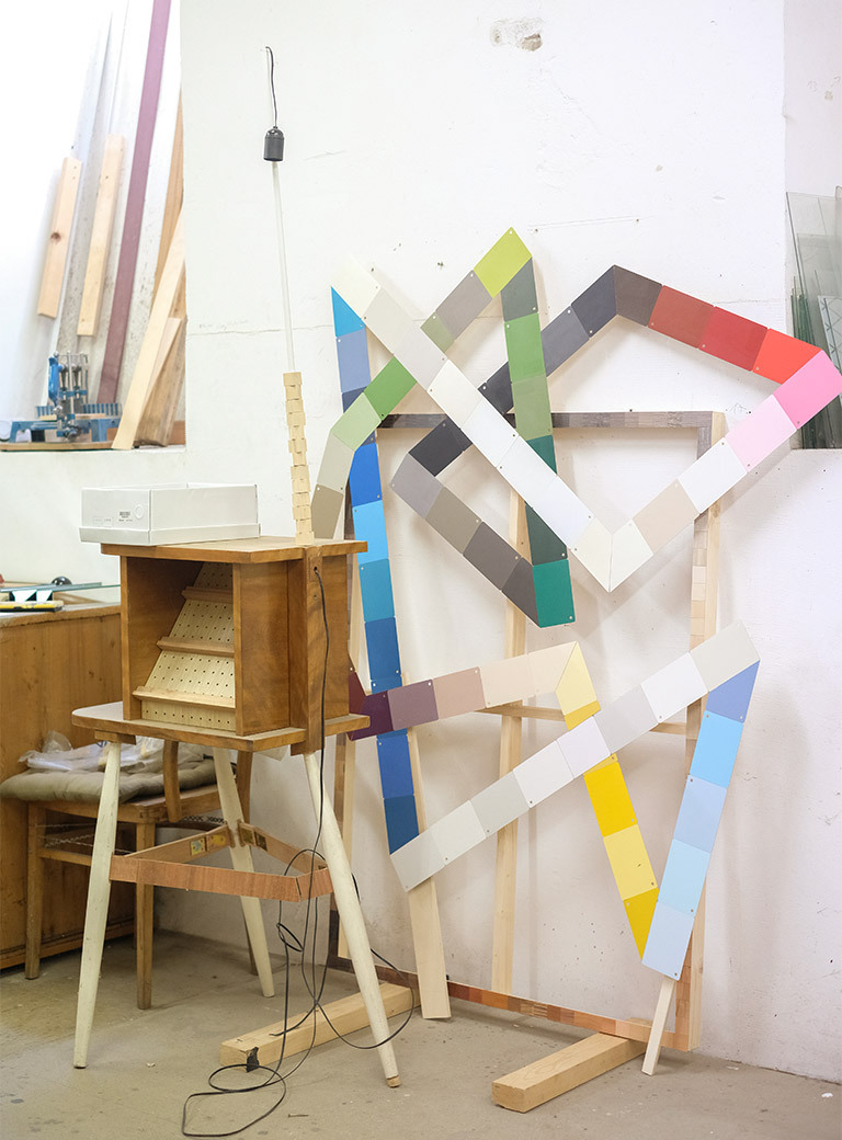 The space functions like a machine. Through the structure that I have created, my studio functions like a prosthesis for me. I know which spaces are best suited for what, and in the stored materials one can see traces of memory. In my studio I also have my art machine. The idea is that a work of art consists of form and content. The collection of forms is subdivided in terms of aesthetics and materials. On the content page there are texts and images that transport content. A self-built random generator determines the ingredients of a work. I think there are over 456,000 possible combinations – more than enough for my entire career. I have been filling my art machine for seven years now. It is something like my outsourced brain and many works have been created from it, in addition, it has also been conceived as a sculpture.