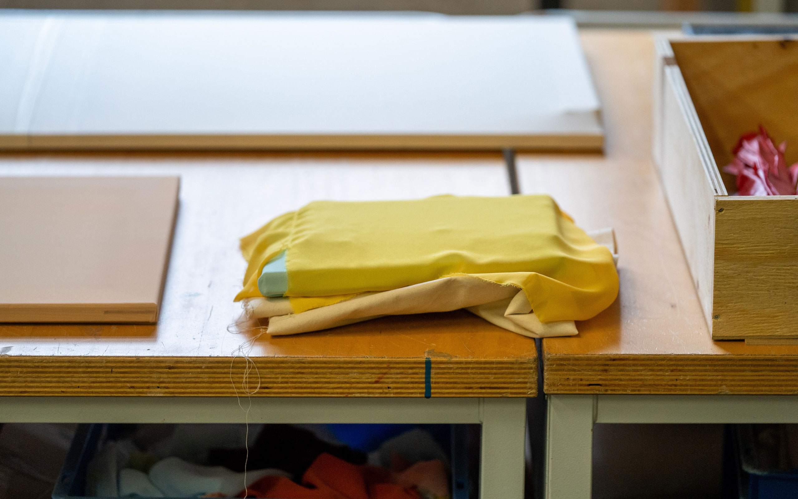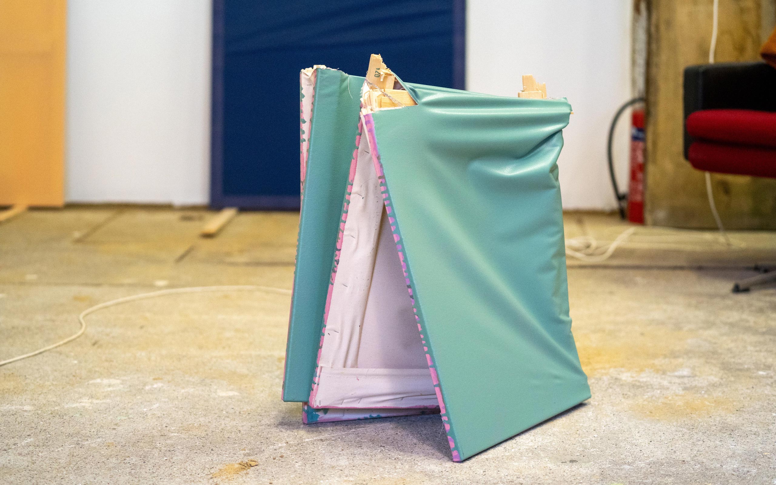 Exactly. The stretcher frame is visible, I can accentuate the space between fabric and wall. I can use this chiffon fabric like liquid paint by layering it and mixing it. Or I can cover stretch frames of different sizes with various chiffon fabric, screw them together and also produce a different colour shade. Chiffon is an acrylic fibre, and in my Transformations I only ever use acrylic paint. So it felt fitting to use acrylic in a different aggregate state.
