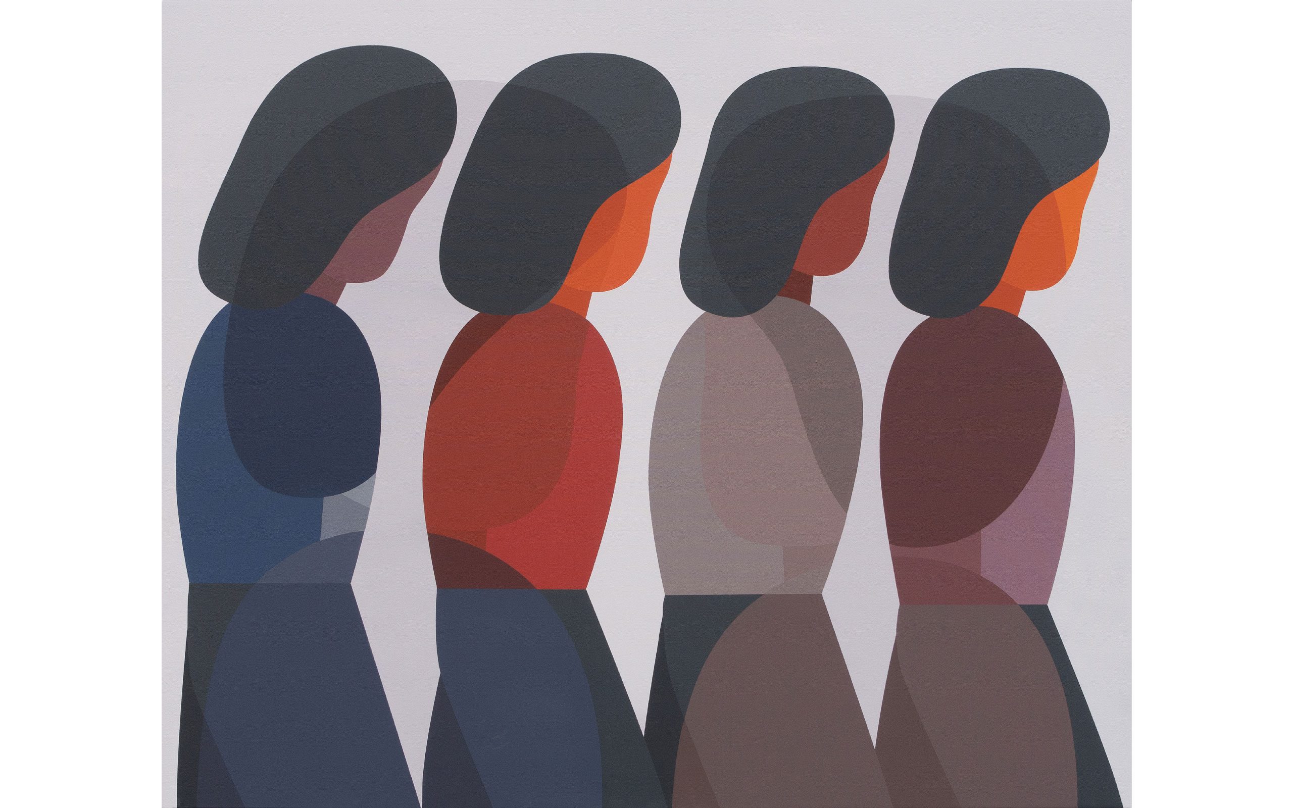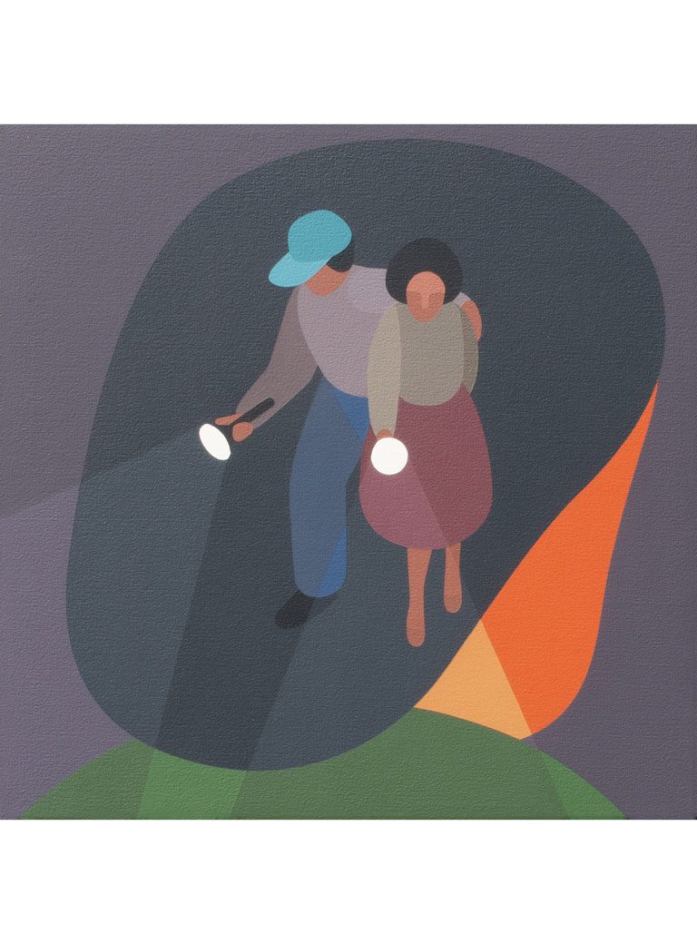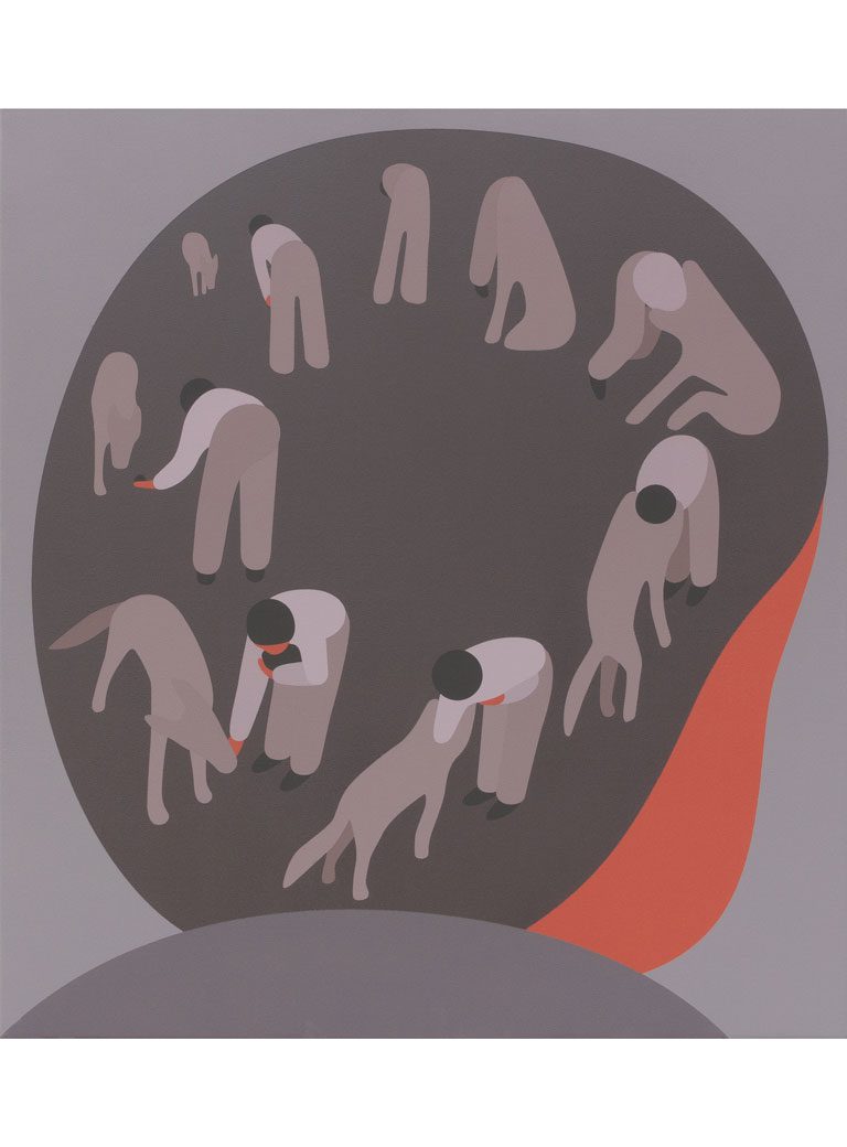 The Canadian Geoff McFetridge attended the Alberta College of Art and received an MFA from the California Institute of the Arts. Early on, he worked for commercial clients, following his interest in subculture and especially skate culture. His stylized designs became quickly recognizable and led to collaborations with Nike, Pepsi or Apple. At the same time, he is a working painter who shows internationally, not caring to be reduced to a commercial or fine art label. The simplicity and straight-forwardness he uses in his pictures transcends both his lines of work; his paintings add hidden context.