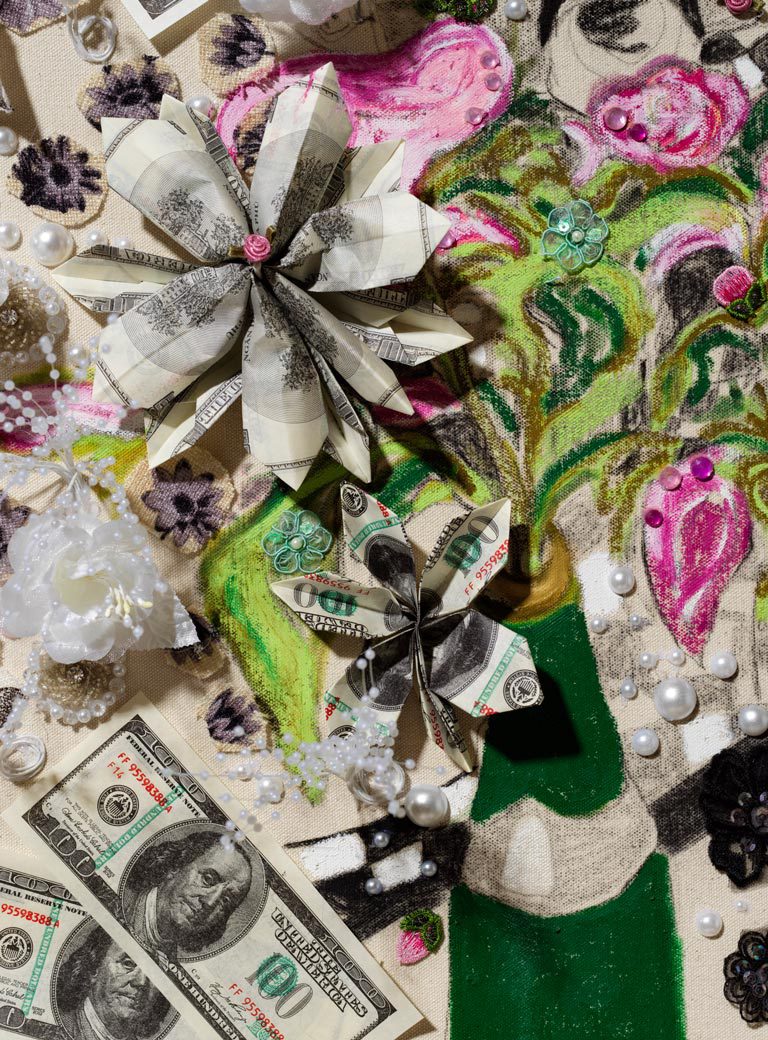 Contemporary Art Auction Record, Origami money, "at least you are cool on the internet" iron on patch, and charcoal on canvas, 152.5 X 122 cm, with thanks to ELEKTROHALLE RHOMBERG Gallery, Salzburg