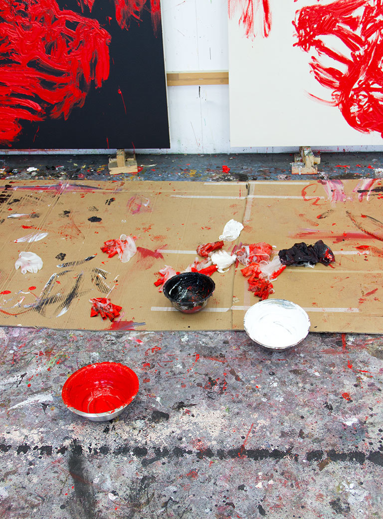 Well, I try to be here early, which means around 10 or 11 in the morning. (Laughs) I might start working immediately or contemplate on what I did the day before and decide how to take it from there. I don’t work according to a particular schedule. For example, during my flower painting work cycle I worked day and night, completing each canvas in one go, as long as the oil paint was liquid and I was able to manipulate it. In this case, the process imposed itself on my working schedule.