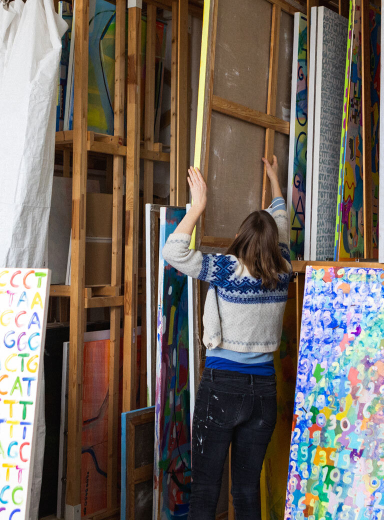 The second series I am currently working on is about genetic engineering. I started this series in 2018. Patterns, structures, and numbers are the leitmotifs. This series of works functions much more systematically, although both series remain closely connected. When I work on the systems of genetic engineering and I am painting in a large format, it is often a very physical process. If I work on it too much, my body doesn’t do well, the work activity becomes oppressive, and then I become blocked and need to switch to work on the other series. But through this physical reaction, I get the painterly gesture I need for the first series. So alternate activity on each of the project series acts in a mutually reciprocal way.