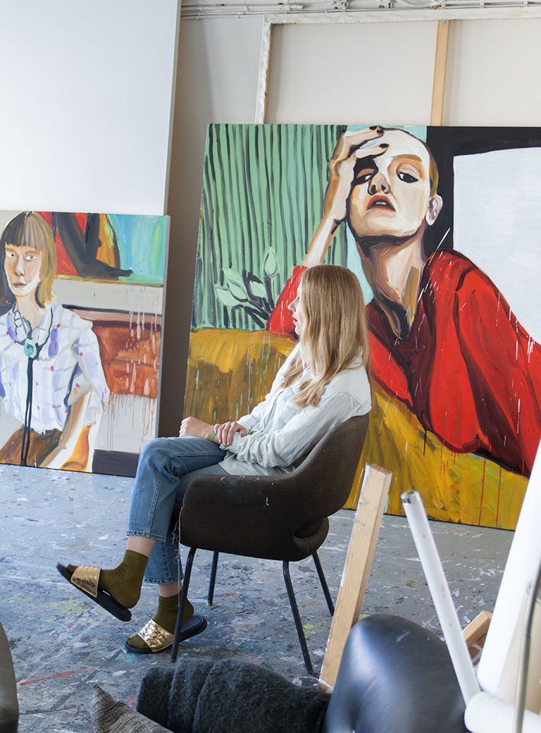 A lot of my motifs are borrowed from the fashion world, but indeed I also have people posing as models for me. They are often friends of mine. As you see nearly all of them are women. It just happened. Maybe I am starting to paint some men as well from now on. I was thinking a lot this summer about what to do and where to go next. It is not fixed yet, but I think I will change things a bit. For example, until now, I have been using acrylic, but I have loved to paint in oil recently. It will change my way of working. Usually I did one painting a day when I had a good drive going on. Now, with oil color, it takes much more time for drying, so I have to do one painting on one day and another painting on another day, only to return to the first one after that and so on.