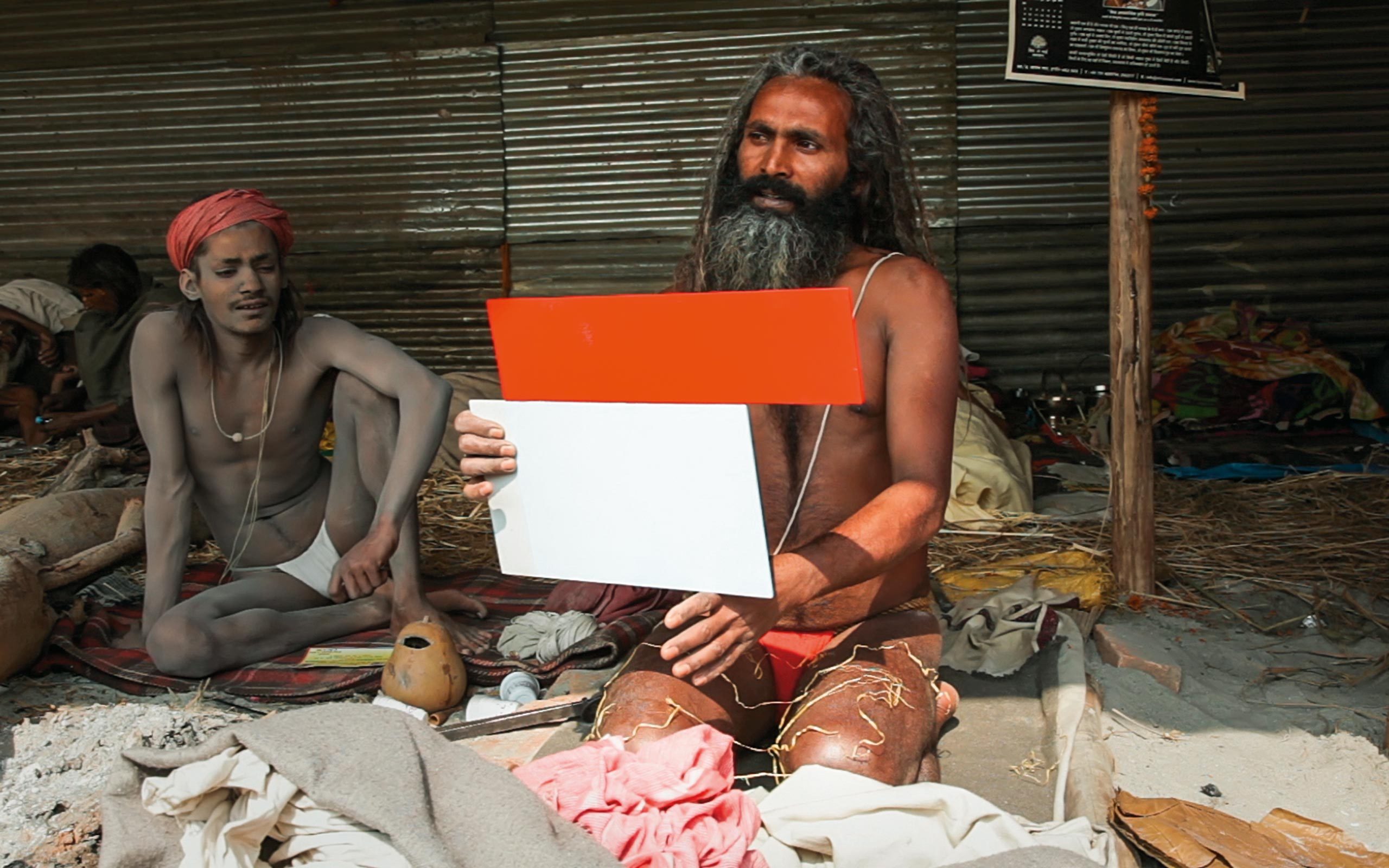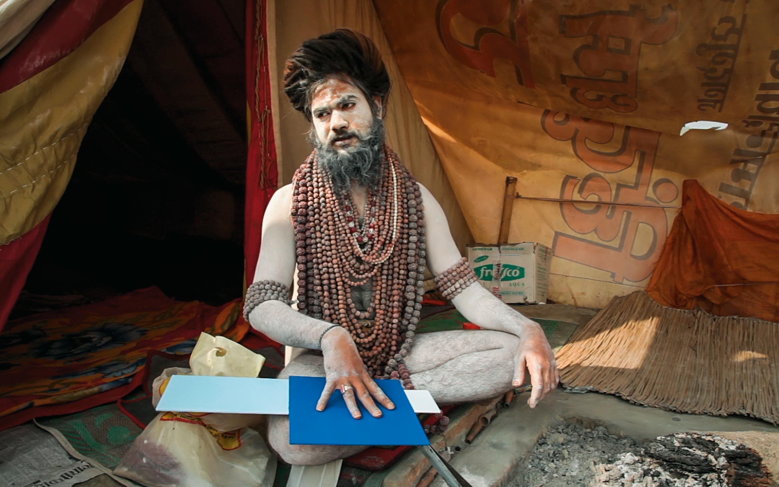 The Indian ascetics, the so-called Sadhus, have gathered for centuries to exchange experiences about their spiritual practice. This resulted in a cyclical feast, the Kumbh Mela, which takes place every twelve years in Allahabad. On this occasion, a huge tent city comes into existence housing millions of pilgrims who have come to consult the Sadhus and their higher wisdom. And following precisely this tradition I approached the Sadhus with my minimalist compositions and with the question of what was their response to the art that I showed them. Some responses centered for example on the colors in relation to the Bhagavad Gita, one of the central scriptures of Hinduism, or those who were otherwise related to the world of ascetics. One of the Sadhus misunderstood my request and instead predicted my career prospects from the composition. He said, “The omens are very good.”
