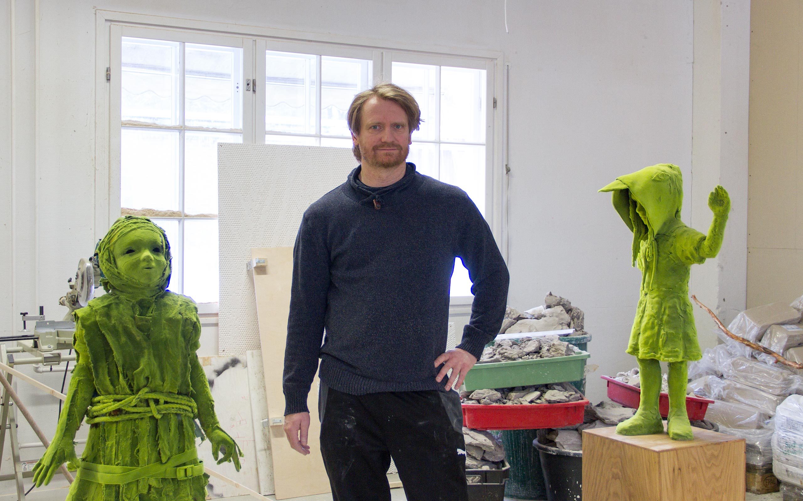 With references to fairytale characters, manga films and computer games, Kim Simonsson’ sculptures are very distinctive. His dreamy figures are a touch menacing, yet simultaneously fragile and frail. They all share an appearance that is solitary and a little sad, tinged with a sense of uncertainty or uneasiness that is stirred among the viewer. Who are they, and where are they going?