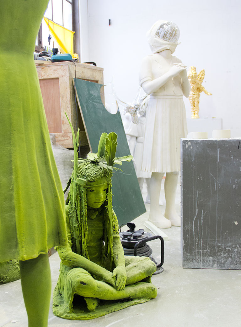 Indeed many people associate them with the forest and they are often referred to as “Moss People”. The process how they came into being was an accidental one. In 2012 I purchased a flocking machine, which works with electrostatic nylon fibers. The green and the association with the forest was actually not intended. I was working on a rabbit-like sculpture which I had coated with black paint, but wasn’t convinced of the result. I coated it with neon-yellow flocks and the way both colors reacted with each other produced this specific green. It took me a while to realize that this resembled moss, so I started to think about these new sculptures as forest creatures.