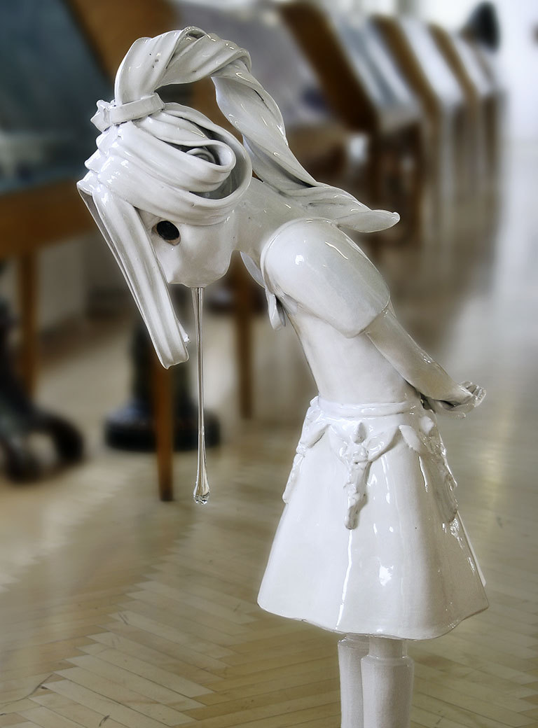 Initially, when I graduated, I had not been interested in manga or anime. When I was younger I was more impressed by European comics and particularly some Swedish ones. After graduating from university in 2000 I moved to Canada. During a residency in Toronto I had the chance to attend a guest lecture by Takashi Murakami at the Power Plant art museum. Back then he was not yet the superstar he is today. I became familiar with some of his earlier works, such as the Lonesome Cowboy and was fascinated with how he combined a notion of anarchy with craftsmanship. And I admired the simplicity that was inherent in his figuration. Next to my own studio was glass workshop, where I made a rebellious girl sculpture – a spitting girl of white-glazed ceramic with her spit being made of glass. It was a modern and irreverent interpretation of a Meissen figurine with a manga influence in its aesthetic. In principle I was doing the same thing as with the shitting dog. But the glass spit was so beautiful and everybody loved it, so I stopped making animals and starting making children.